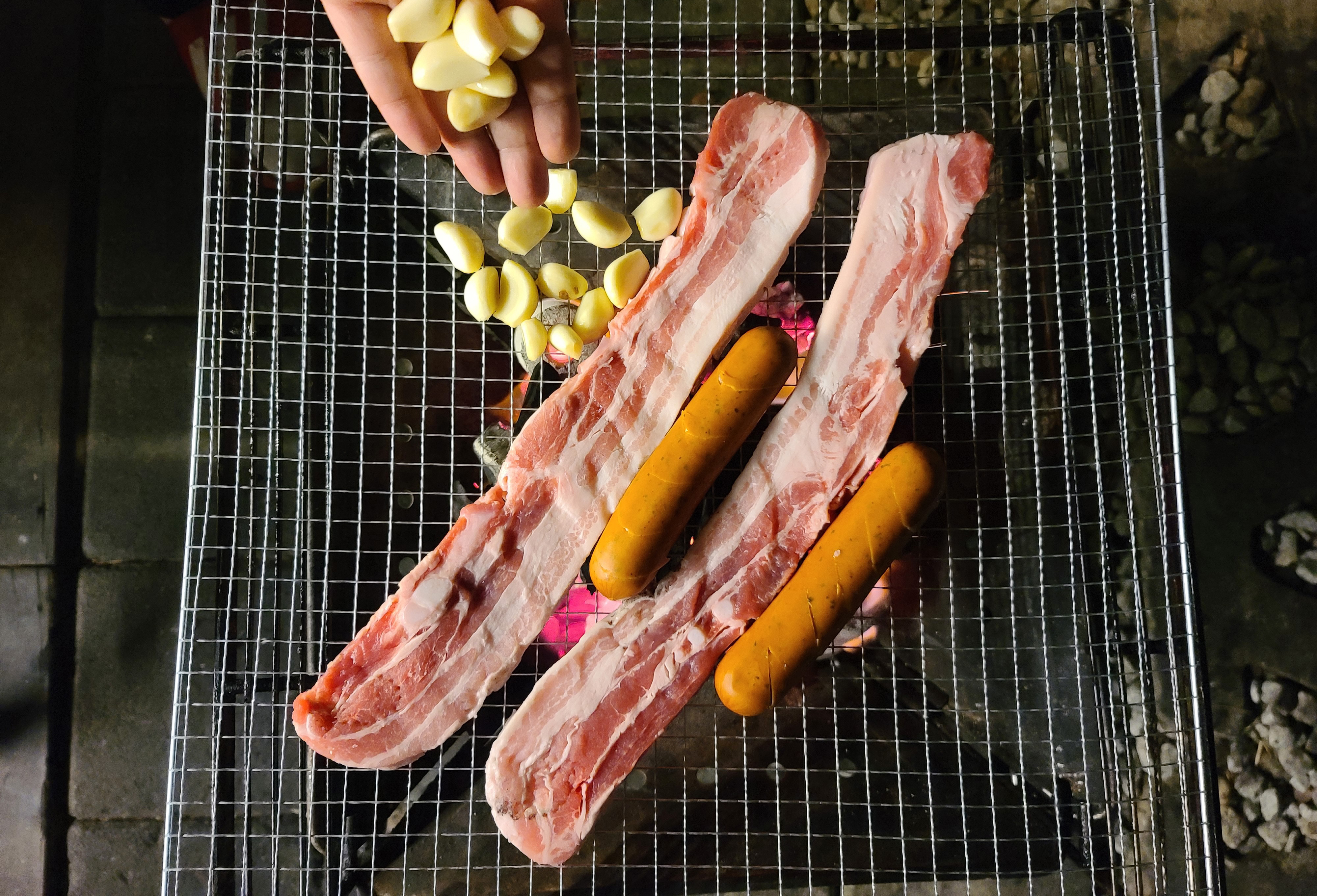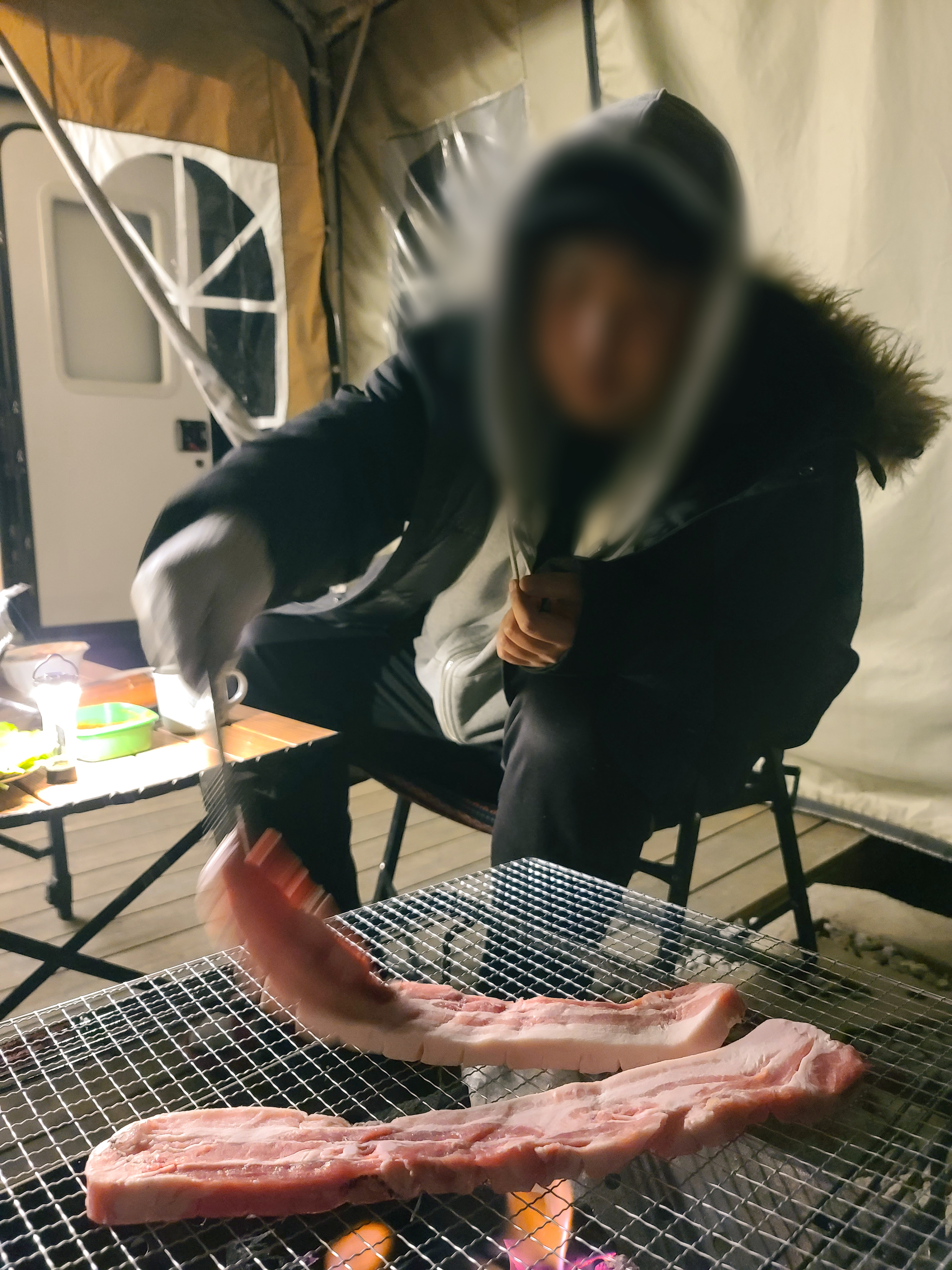 강화캠핑파크 캠핑장 내 매점에도 부식물이 있었지만, 상하기 쉬운 식품은 판매하고 있지 않아서 인근 마트에서 고기, 깻잎, 마늘, 소시지, 햇반 등을 사 왔습니다. 먼저 숯불에 고기를 올려 구워주었습니다. 삼겹살은 어떻게 구워 먹어도 맛있는데, 아무래도 캠핑하면서 숯불에 구워 먹는 게 가장 맛있는 것 같습니다.