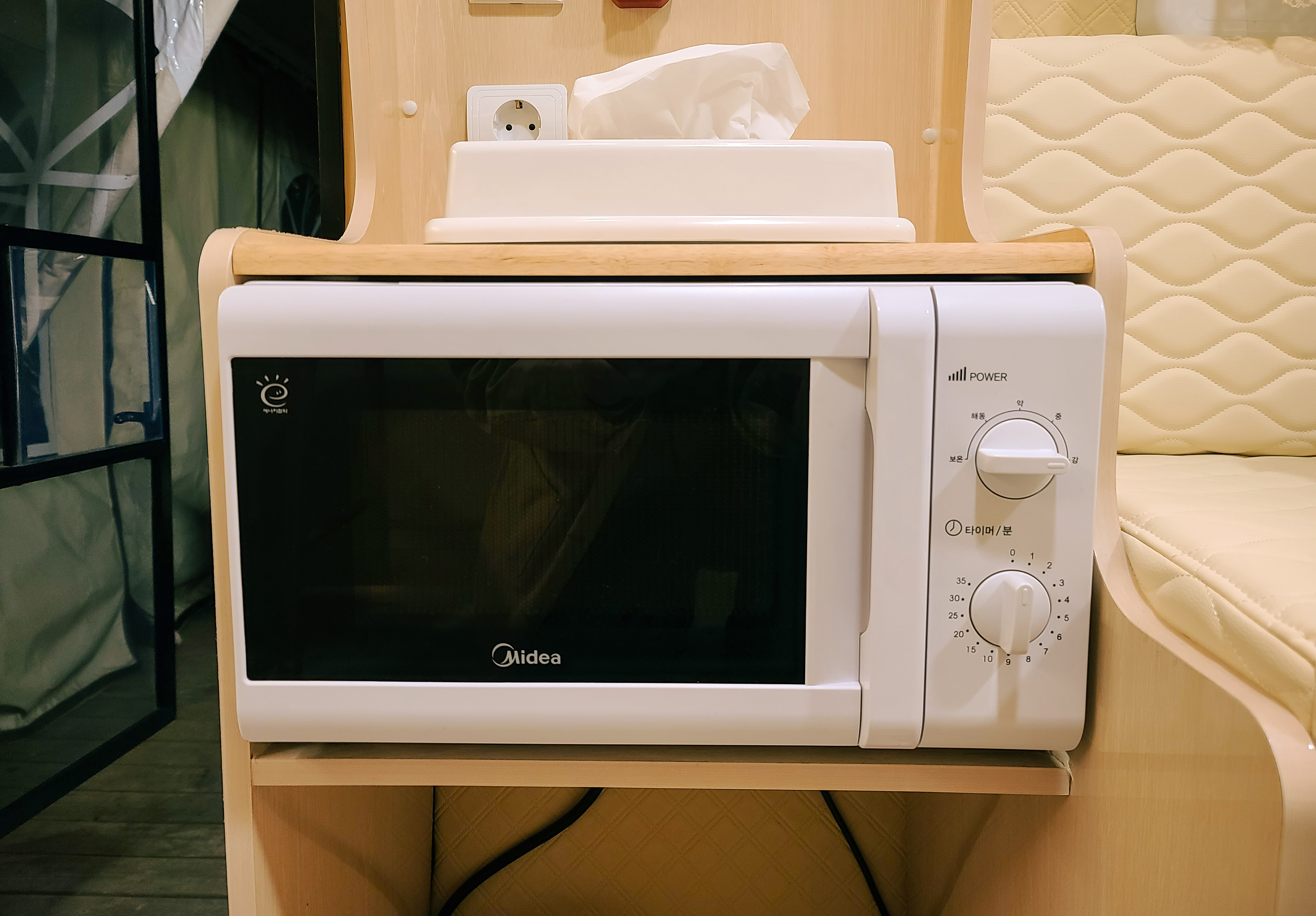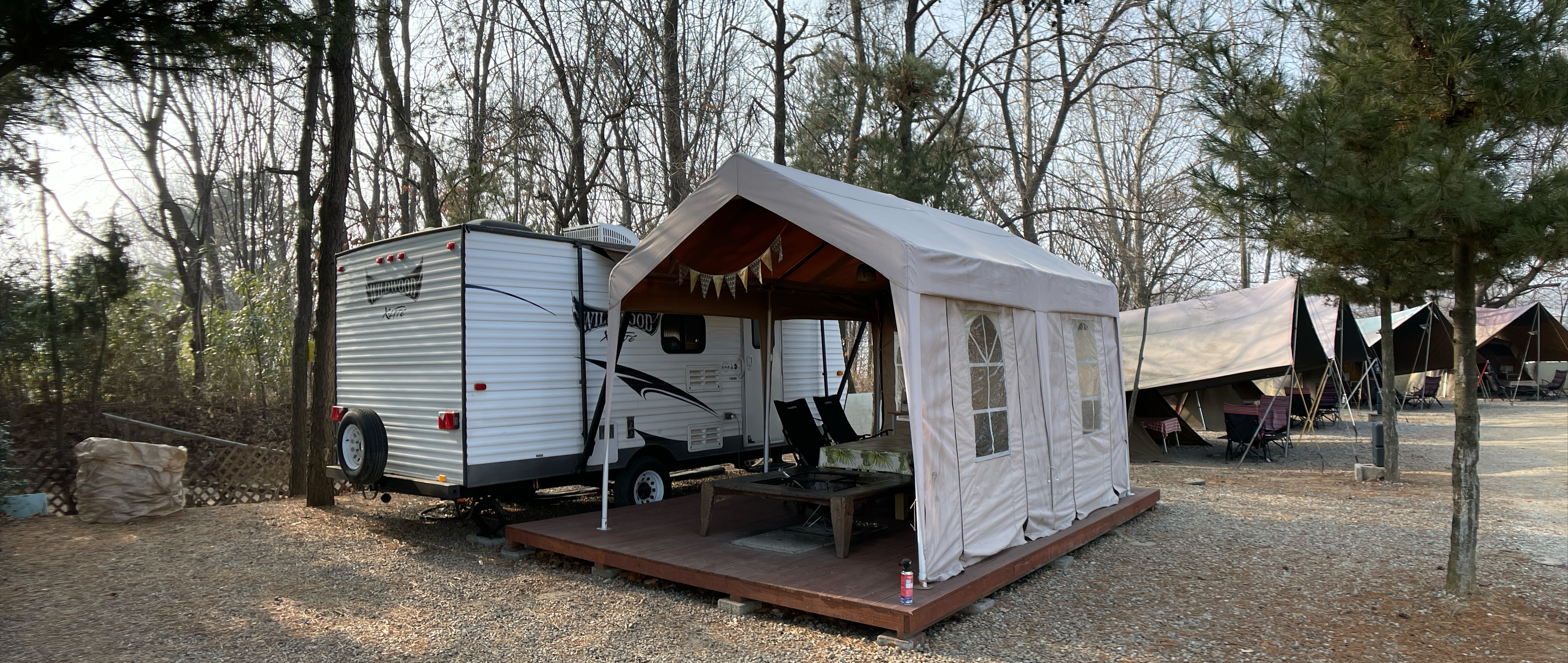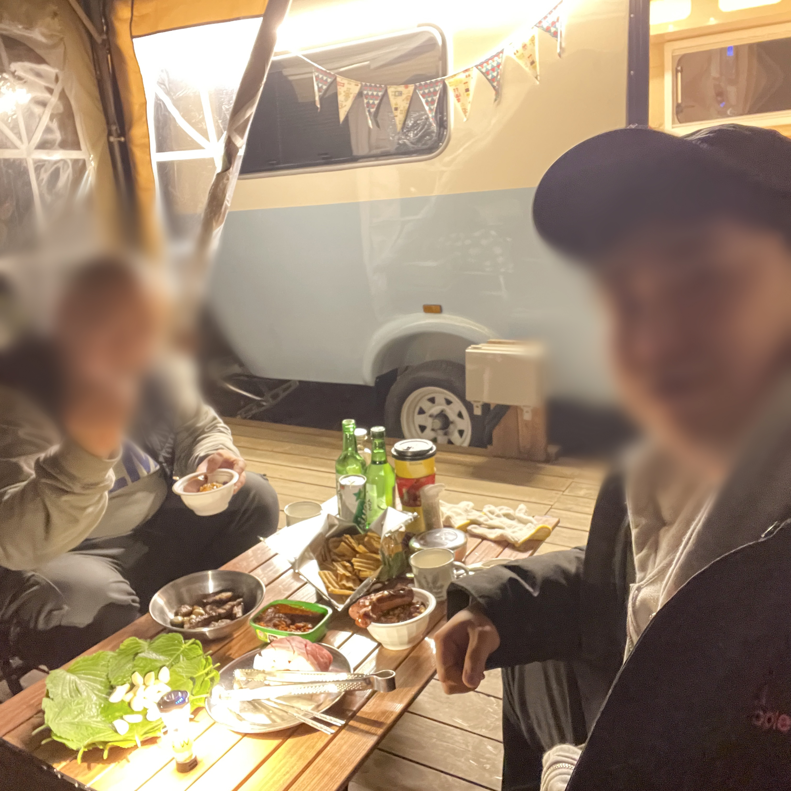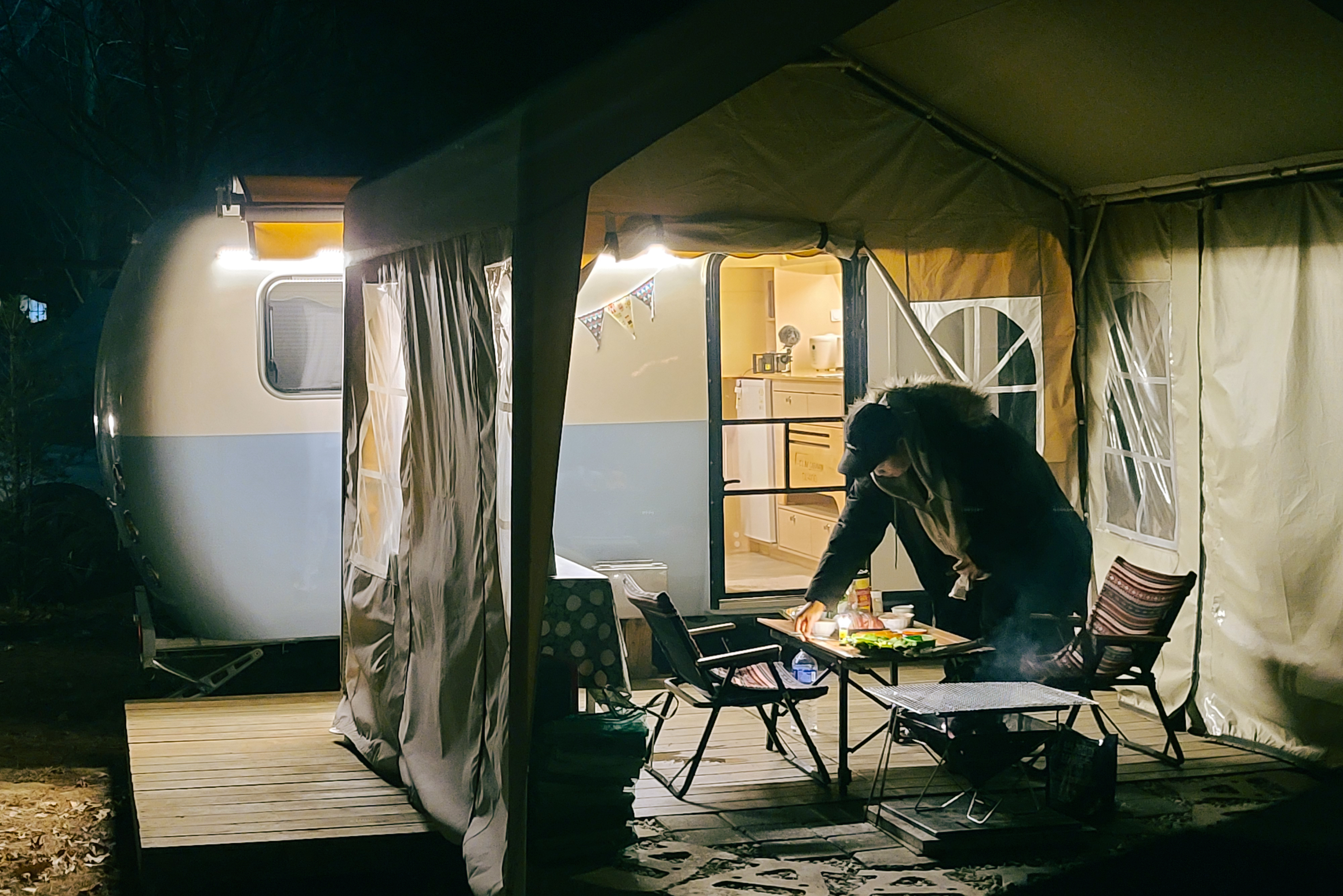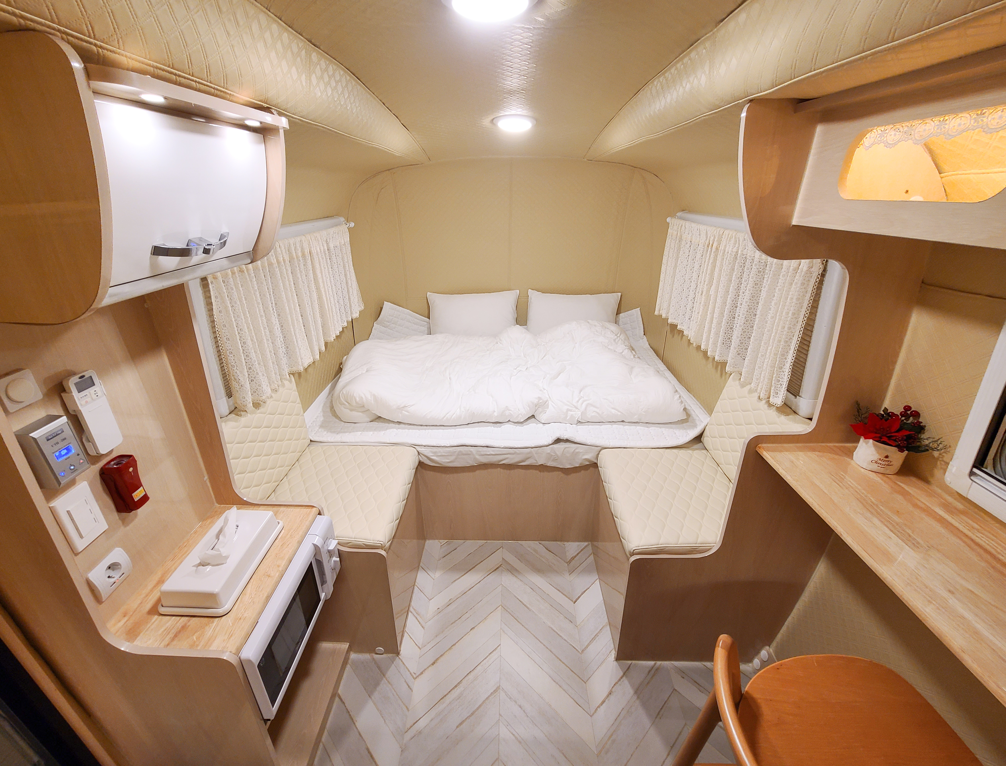 사실 저는 카라반 캠핑을 해보고 싶었는데, 이번에 사장님께서 특별히 빈 카라반이 있다고 해서 카라반으로 이용해볼 수 있었습니다. 카라반 역시 인디언 텐트처럼 앞에 테이블과 의자, 화로대와 간단한 조리시설이 갖춰져 있었습니다. 카라반 내에는 소형 냉장고와 냉・온풍기, 밥솥, 커피포트 그리고 수건과 칫솔 등이 구비되어 있었습니다. 침대는 큰 것은 아니지만 2인이 사용할 수 있는 사이즈였습니다.