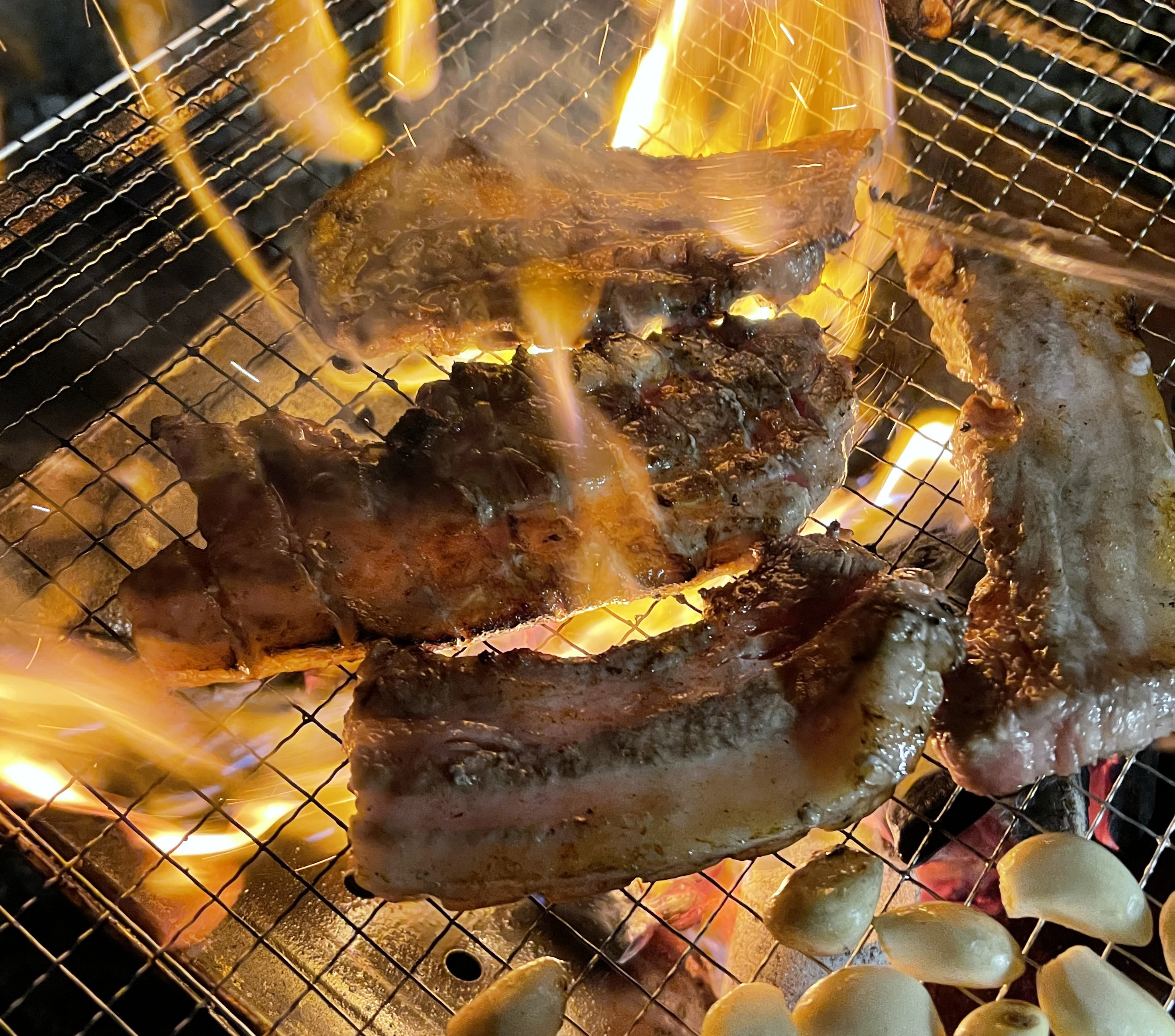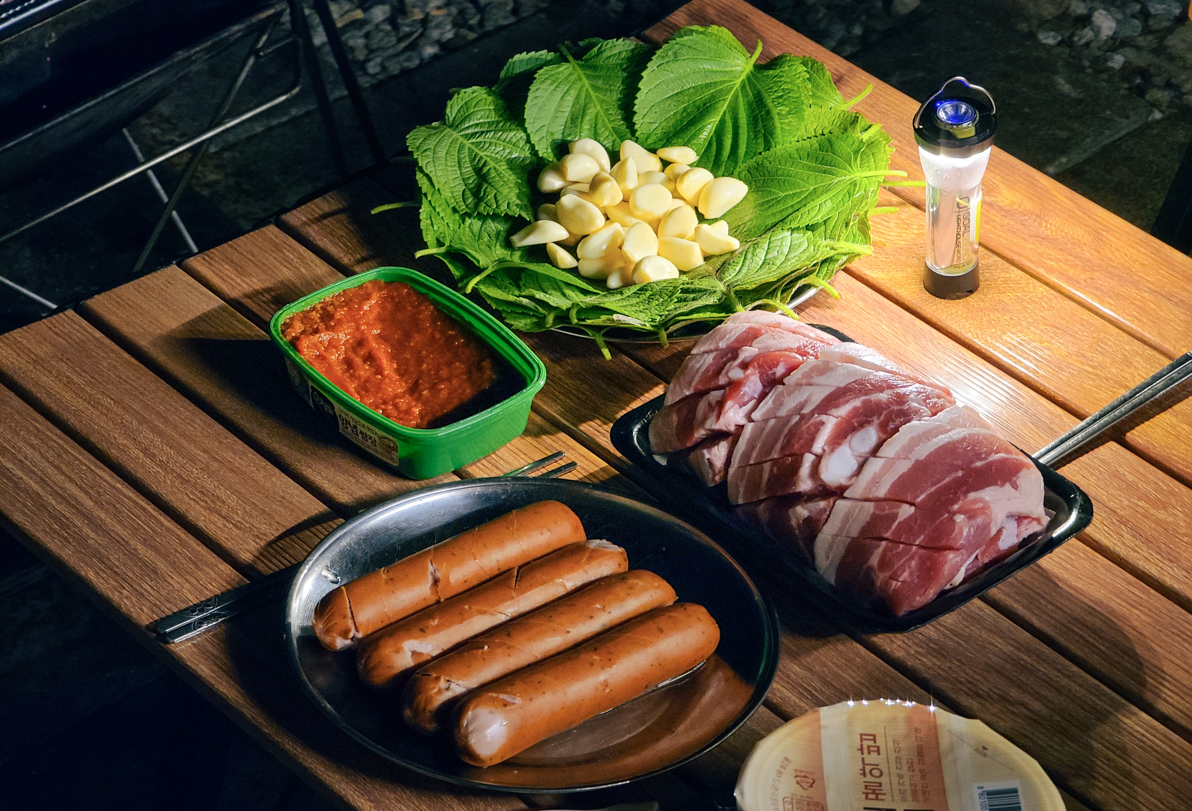 강화캠핑파크 캠핑장 내 매점에도 부식물이 있었지만, 상하기 쉬운 식품은 판매하고 있지 않아서 인근 마트에서 고기, 깻잎, 마늘, 소시지, 햇반 등을 사 왔습니다. 먼저 숯불에 고기를 올려 구워주었습니다. 삼겹살은 어떻게 구워 먹어도 맛있는데, 아무래도 캠핑하면서 숯불에 구워 먹는 게 가장 맛있는 것 같습니다.