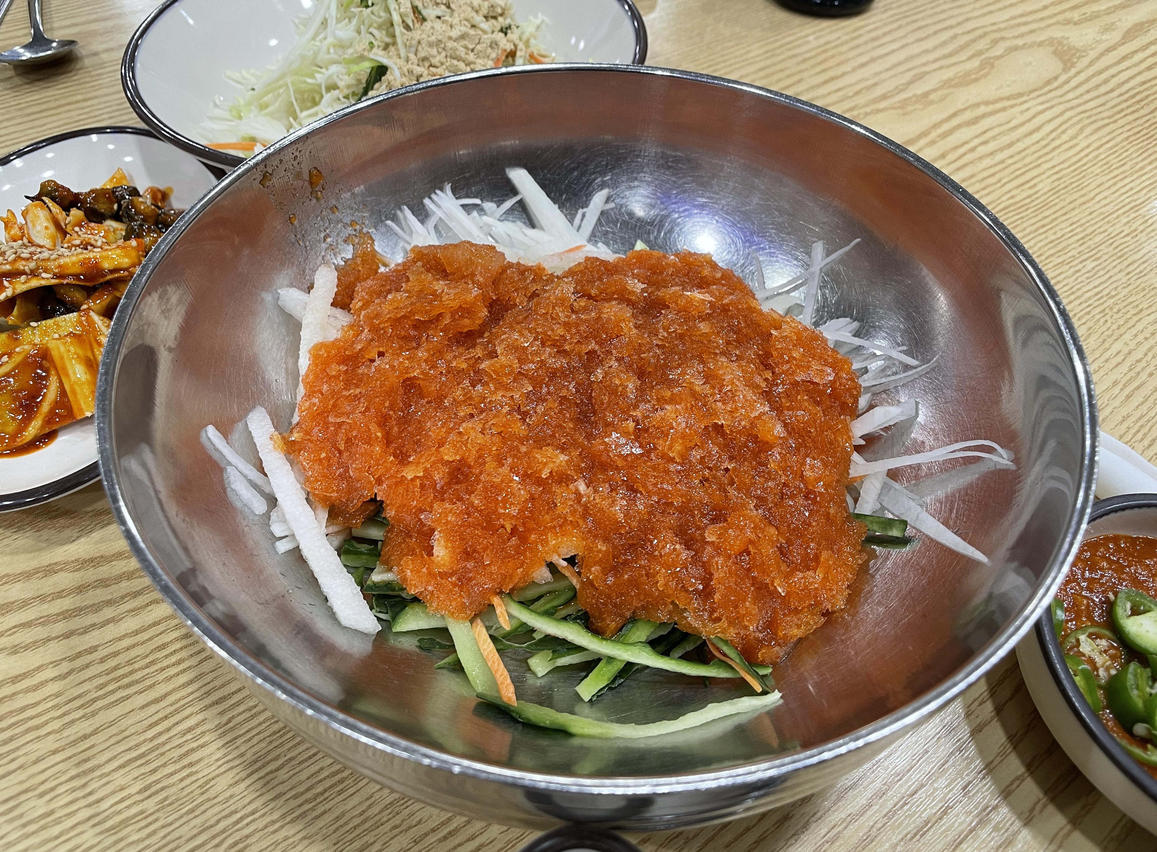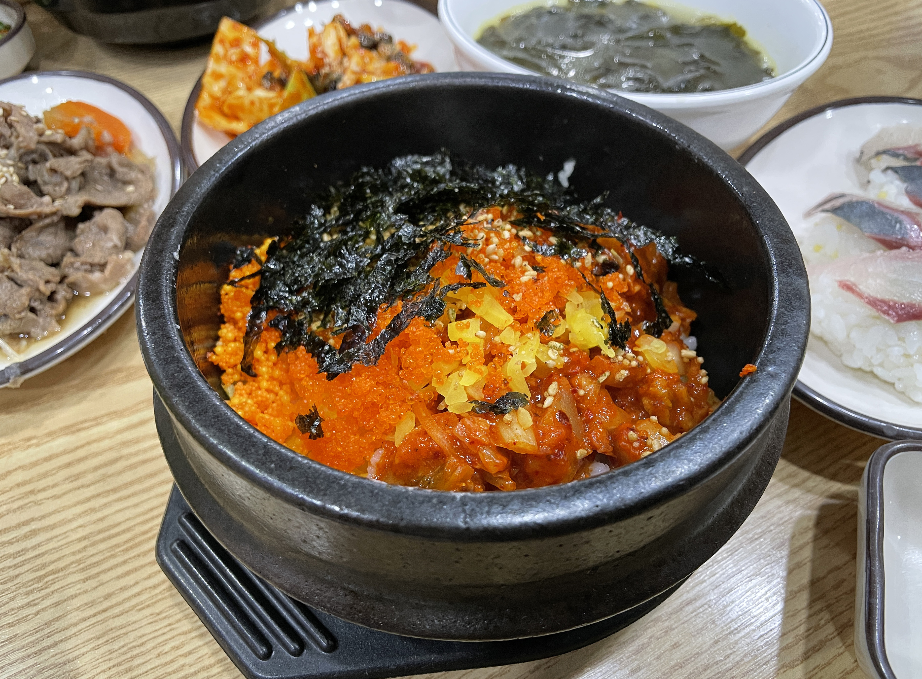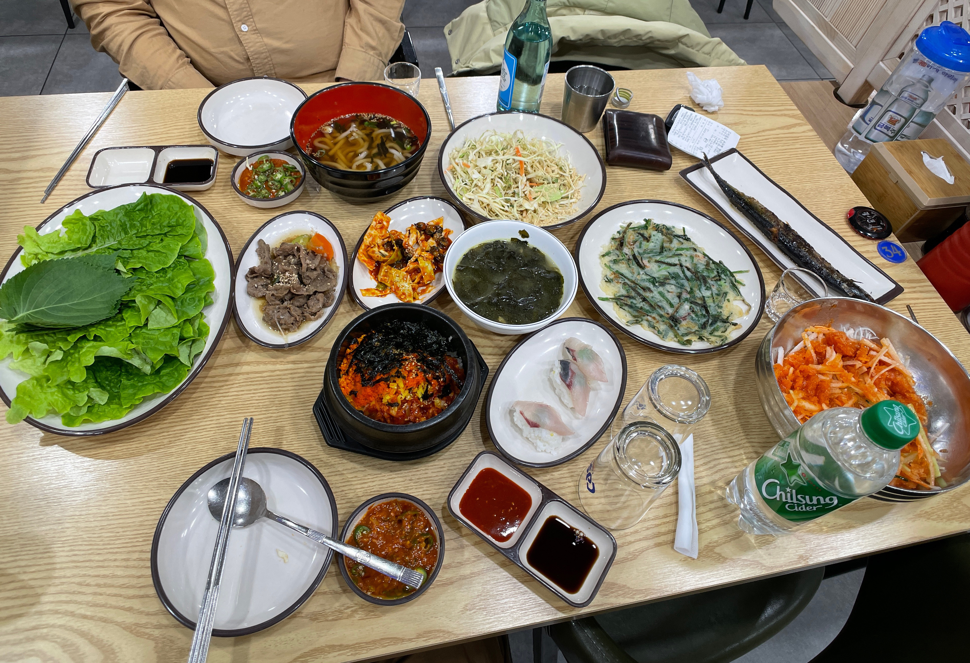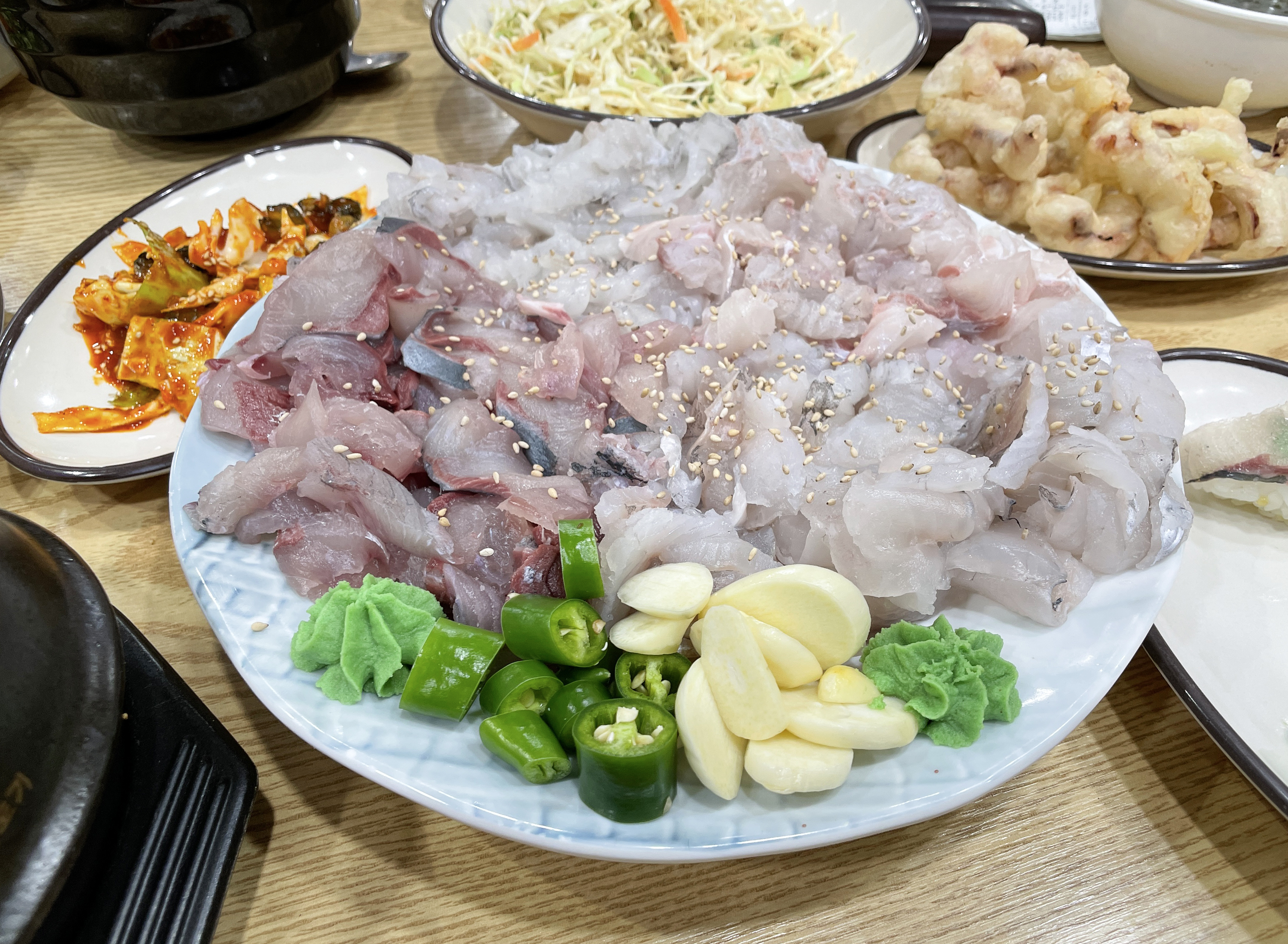 일단 물회 재료를 포함 골뱅이무침, 알밥, 불고기, 초밥, 파전, 우동, 미역국, 꽁치 등이 나왔습니다. 일단 이 사이드 메뉴들도 꽤 잘 나왔는데, 맛이 뛰어나다고 보기엔 어려웠지만, 그래도 먹을 만은 했고 고추냉이는 너무 매워서 코가 찌릿하더라고요.
