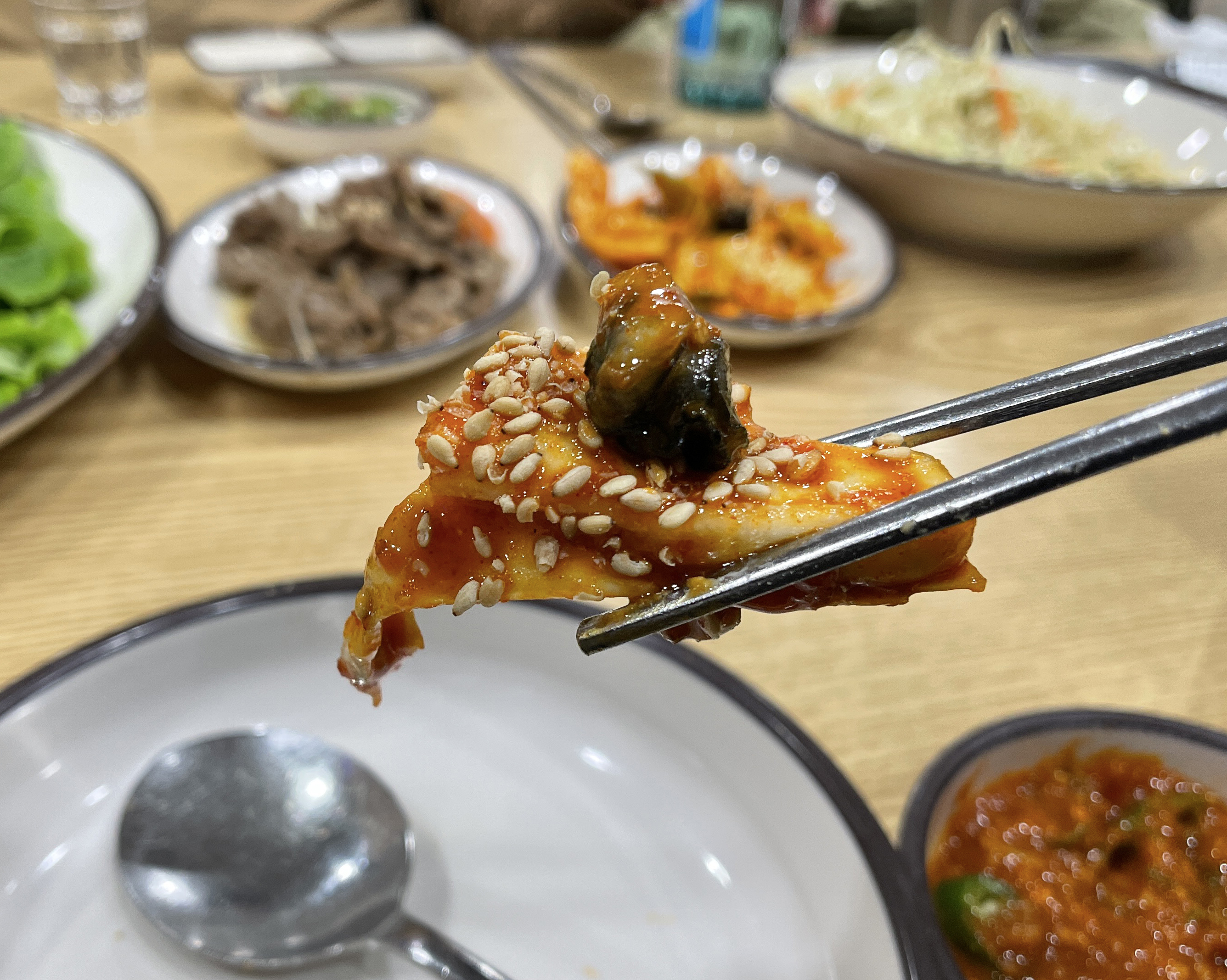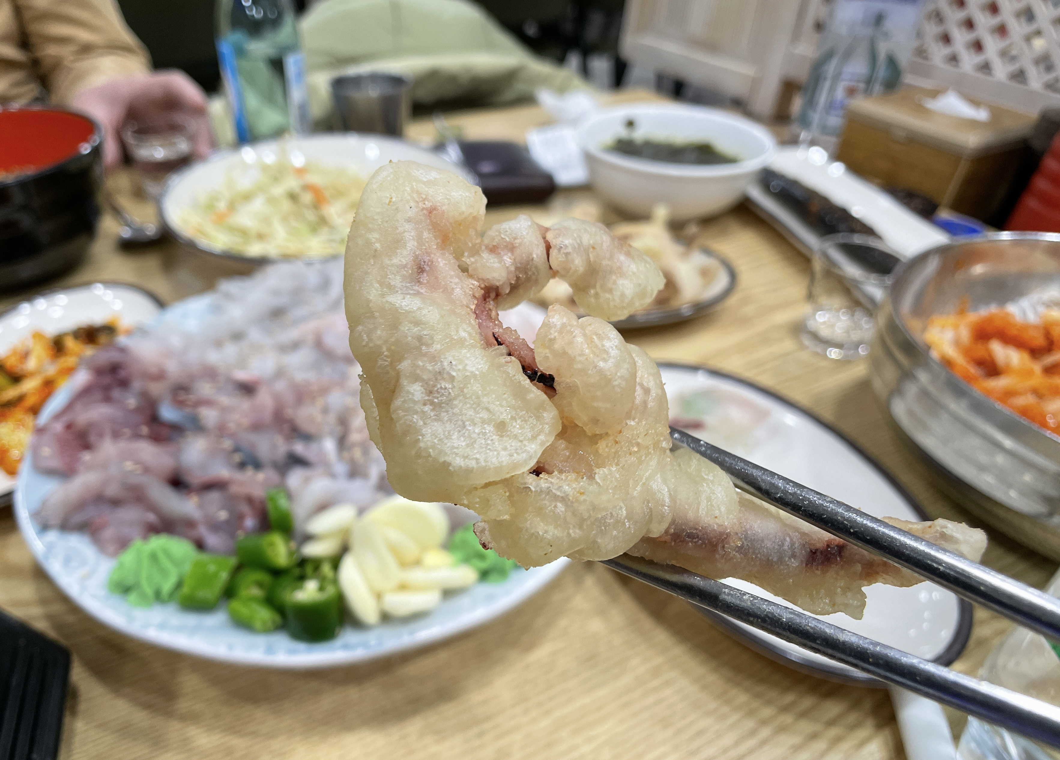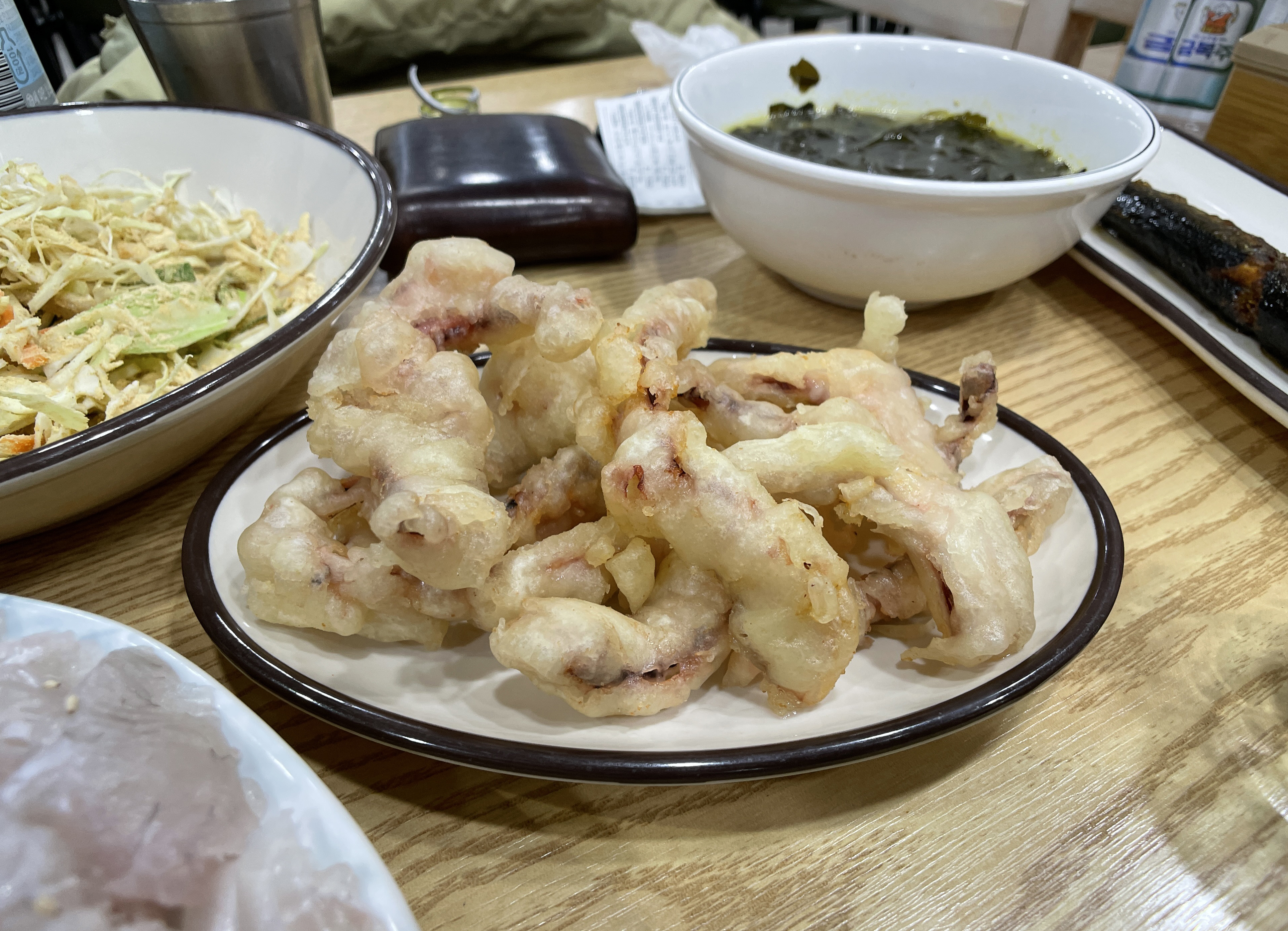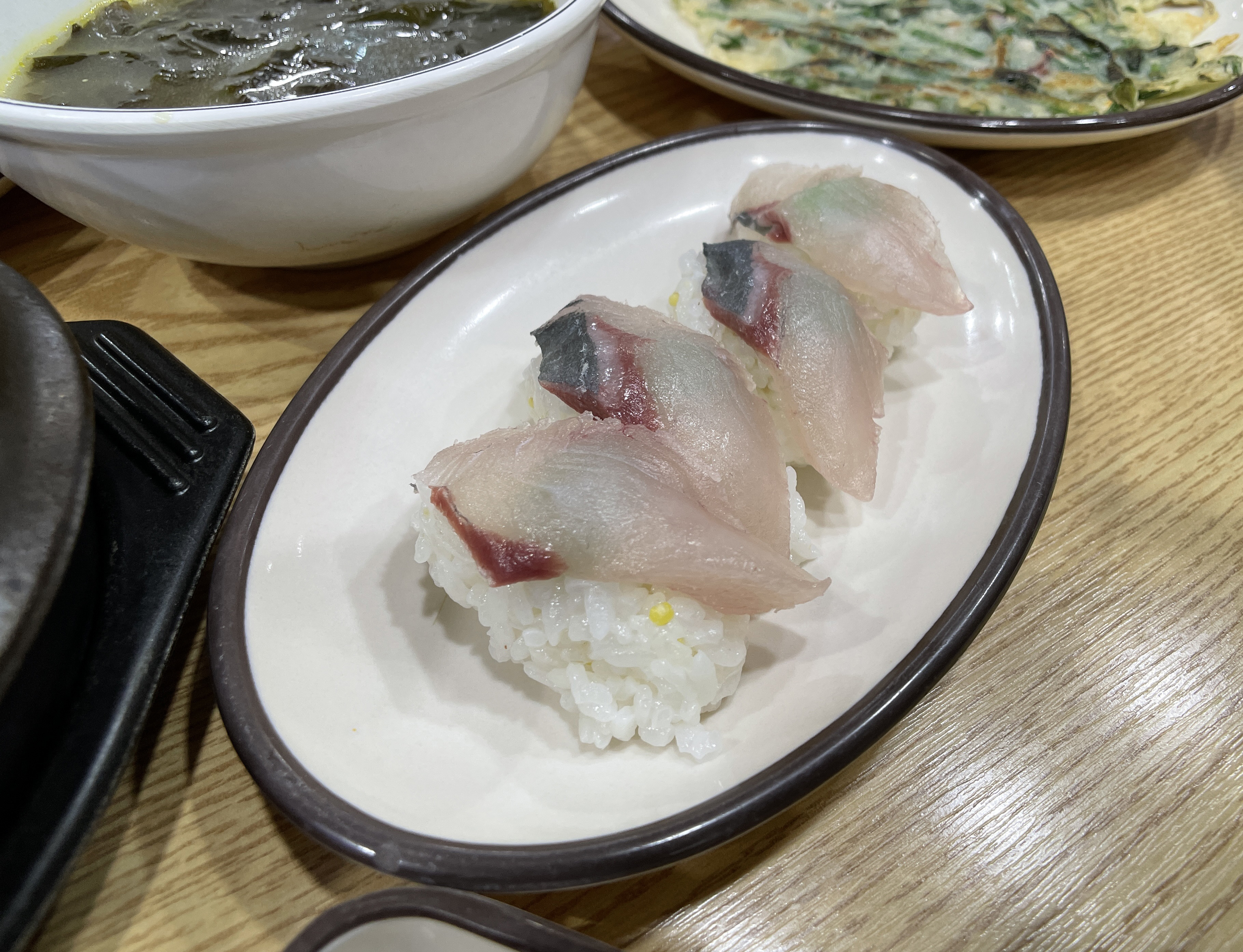 일단 물회 재료를 포함 골뱅이무침, 알밥, 불고기, 초밥, 파전, 우동, 미역국, 꽁치 등이 나왔습니다. 일단 이 사이드 메뉴들도 꽤 잘 나왔는데, 맛이 뛰어나다고 보기엔 어려웠지만, 그래도 먹을 만은 했고 고추냉이는 너무 매워서 코가 찌릿하더라고요.