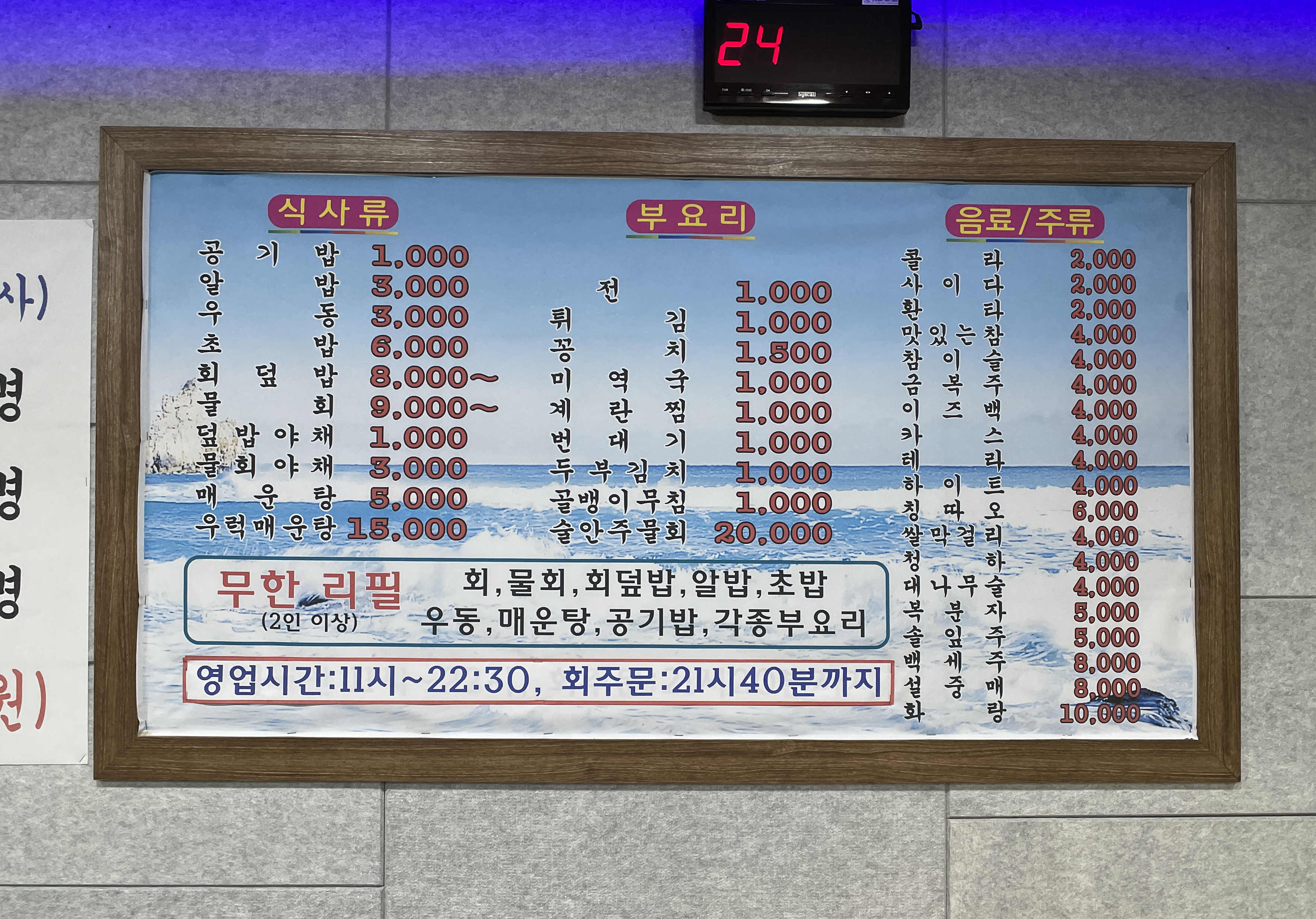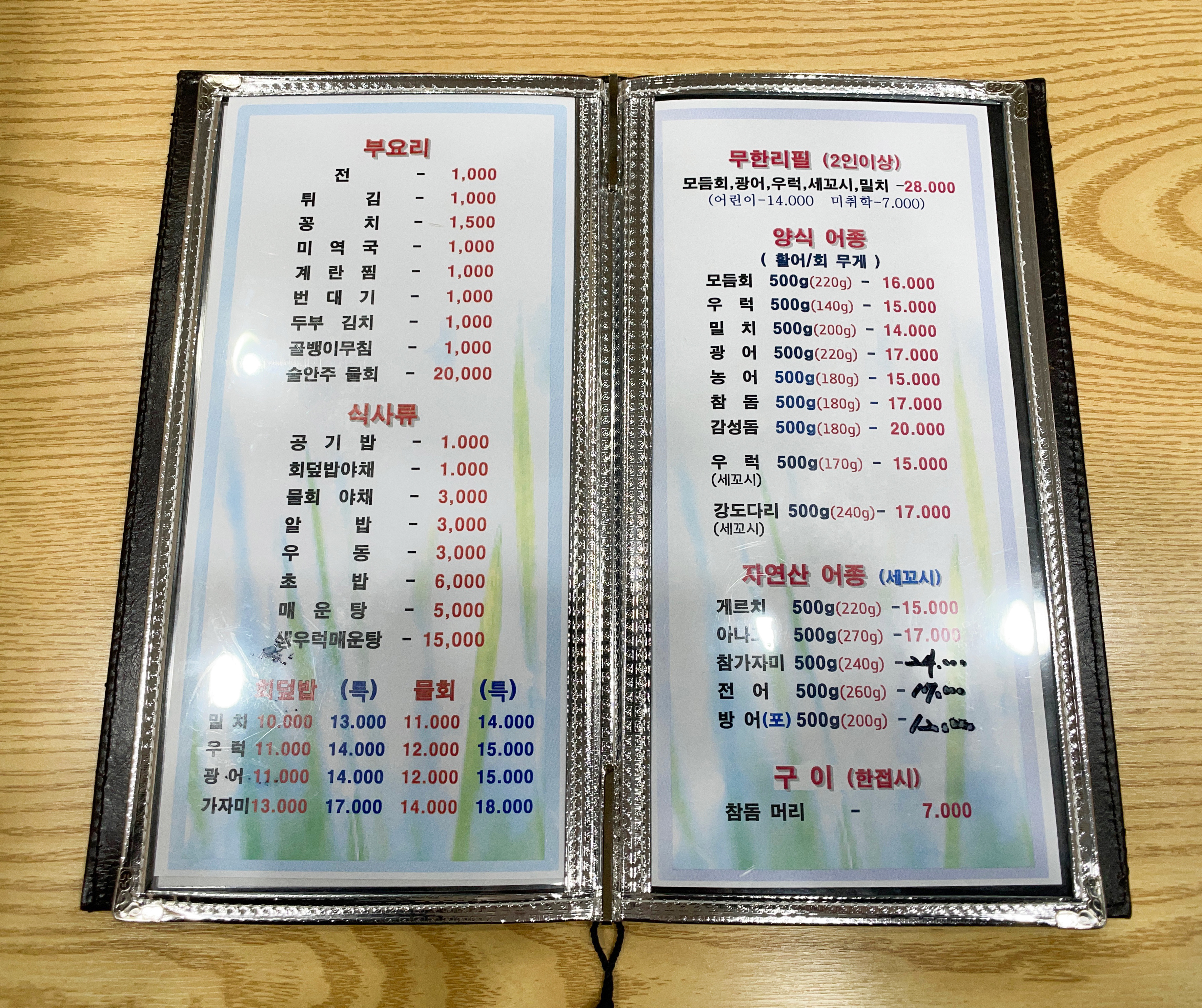 일출수산 가게의 메뉴는 모듬회, 우럭, 밀치, 광어, 농어, 참돔, 감성돔, 세꼬시, 게르치, 아나고, 참가자미, 전어, 방어, 전, 튀김, 꽁치, 미역국, 계란찜, 번데기, 두부김치, 골뱅이무침, 물회, 회덮밥, 알밥, 우동, 초밥, 매운탕 등이 있었습니다. 저희가 주문한 무한리필 메뉴는 메뉴에 보이는 대부분의 부요리와 식사류를 포함 회와 세꼬시를 제공하고 있었습니다.