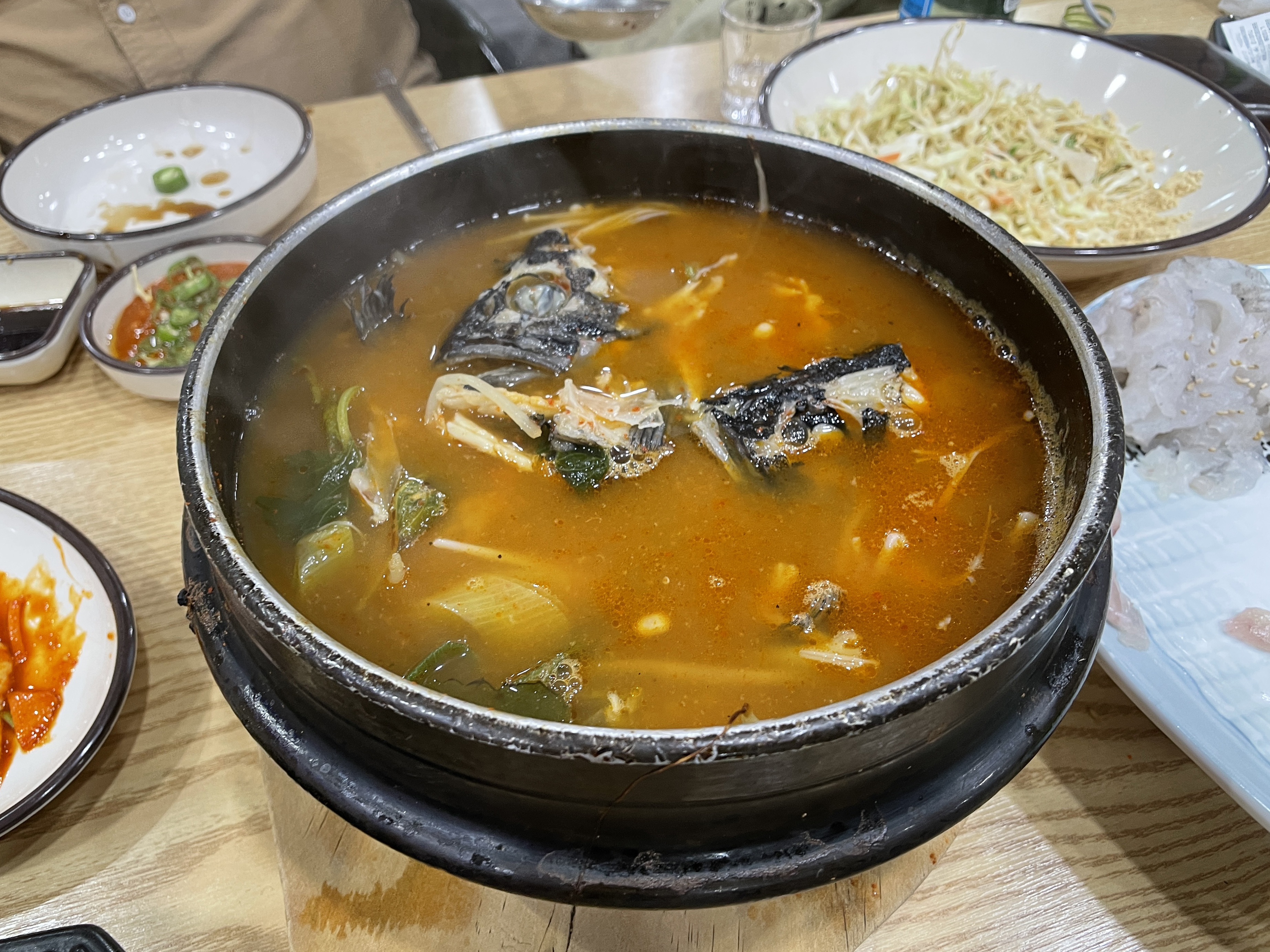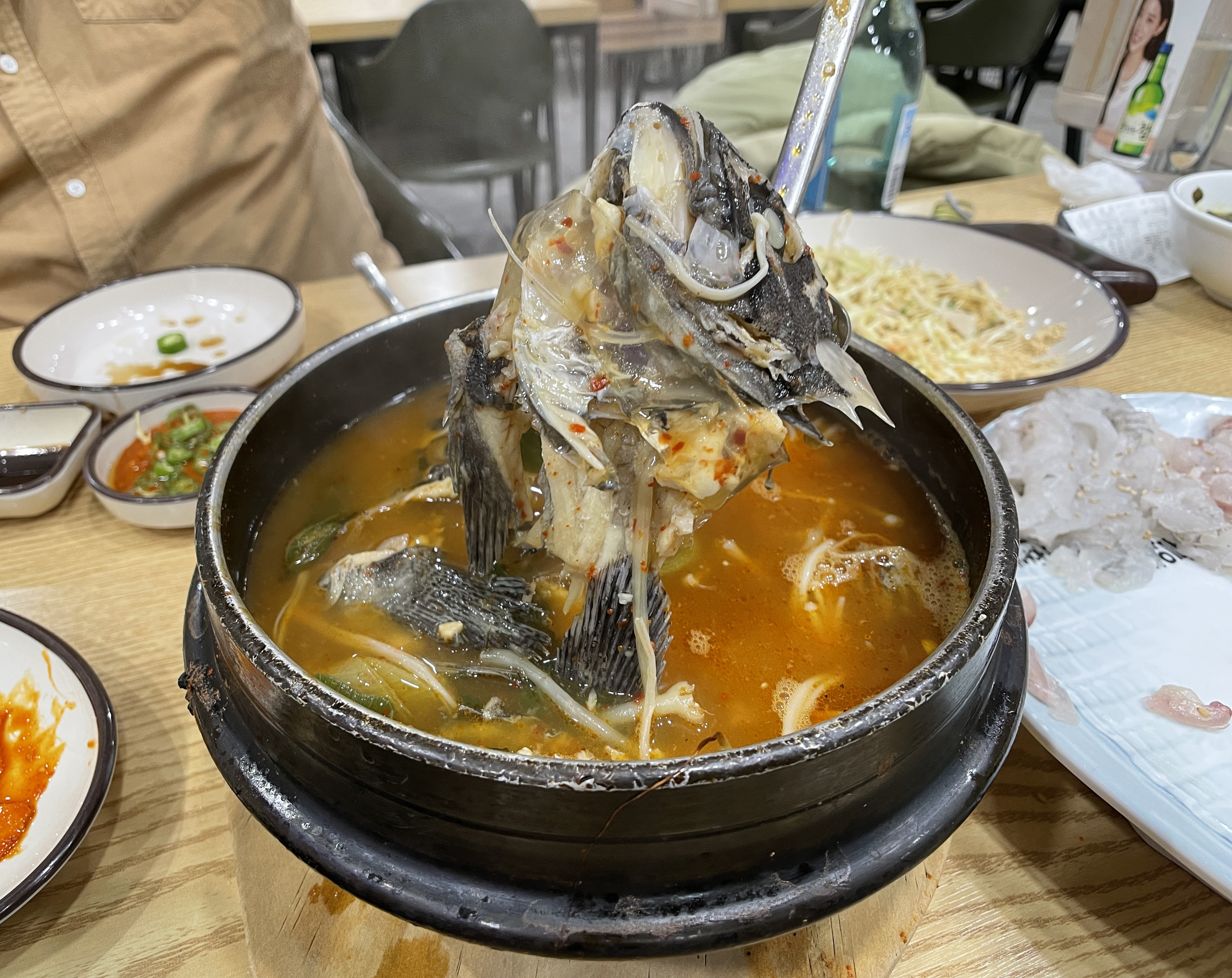 끝으로 매운탕도 먹었는데, 매운탕은 제가 원하는 스타일의 시원한 국물보다는 조금 묽은 느낌의 국물이었습니다. 아무래도 사이드 메뉴도 많이 나오고 횟감도 넉넉히 나와서 더 리필할 필요가 없었습니다. 물론 저보다 식사량이 많은 분이라면 원하는 만큼 리필해서 식사하실 수도 있을 것 같아요. 무한리필 횟집은 처음 이용해보는데 나름 이색적이고 만족스러웠습니다.