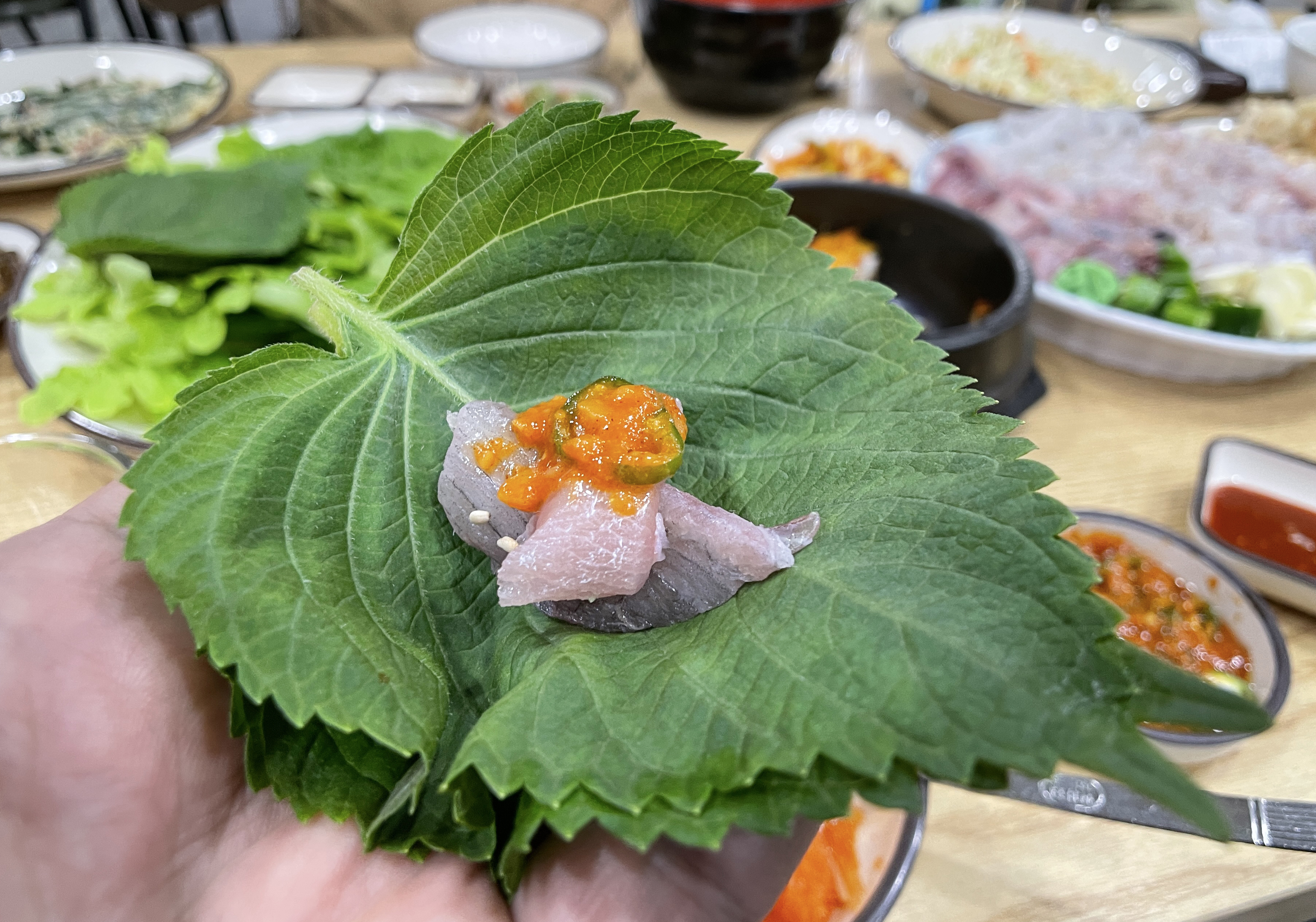 알밥과 초밥, 샐러드 등을 곁들이고 있을 때 기다리던 횟감이 나왔습니다. 횟감은 신선하고 식감이 쫀득거리며 맛있었습니다. 부드러운 횟감은 물회로 먹어도 맛있었고, 그냥 횟감 자체로도 맛있었습니다.
