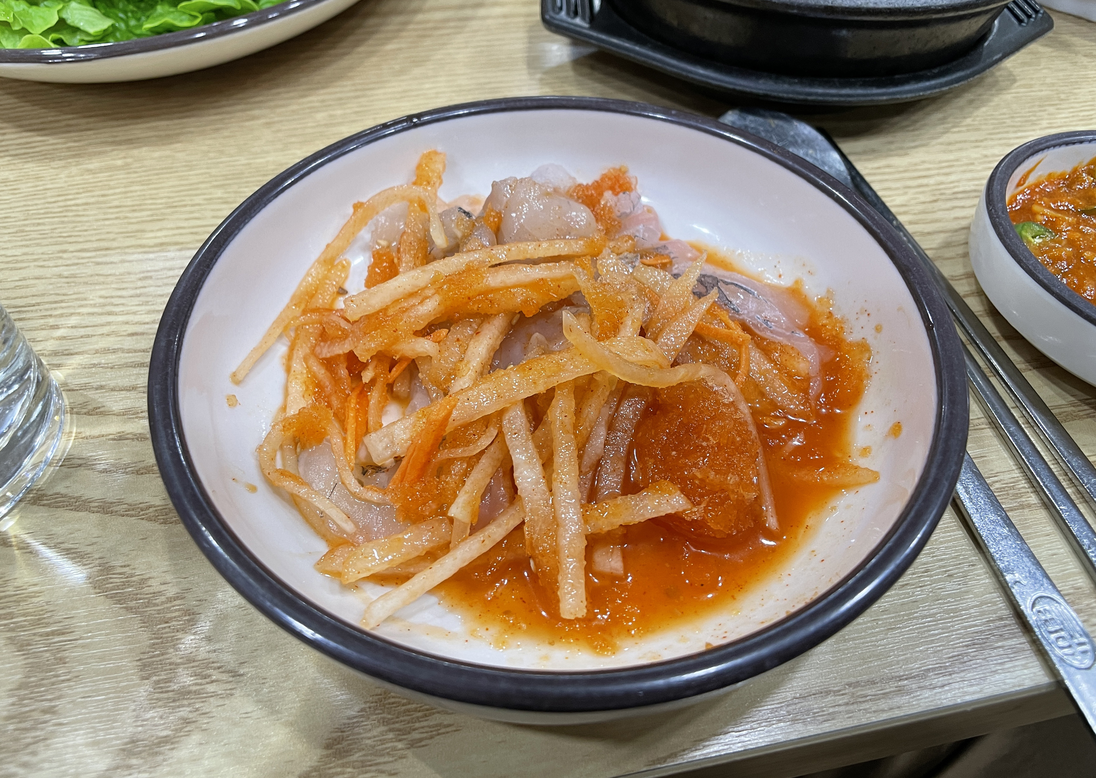 일단 물회 재료를 포함 골뱅이무침, 알밥, 불고기, 초밥, 파전, 우동, 미역국, 꽁치 등이 나왔습니다. 일단 이 사이드 메뉴들도 꽤 잘 나왔는데, 맛이 뛰어나다고 보기엔 어려웠지만, 그래도 먹을 만은 했고 고추냉이는 너무 매워서 코가 찌릿하더라고요.