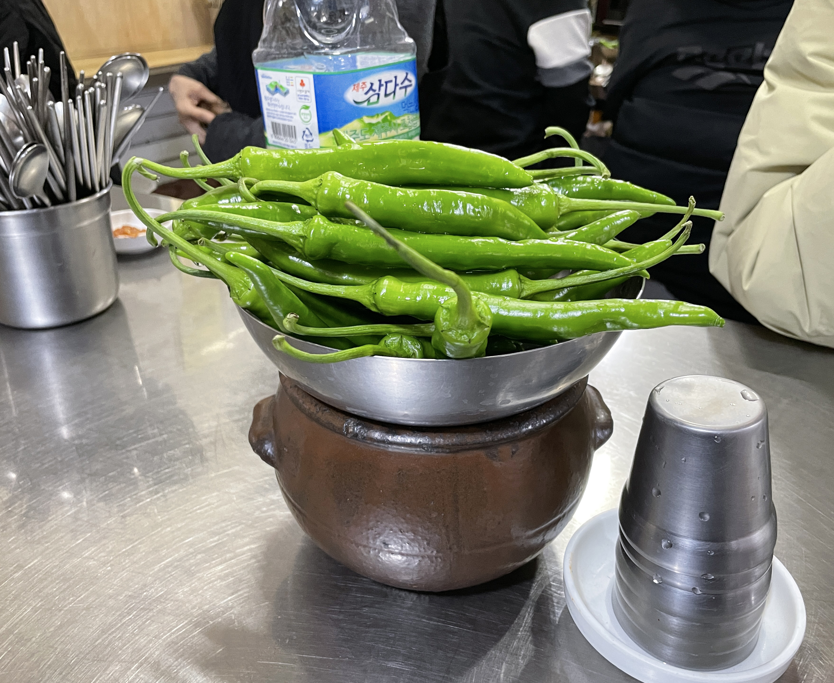 이 날 처음으로 간 곳은 간판은 없고, 현수막으로 '찹쌀수제비, 칼국수 전문점'이라고 적혀있는 장소였습니다. 가게에는 길다란 테이블에 손님들이 마주보고 식사하도록 되어있었고, 중간중간에 물통과 청양고추, 양념장, 수저통이 있었습니다.