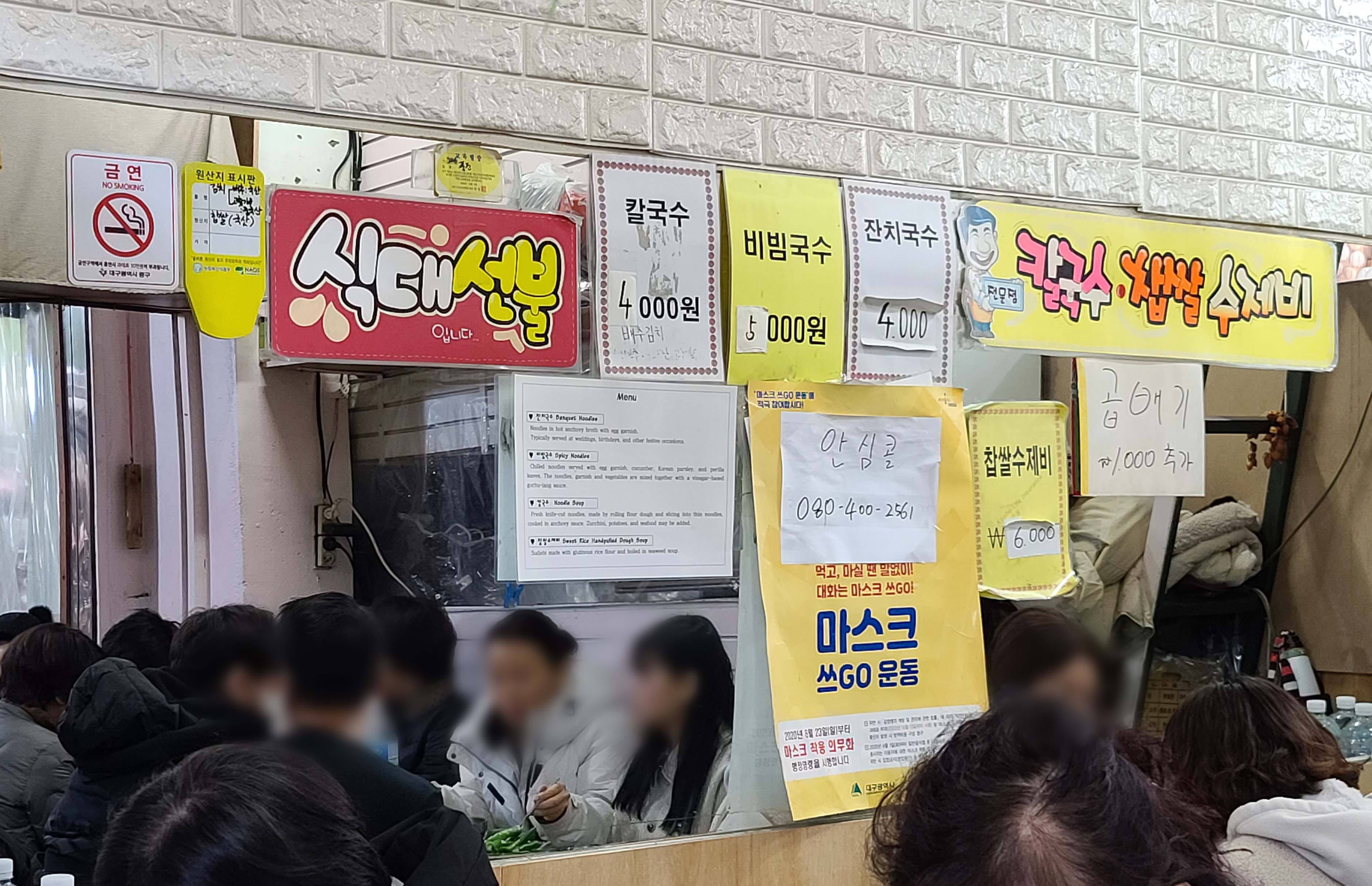 서문시장 찹쌀수제비 가게의 메뉴는 칼국수, 비빔국수, 잔치국수, 찹쌀수제비가 있었고 식대는 선불로 받고 있었습니다. 저희는 전통시장 상품권이 있어서 상품권으로 결제를 하고 식사했습니다. 친구와 저는 찹쌀수제비와 칼국수를 주문했습니다.