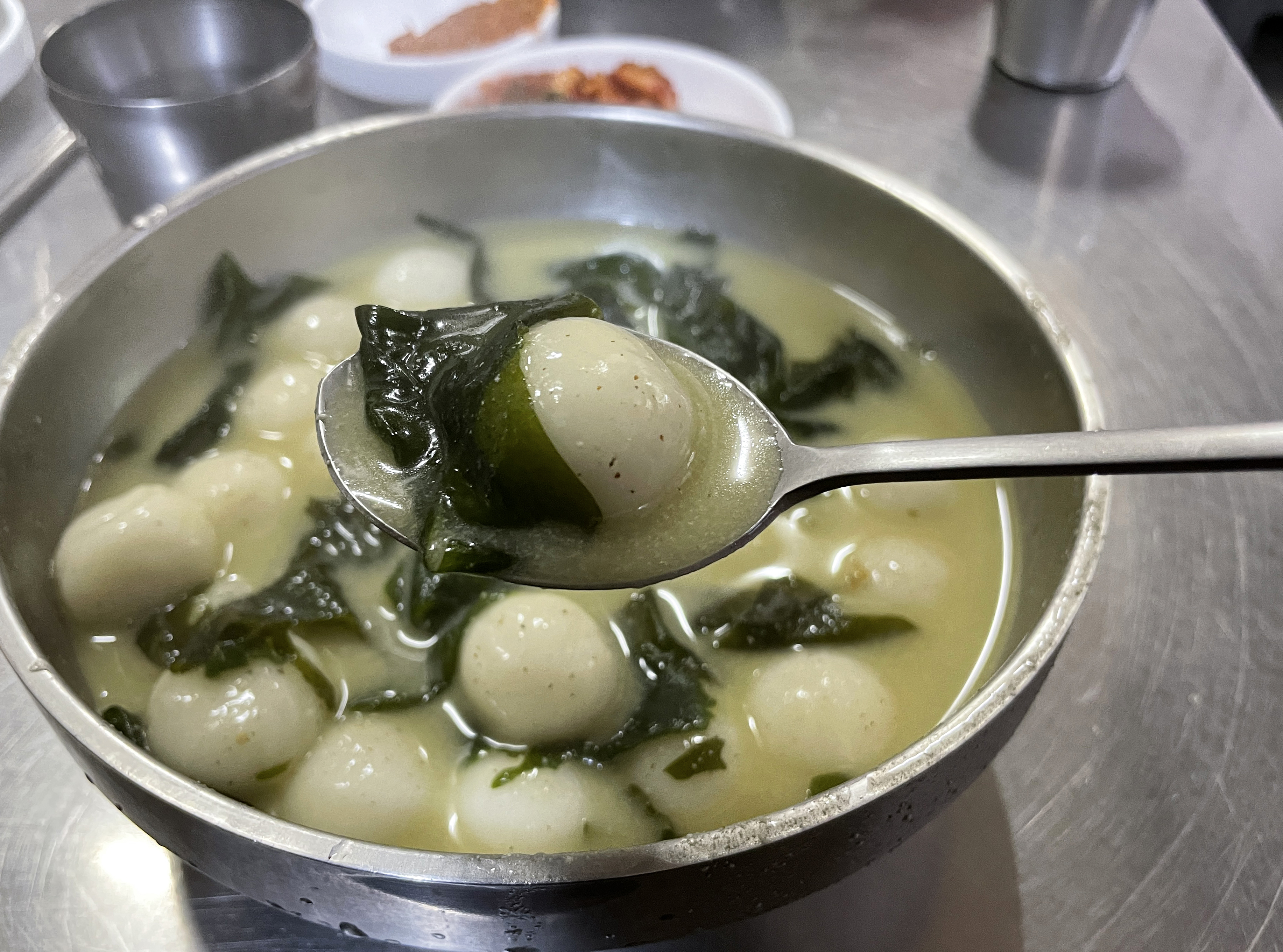 제가 먹은 서문시장의 찹쌀수제비는 들깨미역국에 옹심이가 들어간 메뉴였고, 찹쌀 옹심이는 뜨거웠지만 쫀득쫀득 마쉬멜로우 같은 식감이 재밌더라고요. 양도 제법 있어서 은근히 배불리 먹었고요.