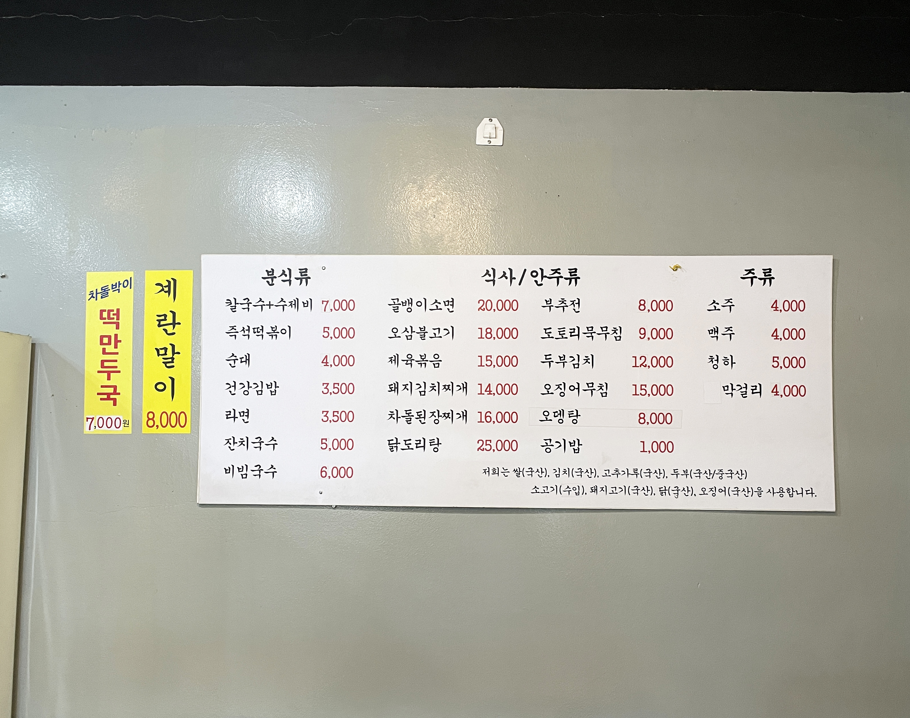 칼국수도 깔끔 담백 맛있었고요, 가게 사장님도 친절하셔서 기분 좋게 식사할 수 있었습니다. 솔직히 칼국수에 겉절이를 기대했지만, 익은 김치가 나와서 아쉬웠지만 라면이랑 같이 곁들인다면 맛있을 것 같더라고요. 겉보기에 허름해 보이는 가게이지만 국산 재료들을 이용한 메뉴들을 판매하는 가게로 가성비 괜찮은 식당이었습니다.