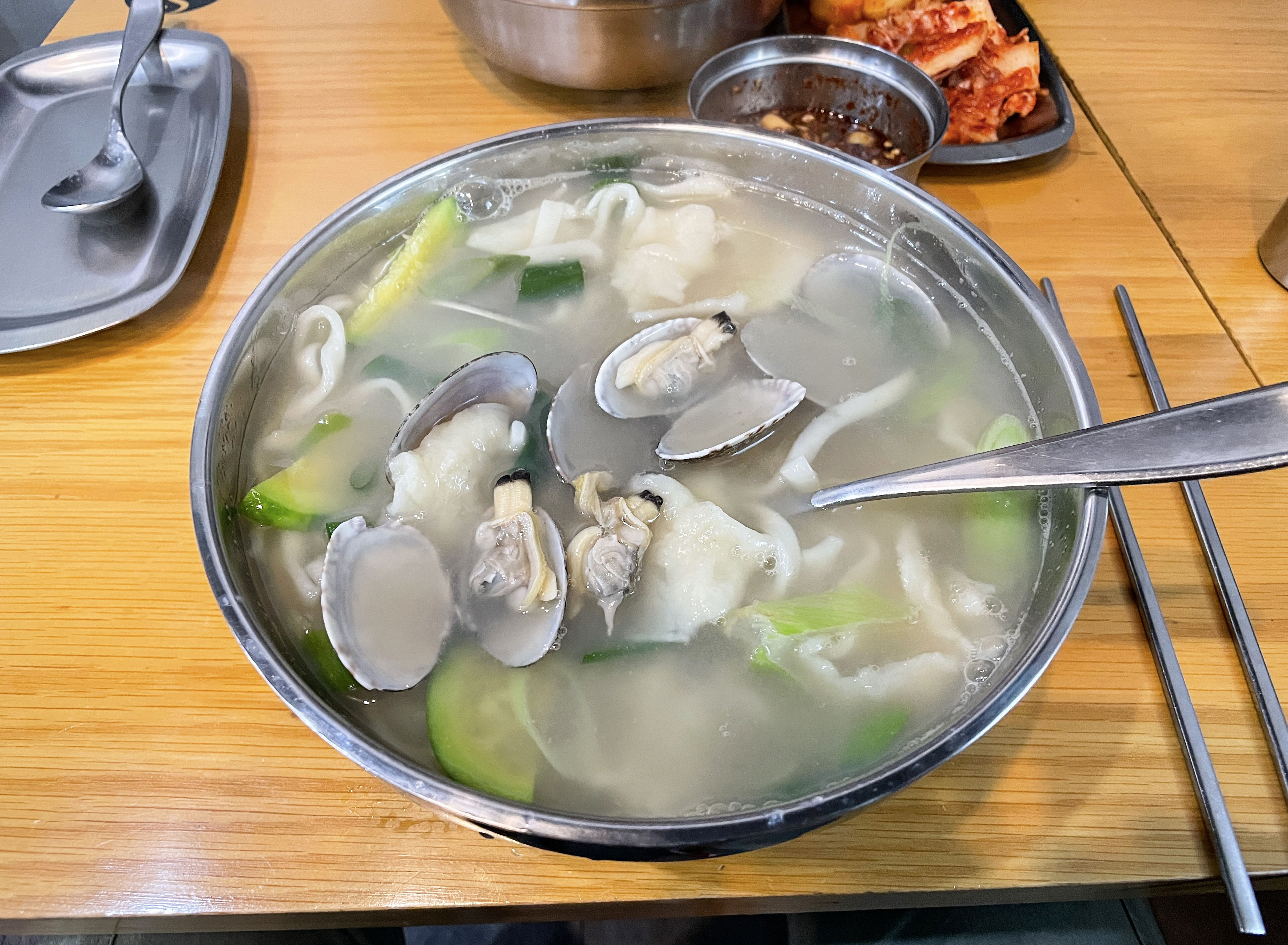 저희는 칼제비를 주문했습니다. 칼국수와 수제비를 같이 주는 메뉴인데, 맑은 국물에 큼지막한 바지락들이 눈에 들어왔습니다. 국물에는 호박이나 대파 같은 채소가 들어있었습니다. 김치는 직접 담그신다고 하며, 보통 칼국수집에서 주시는 달달한 겉절이가 아닌 라면과 잘 어울릴 것 같은 익은 김치였습니다.