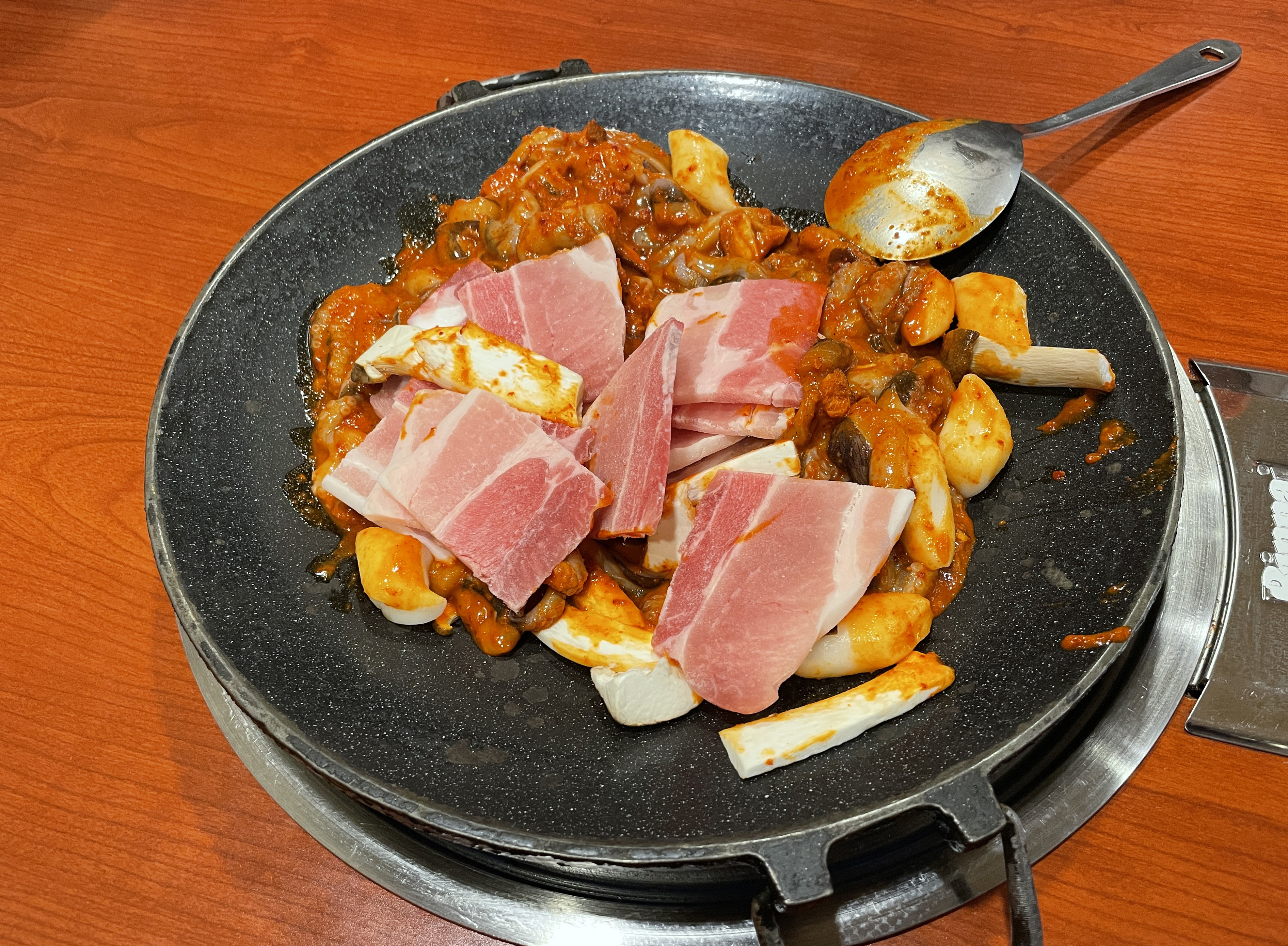주꾸미 볶음은 떡과 주꾸미, 새송이버섯 등이 볶아진 형태였고 맵기는 신라면보다 조금 더 매운 정도였습니다. 주꾸미 볶음이 맵다고 느껴지는 분은 같이 나오는 카레를 찍어서 먹거나, 쌈무, 콩나물과 곁들여서 먹어도 괜찮았습니다.