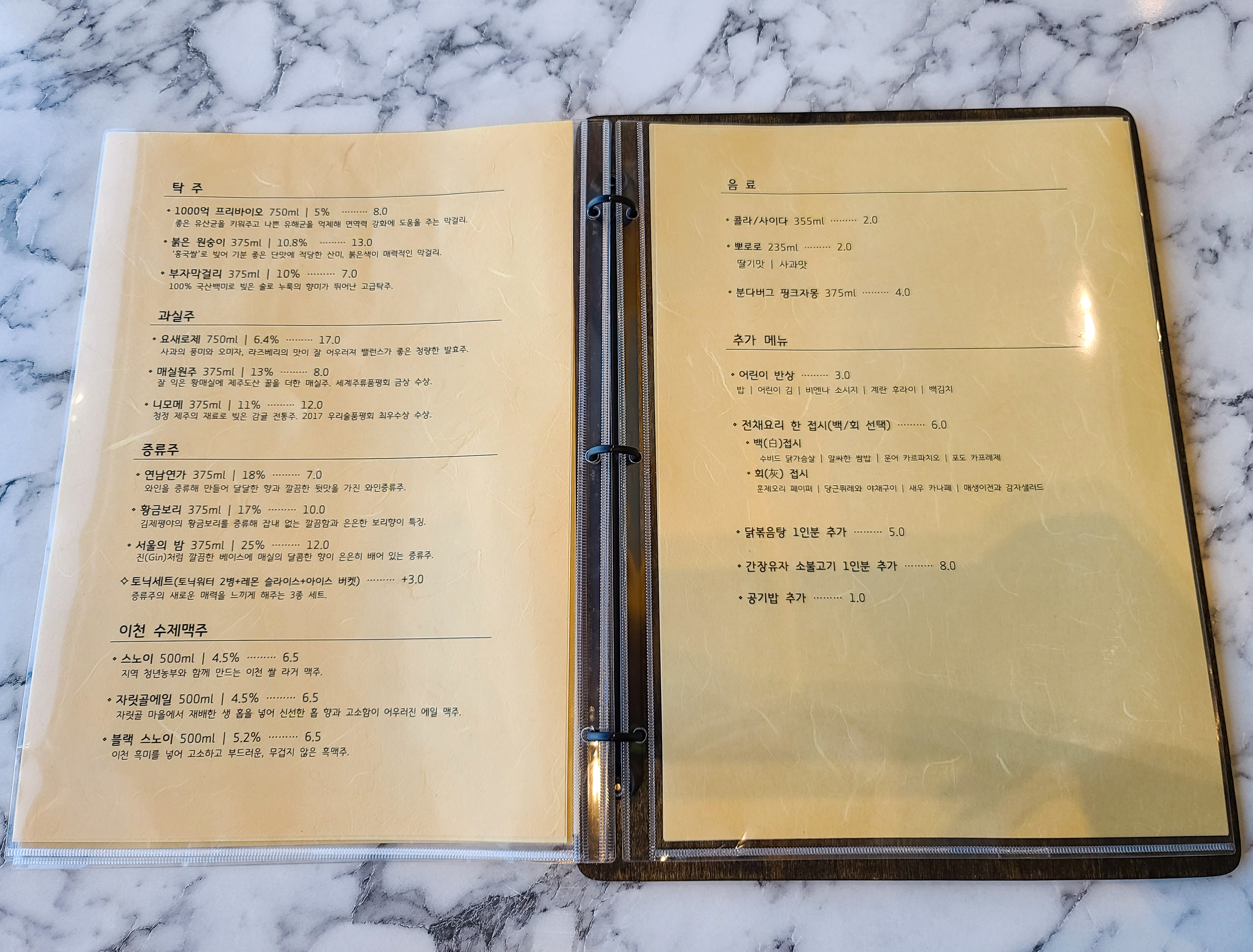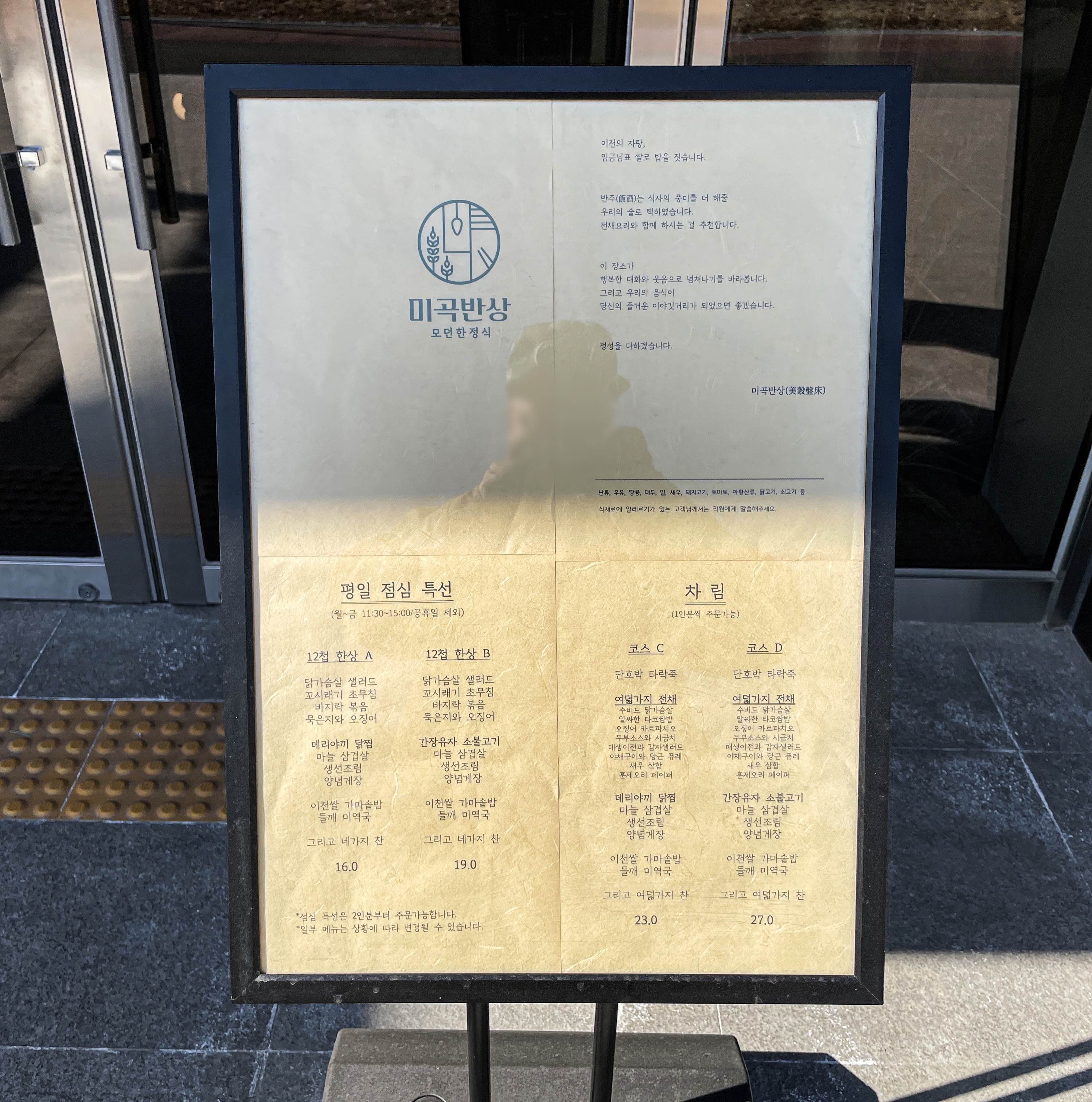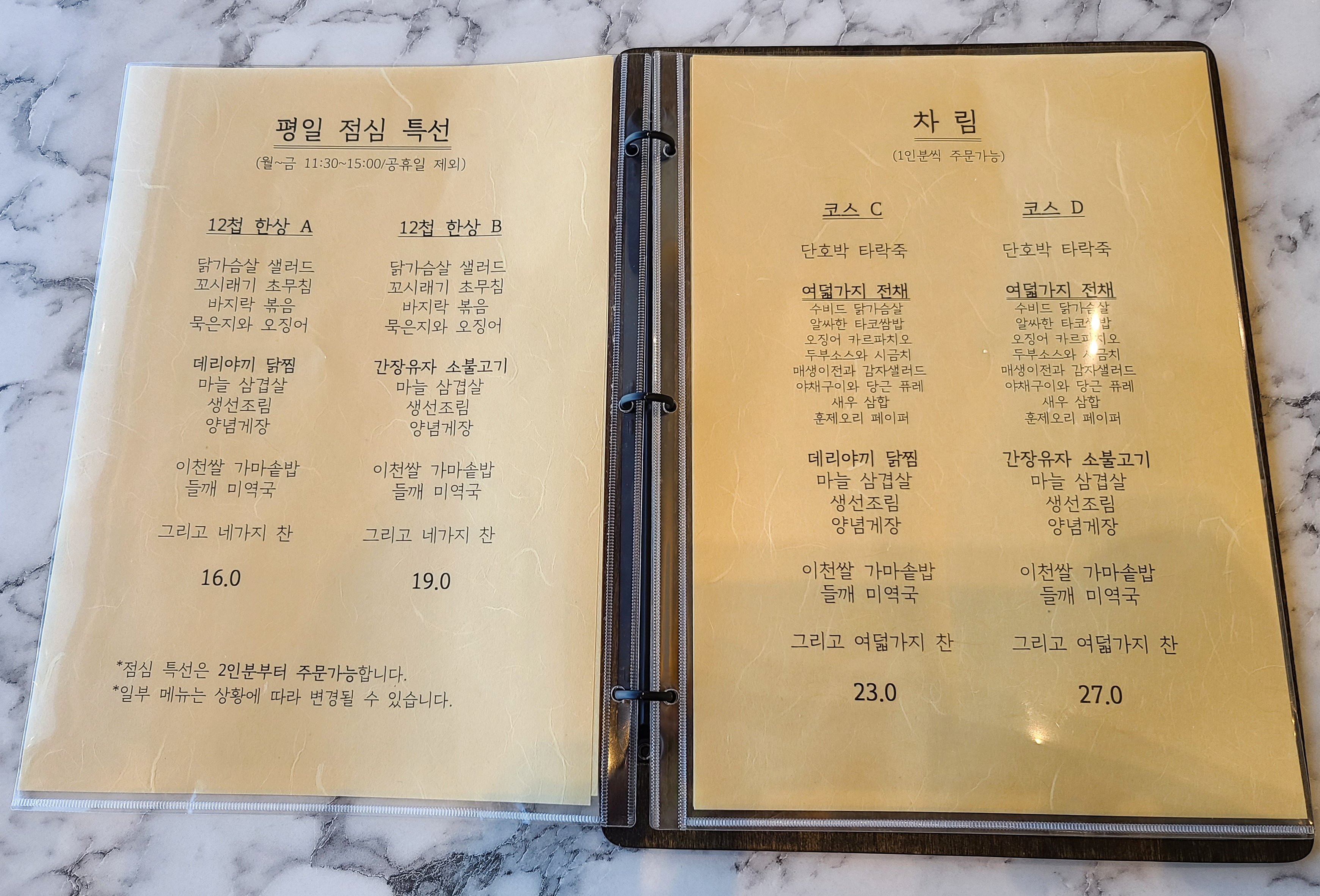 미곡반상의 메뉴는 위와 같았고, 평일 점심특선으로 12첩 한상 A 코스와 B 코스가 있었습니다. 물론 일반 메뉴인 C 와 D 코스도 볼 수 있었습니다. 저희는 12첩 한상 A 코스를 주문했습니다.