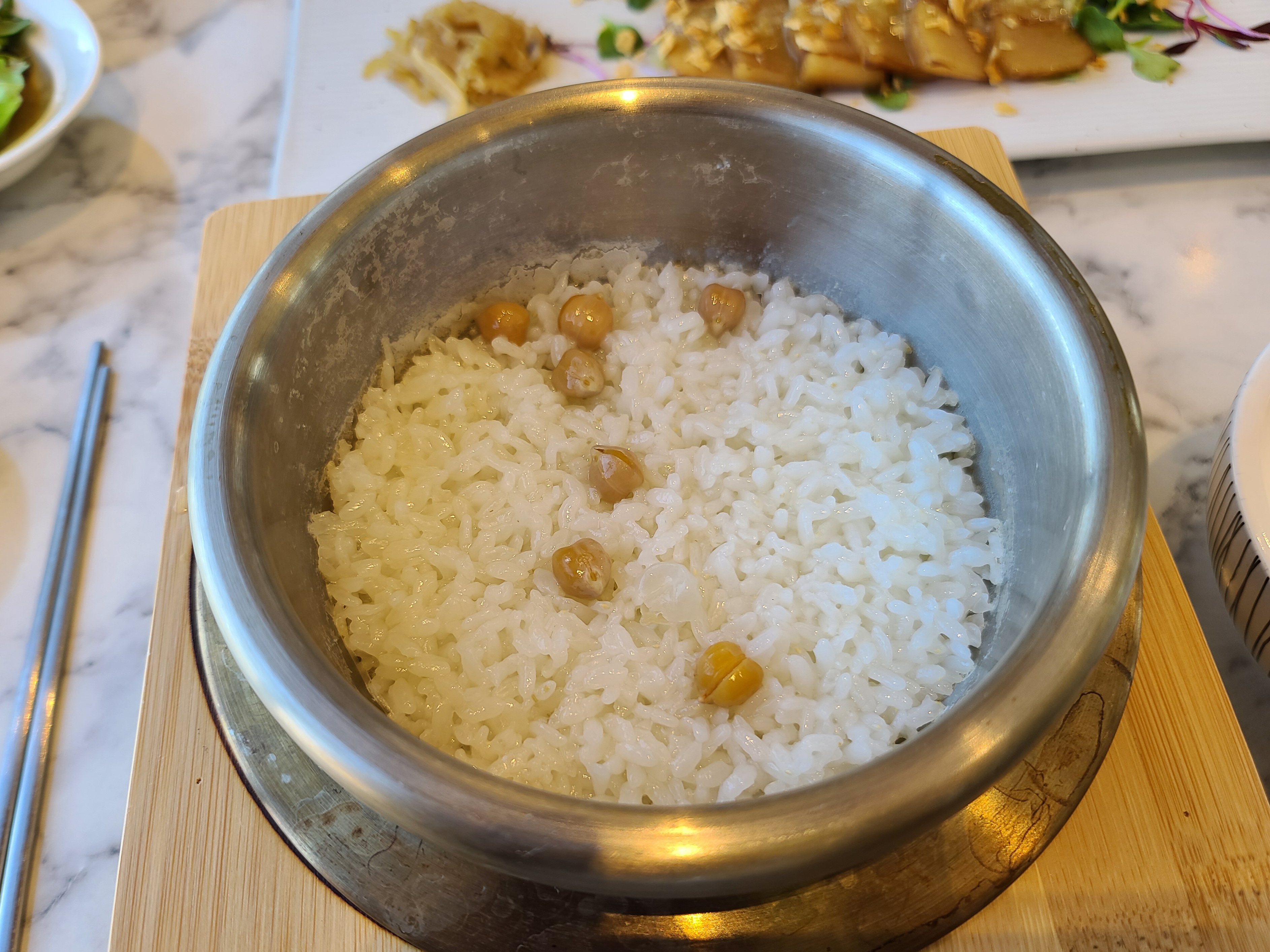 먼저 쌀밥은 갓 지어서 윤기가 흐르고 있었고, 가마솥으로 지어내 찰기가 있었습니다. 밥을 공기에 따로 덜어내고 솥에 물을 부어줬습니다. 역시 임금님표 쌀로 지어서 그런지 밥맛은 정말 좋더라고요.