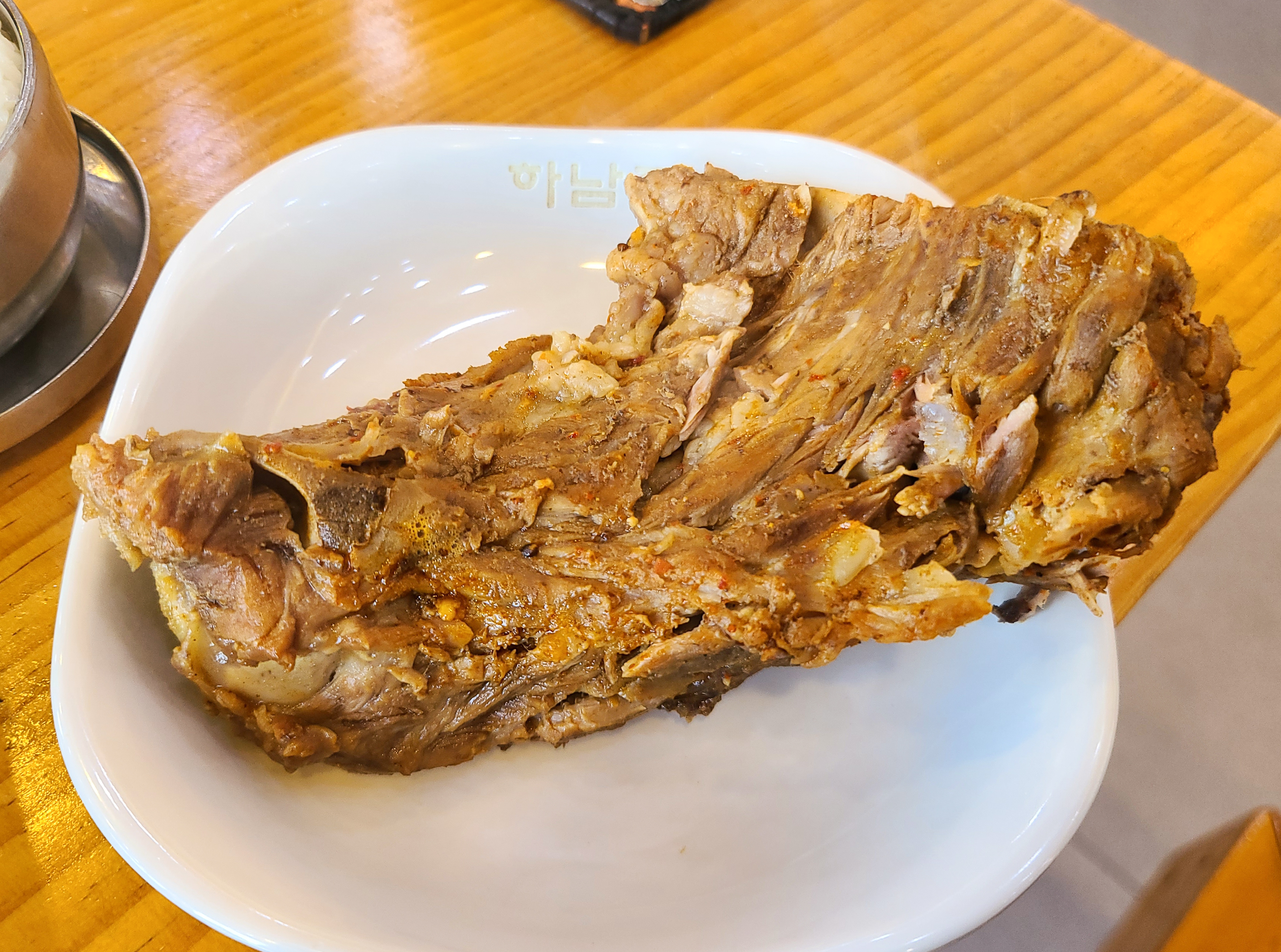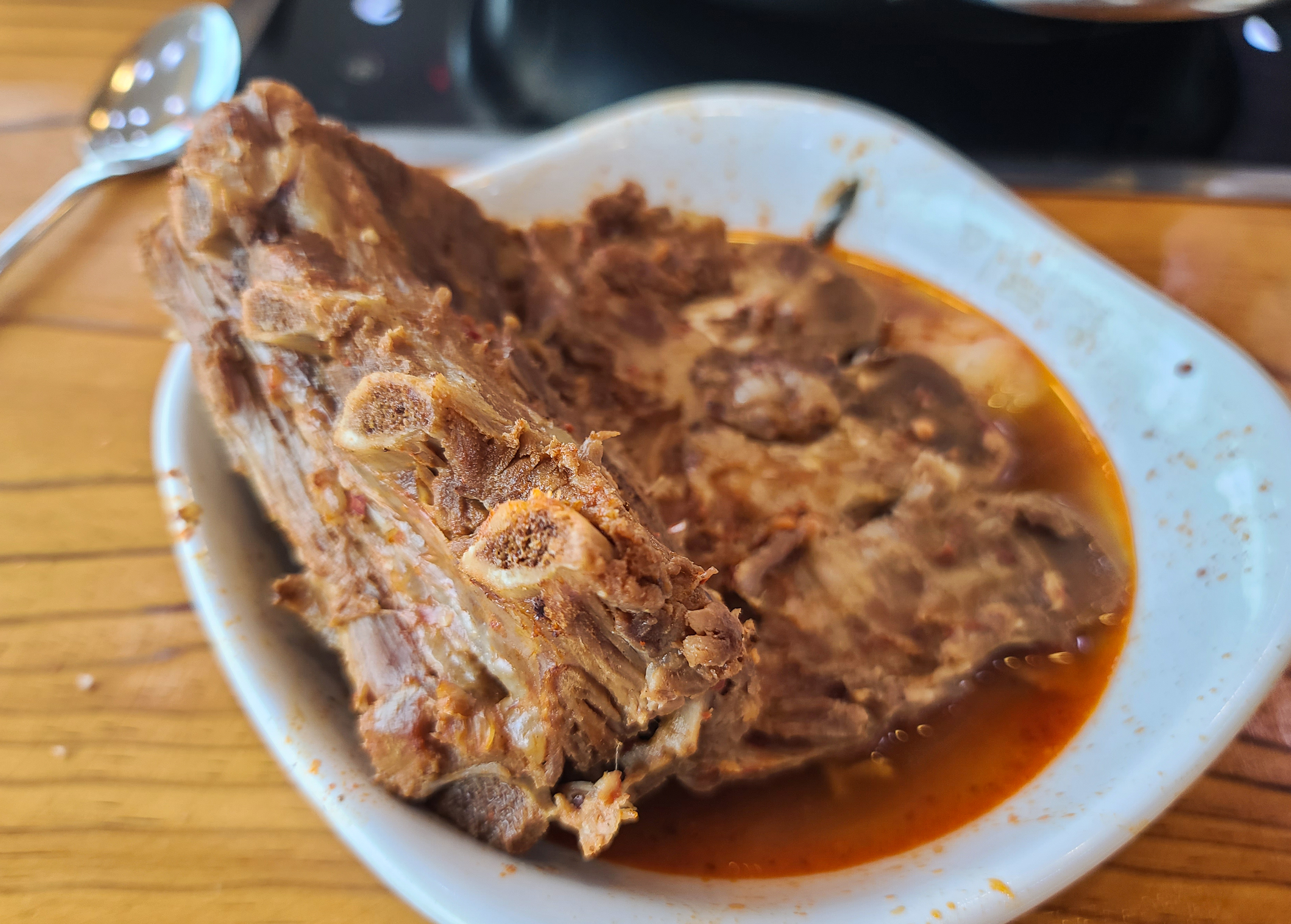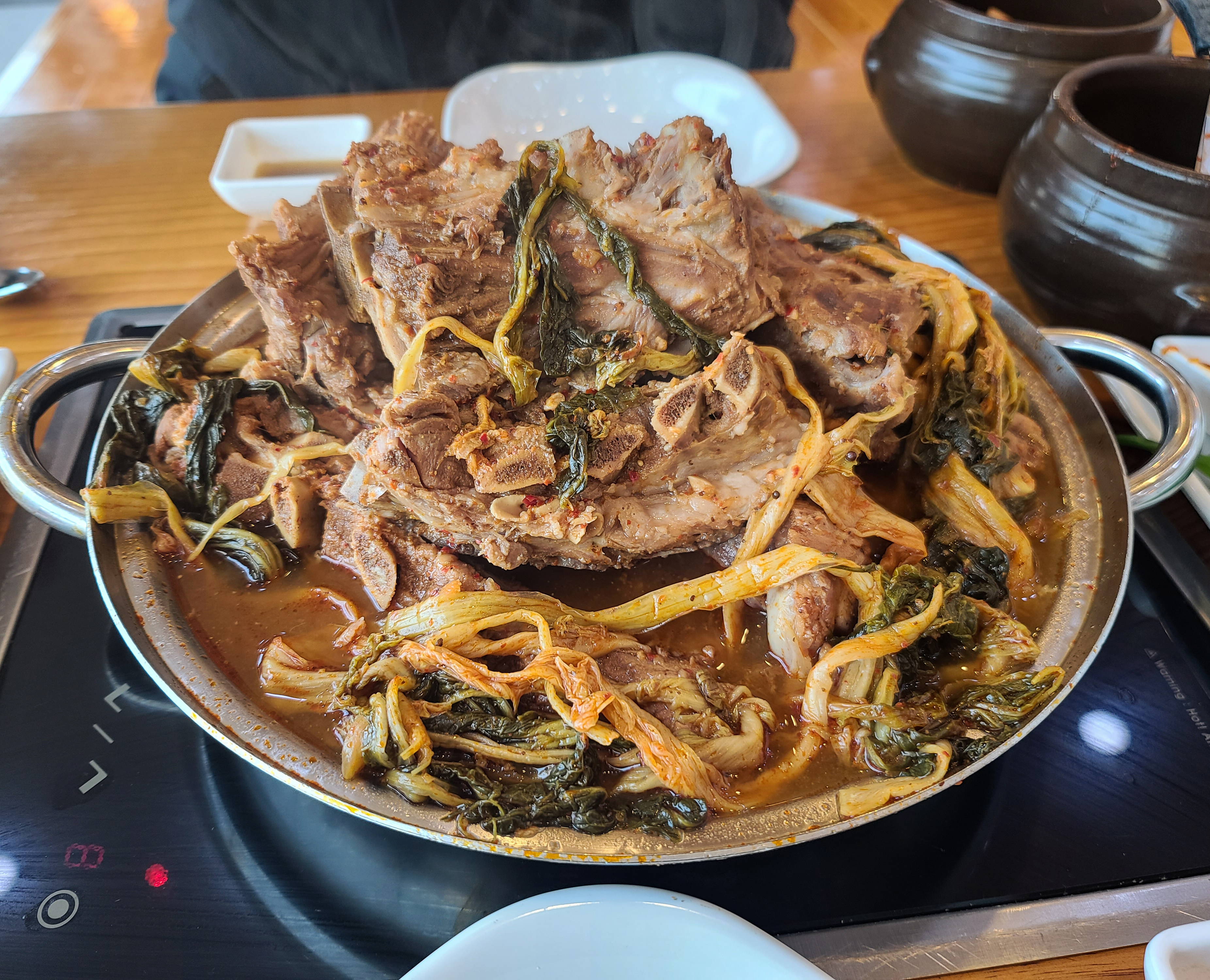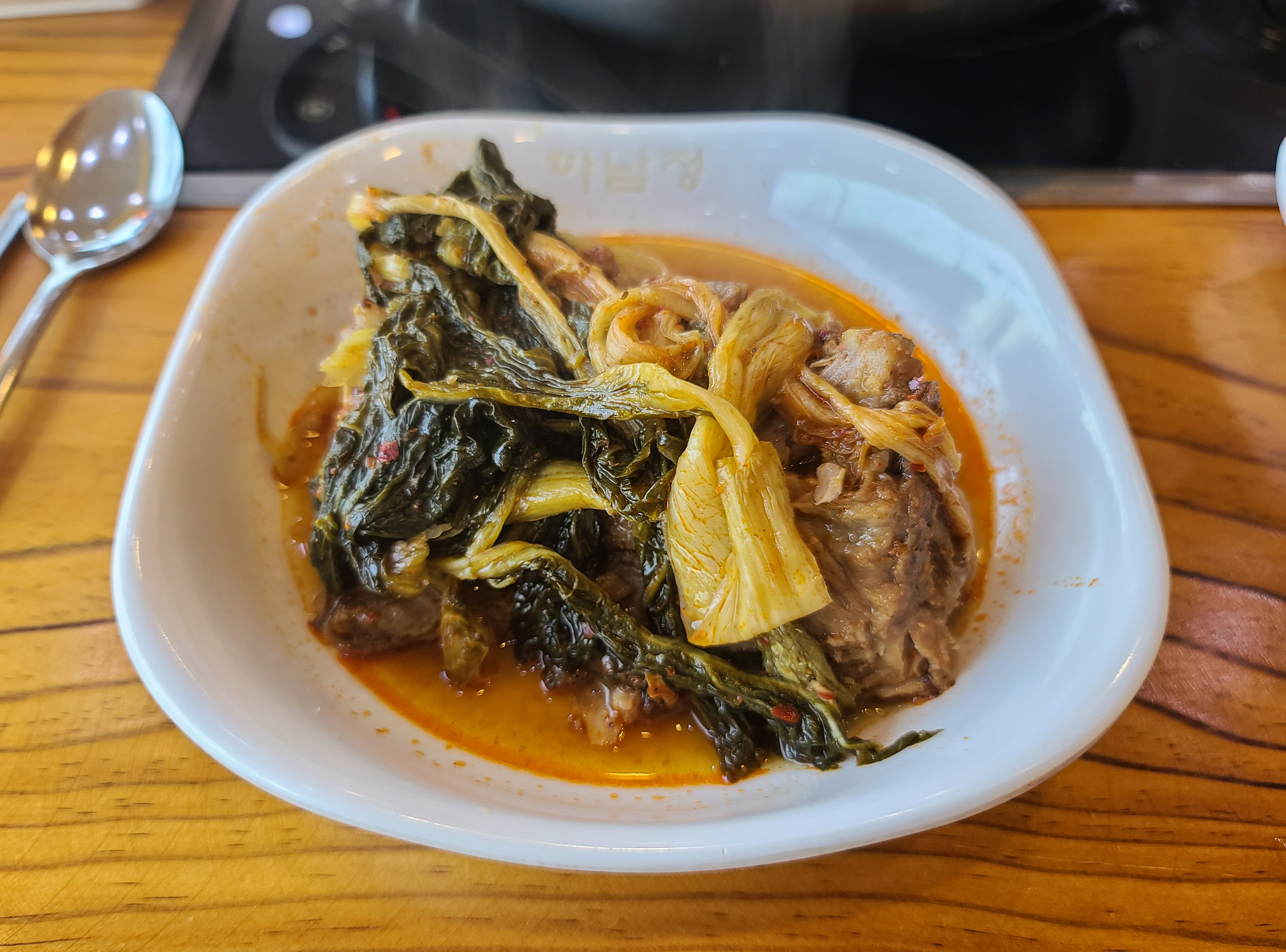 우선 감자탕부터 살펴보시죠. 하남정 뼈다귀 전골의 우거지는 연하면서 부드러운 식감이 좋았고, 뼈에 붙은 살코기도 마찬가지로 퍽퍽하거나 질기지 않고 부드러웠습니다. 반찬으로 나온 겉절이도 맛있었습니다.