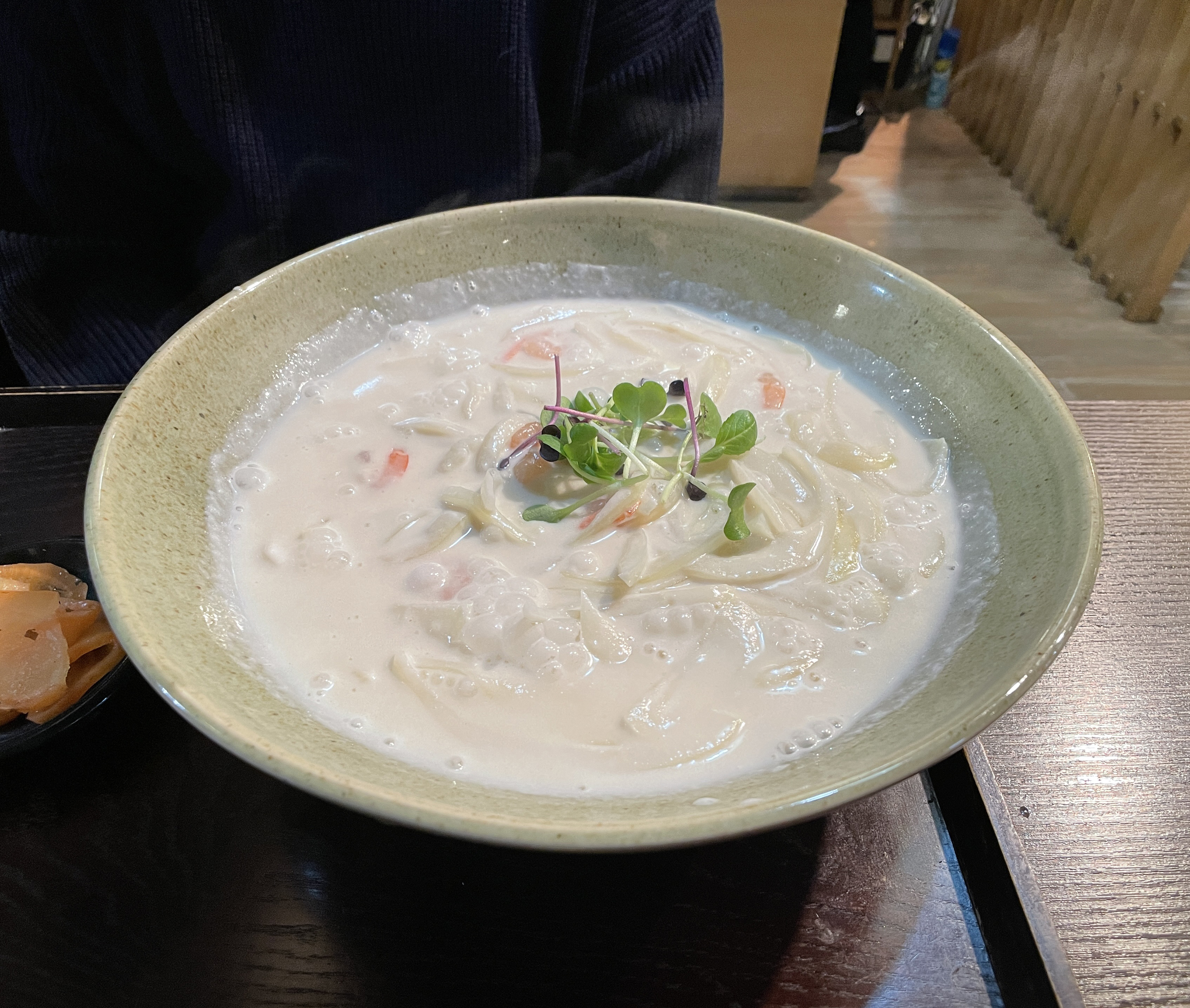두껍고 긴 면발은 생각보다 금세 배가 차더라고요. 중간중간 수저로 국물을 떠먹었는데 명란의 톡톡 씹히는 맛이 있어 좋았고, 국물만 따로 먹으면 짠맛이 강해서 많이 먹기는 어렵더라고요. 같이 나온 따뜻한 국물도 있었는데, 마찬가지로 짠 맛이 좀 강했습니다. 그래도 수타우동 맛집답게 면발 하나만큼은 확실한 인상을 주는 가게였습니다. 나중에 기회가 된다면 크림우동도 한 번 도전해봐야겠습니다.(ㅋㅋ)