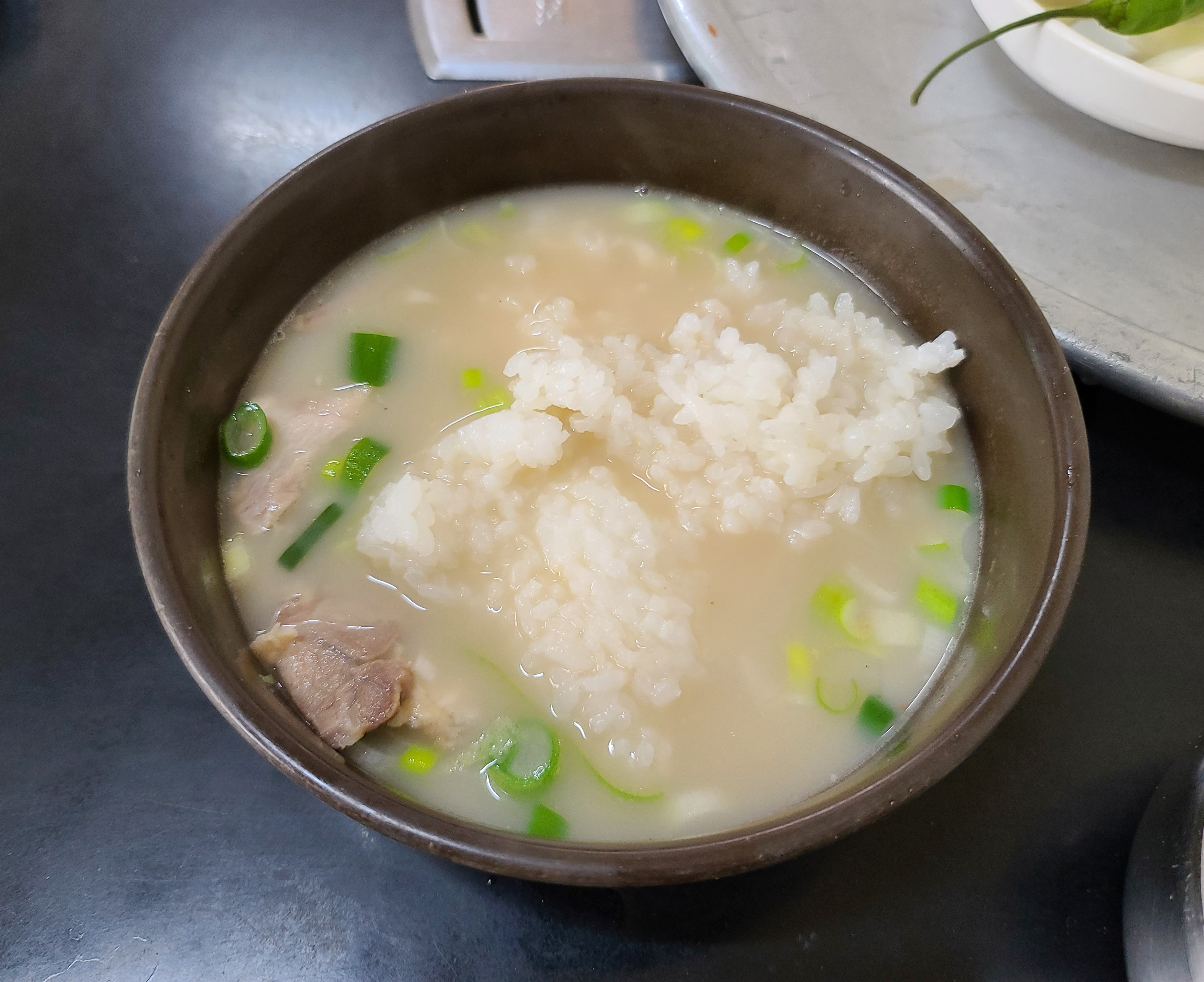 돼지국밥 위에 후추를 뿌리고, 국물을 먼저 숟가락으로 떠먹어보았습니다. 돼지국밥의 사골국물은 진하고 맛있더라고요. 처음 가게에 들어설 때 나는 돼지고기의 비릿한 냄새는 좀 거슬렸지만, 돼지국밥은 크게 신경 쓰일 정도로 냄새가 나거나 하지는 않았습니다.