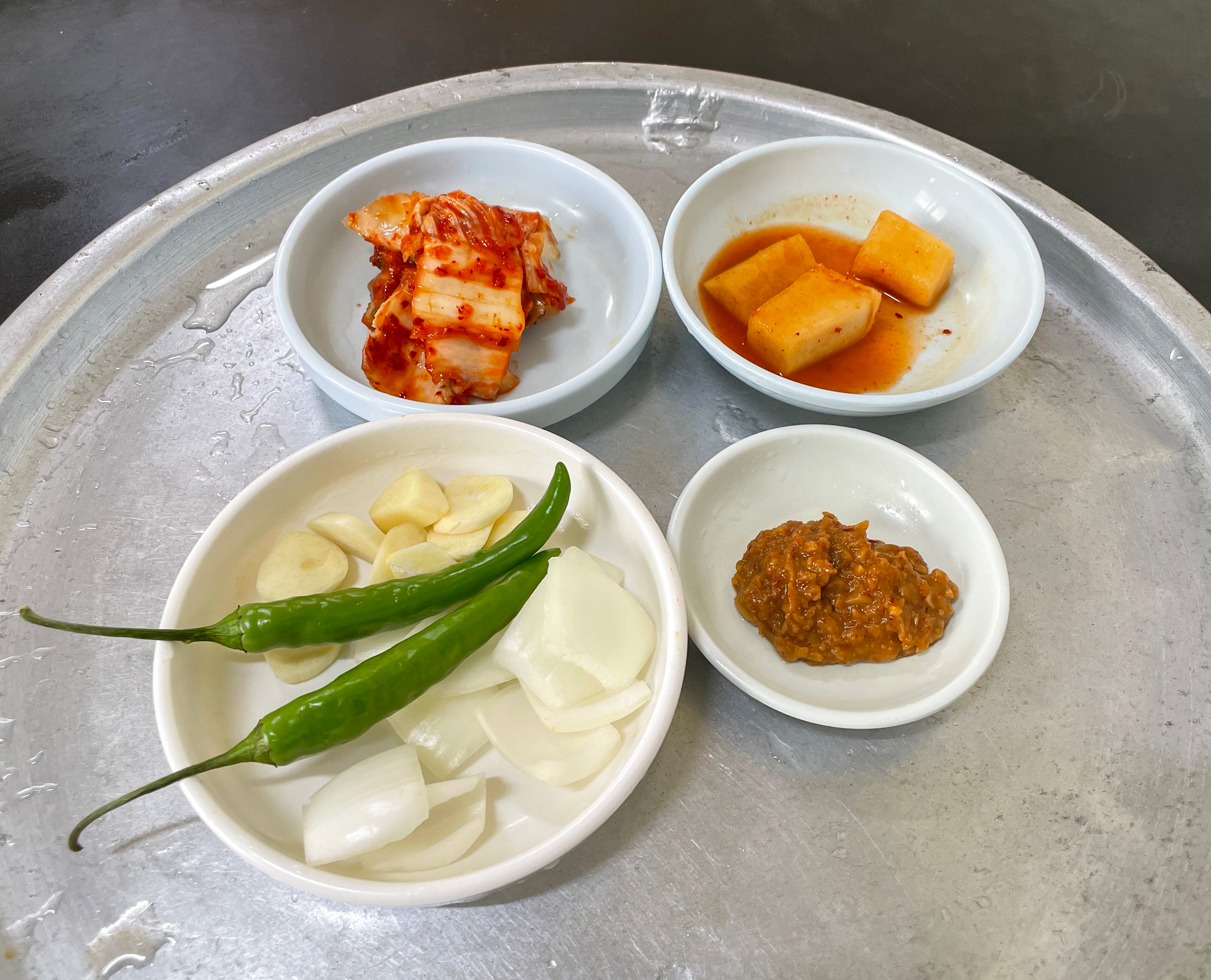 워낙 가게도 낡고 오래된 집기류들이 사용되어 위생에 문제가 있을 것 같았지만, 실제로 보면 할머니께서 잘 닦고 관리하시는지 크게 지저분해 보이거나 하지는 않았습니다. 반찬으로는 배추김치와 무김치, 마늘, 양파, 고추, 쌈장이 나왔습니다.