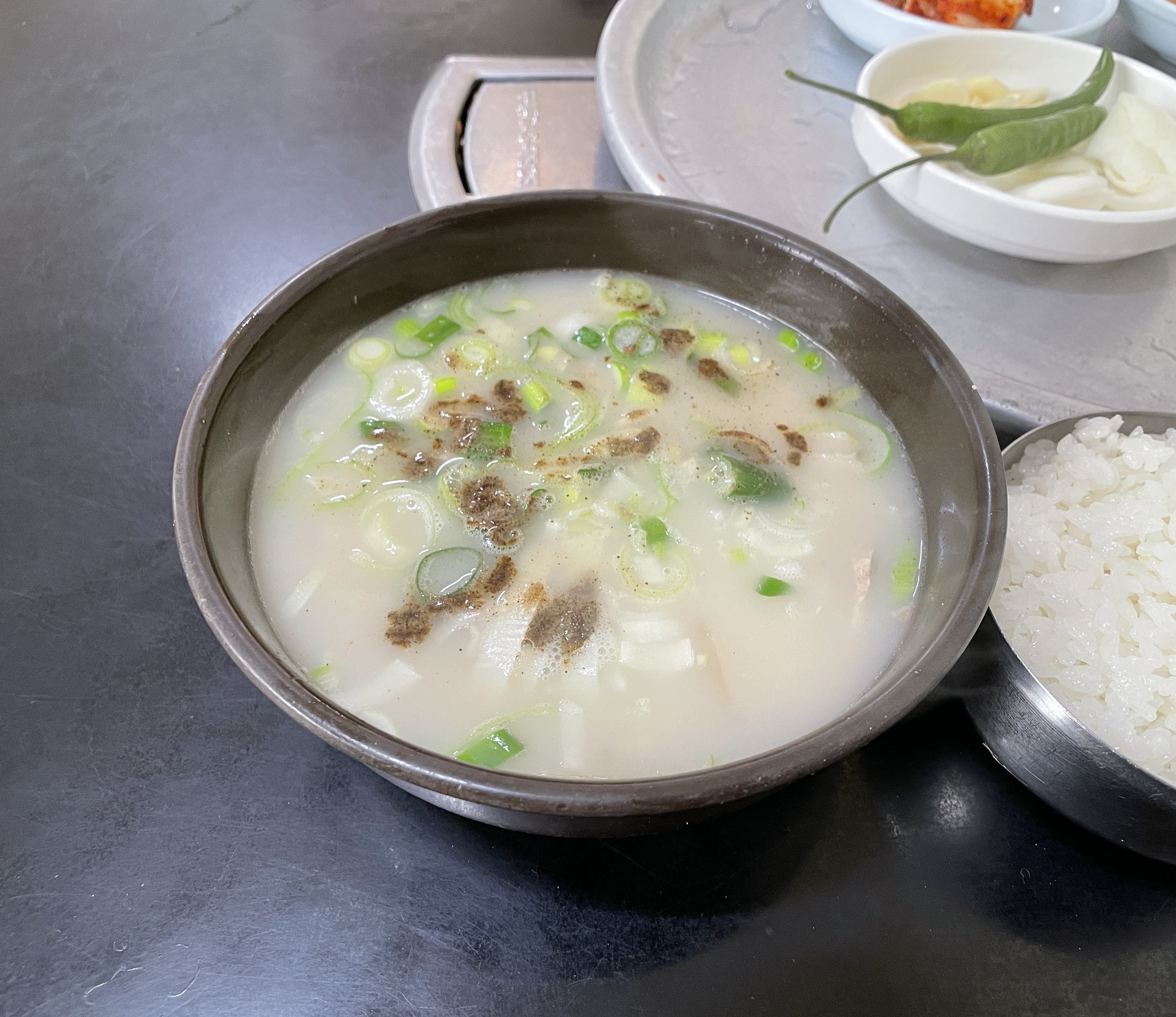 돼지국밥 위에 후추를 뿌리고, 국물을 먼저 숟가락으로 떠먹어보았습니다. 돼지국밥의 사골국물은 진하고 맛있더라고요. 처음 가게에 들어설 때 나는 돼지고기의 비릿한 냄새는 좀 거슬렸지만, 돼지국밥은 크게 신경 쓰일 정도로 냄새가 나거나 하지는 않았습니다.