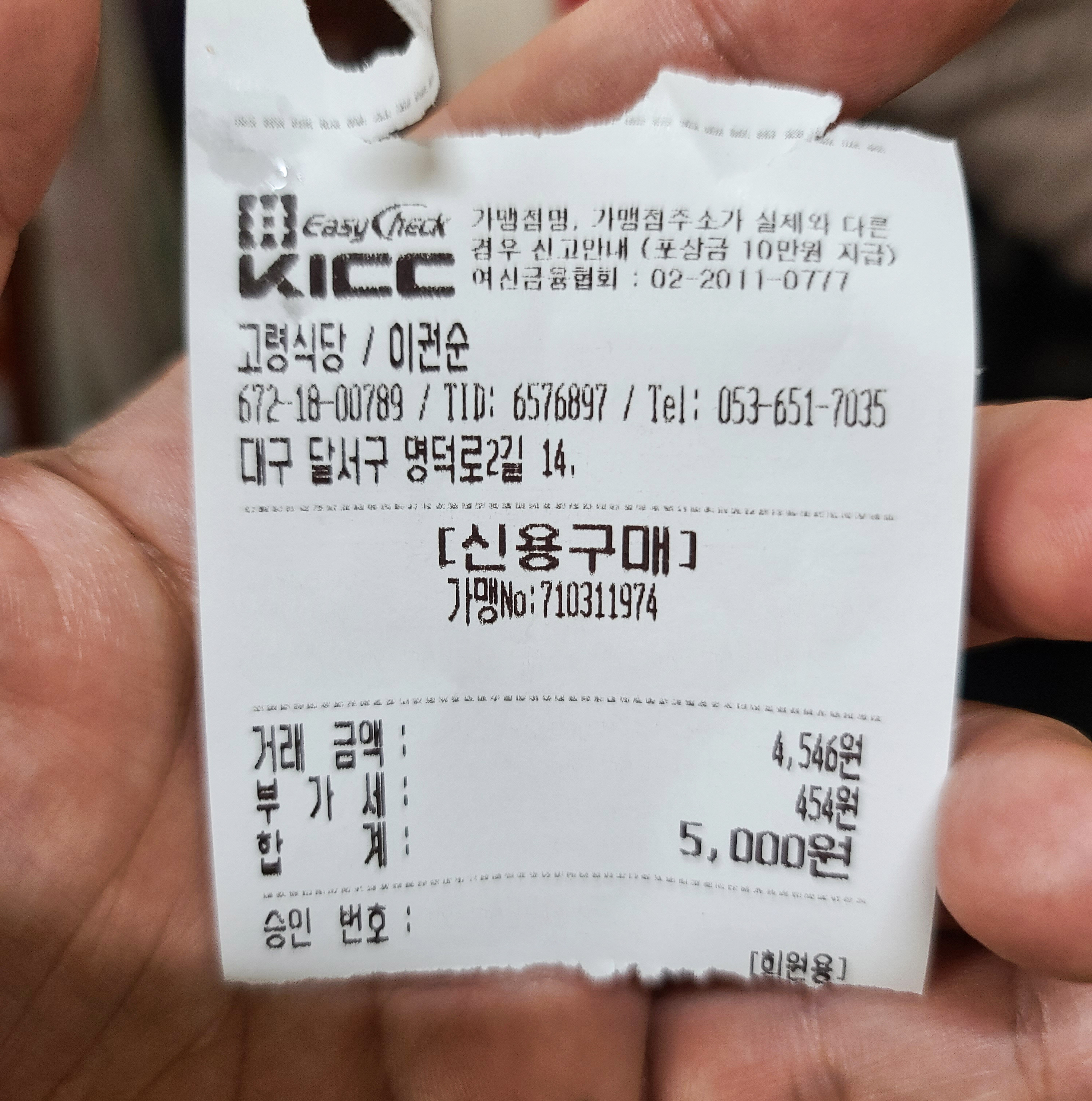 대구 고령식당에서 먹은 따로국밥의 금액은 5,000원이 나왔고, 기본 돼지국밥을 시키면 4,000원에 식사를 할 수 있었습니다. 정말 저렴하고 가성비 있는 식당이라고 할 수 있었습니다. 물론 맛만 놓고 보면은 가격대가 있는 돼지국밥의 국물과 고기가 더 맛있었는데, 5천 원 정도면 든든하게 한 끼 식사가 가능하다는 점에서 이 가게를 소개해드리고 싶습니다.