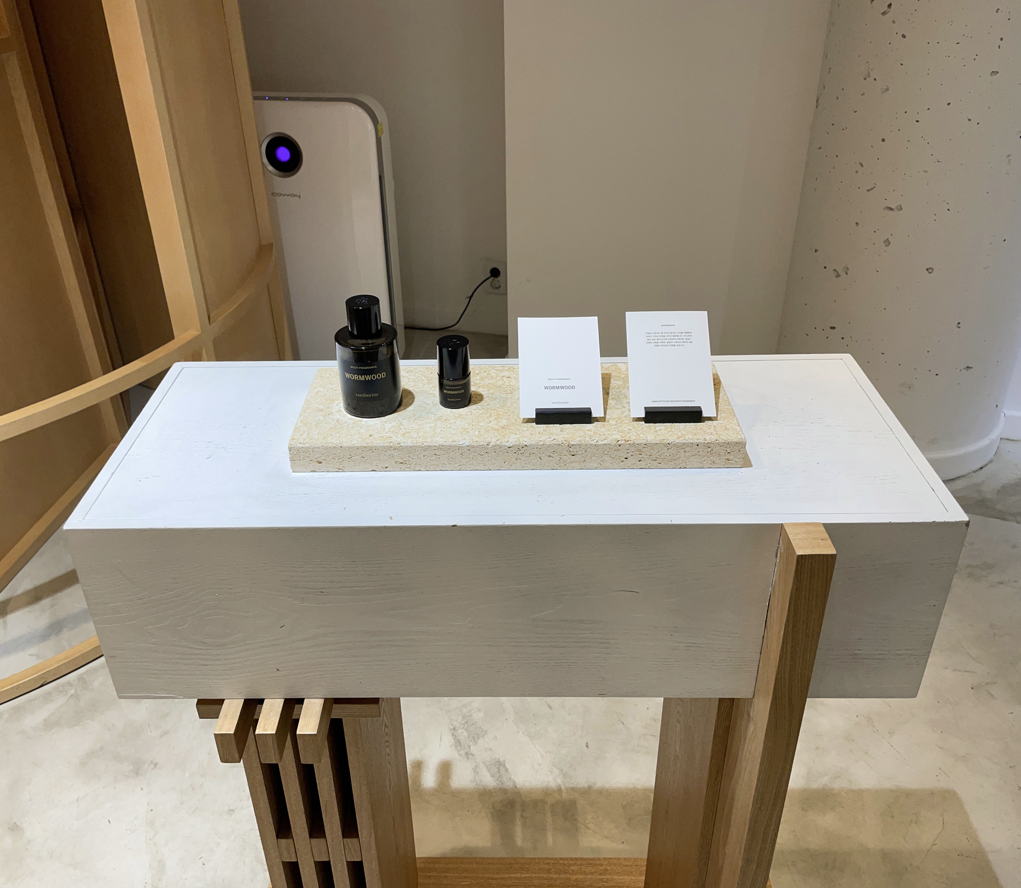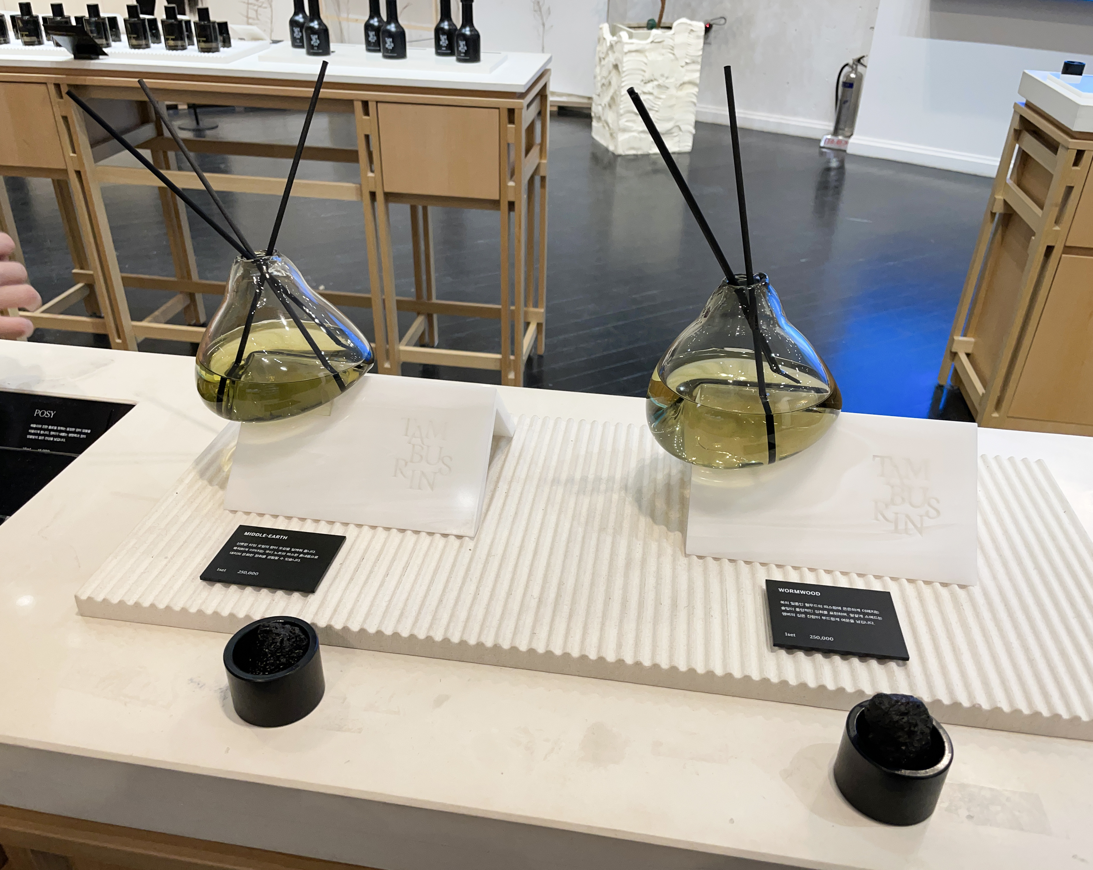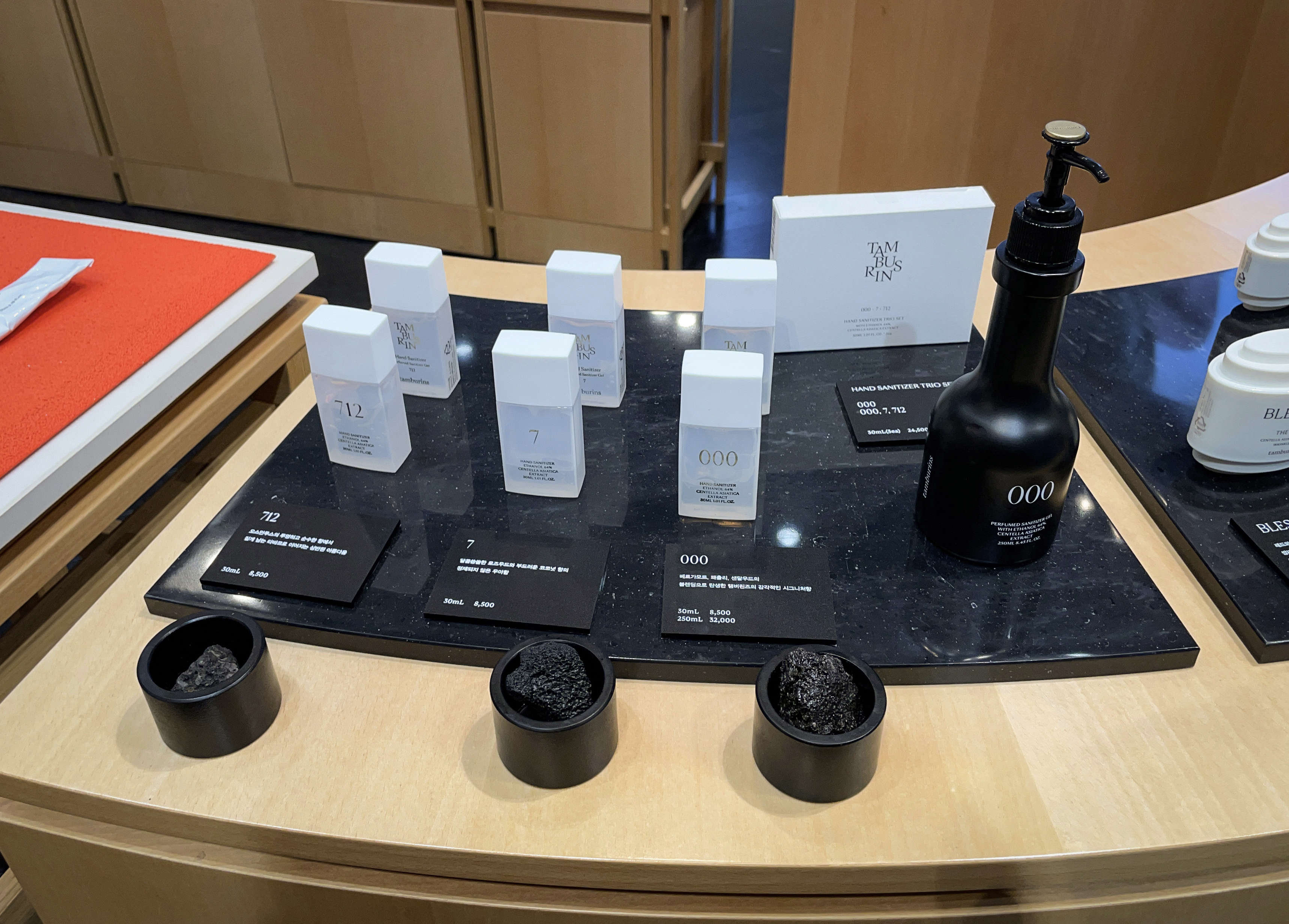 테이블에 있는 제품으로 시향을 우선 한 다음 향을 골라보았습니다. 원래 사려고 했던 000을 포함해 712도 자극적이지 않고 부드러운 향이 괜찮더라고요. 결국 대용량 탬버린즈 시그니처 향 '000' 손소독제 제품과 휴대용 손소독제 '712' 제품 두 개를 골라 결제했습니다. 제품들을 구입하고 2층 전시공간을 향했습니다.