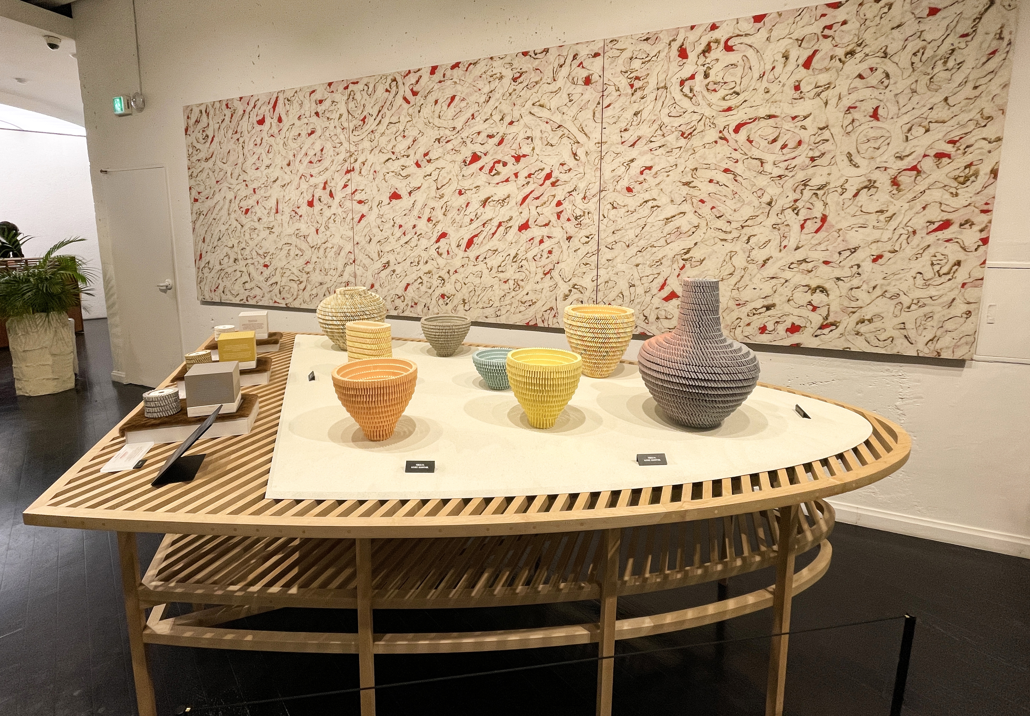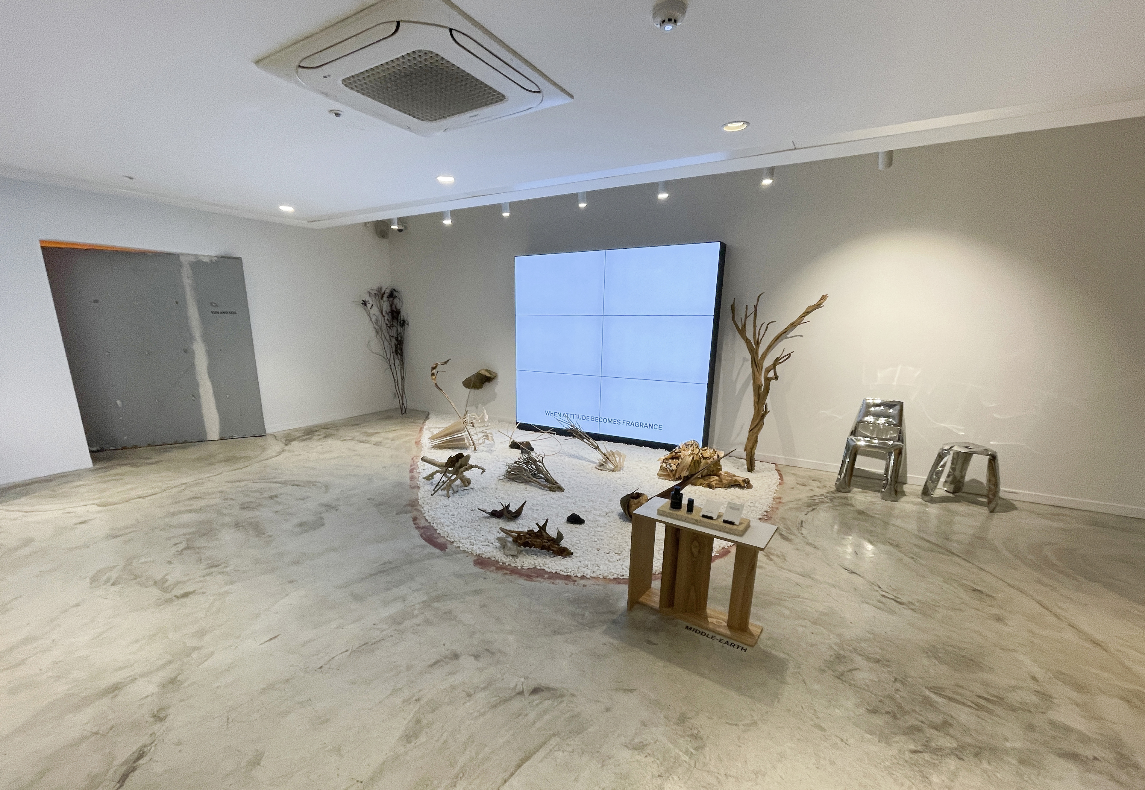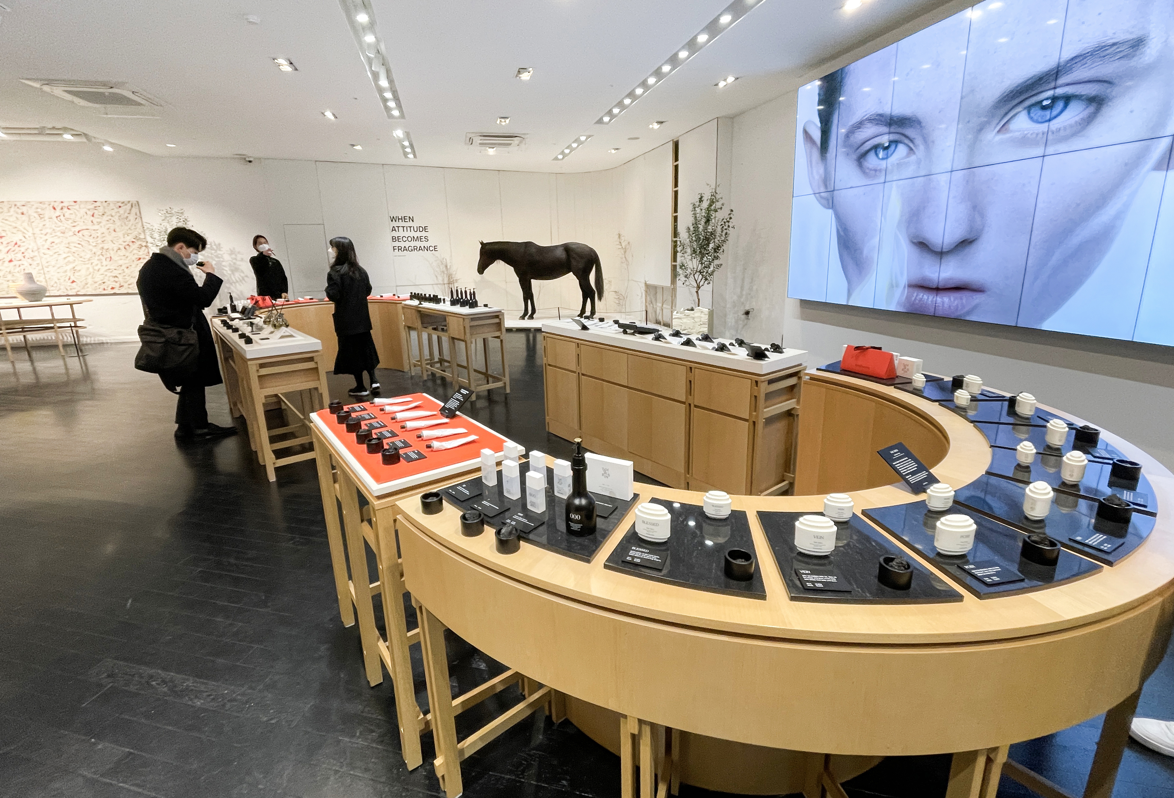 테이블에 있는 제품으로 시향을 우선 한 다음 향을 골라보았습니다. 원래 사려고 했던 000을 포함해 712도 자극적이지 않고 부드러운 향이 괜찮더라고요. 결국 대용량 탬버린즈 시그니처 향 '000' 손소독제 제품과 휴대용 손소독제 '712' 제품 두 개를 골라 결제했습니다. 제품들을 구입하고 2층 전시공간을 향했습니다.