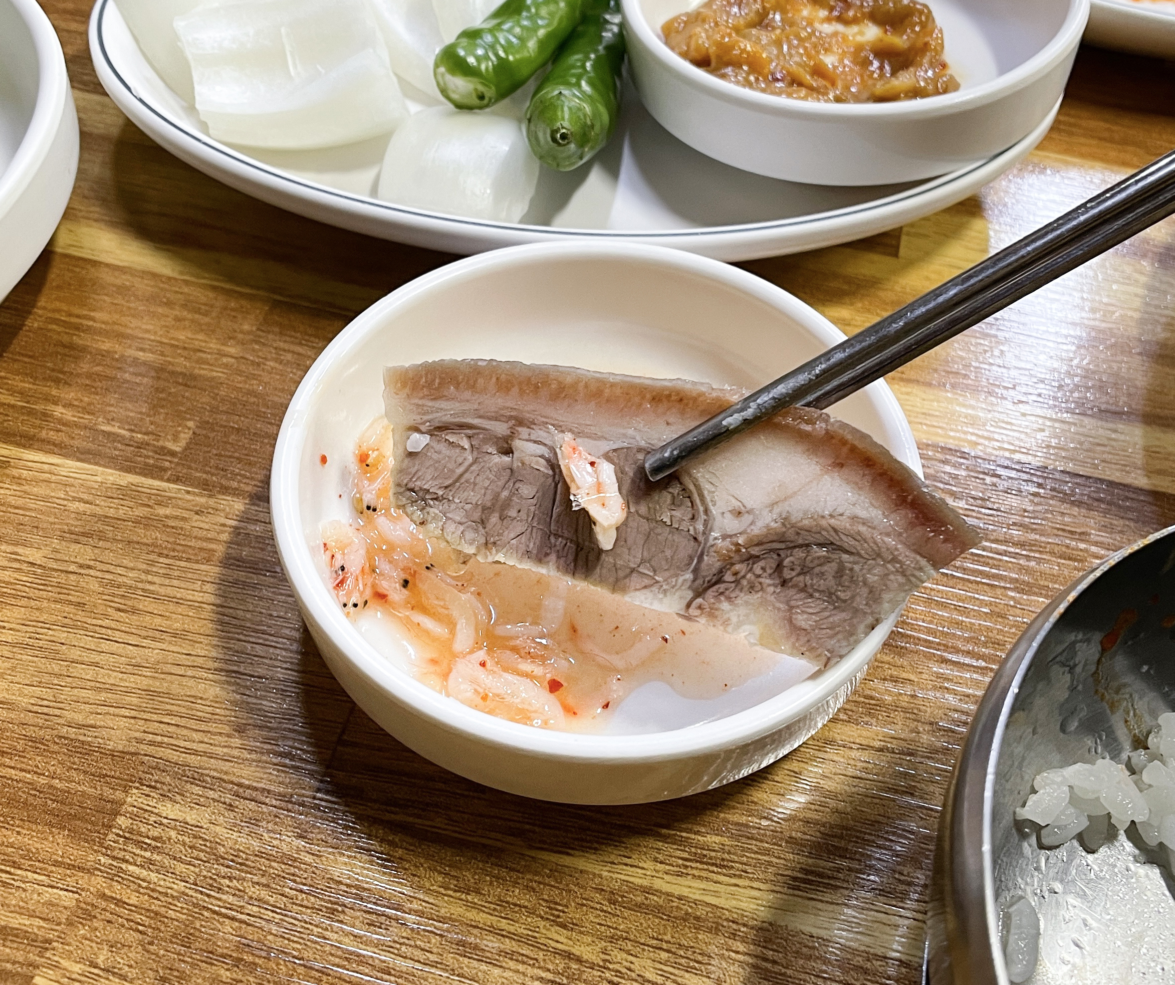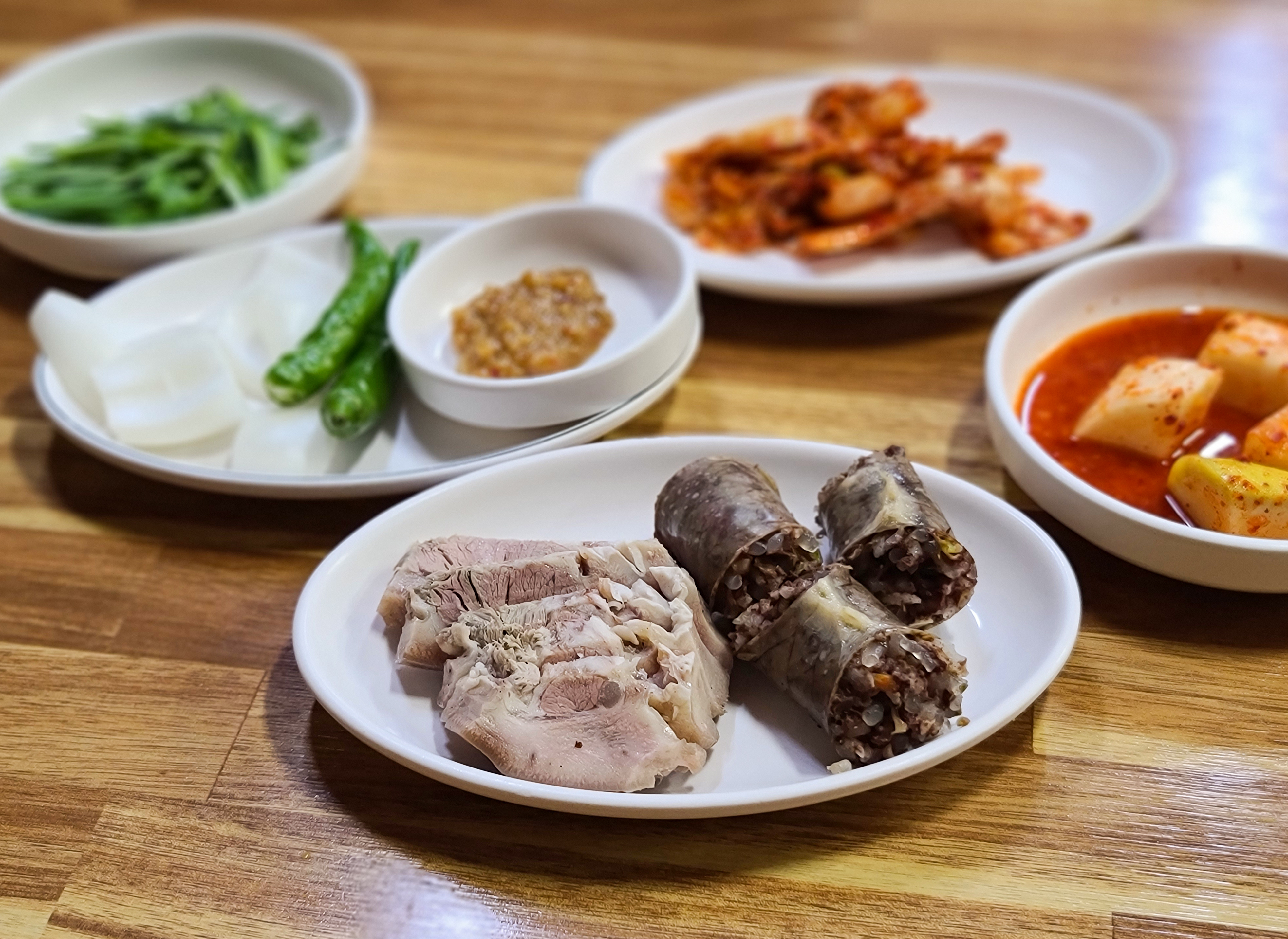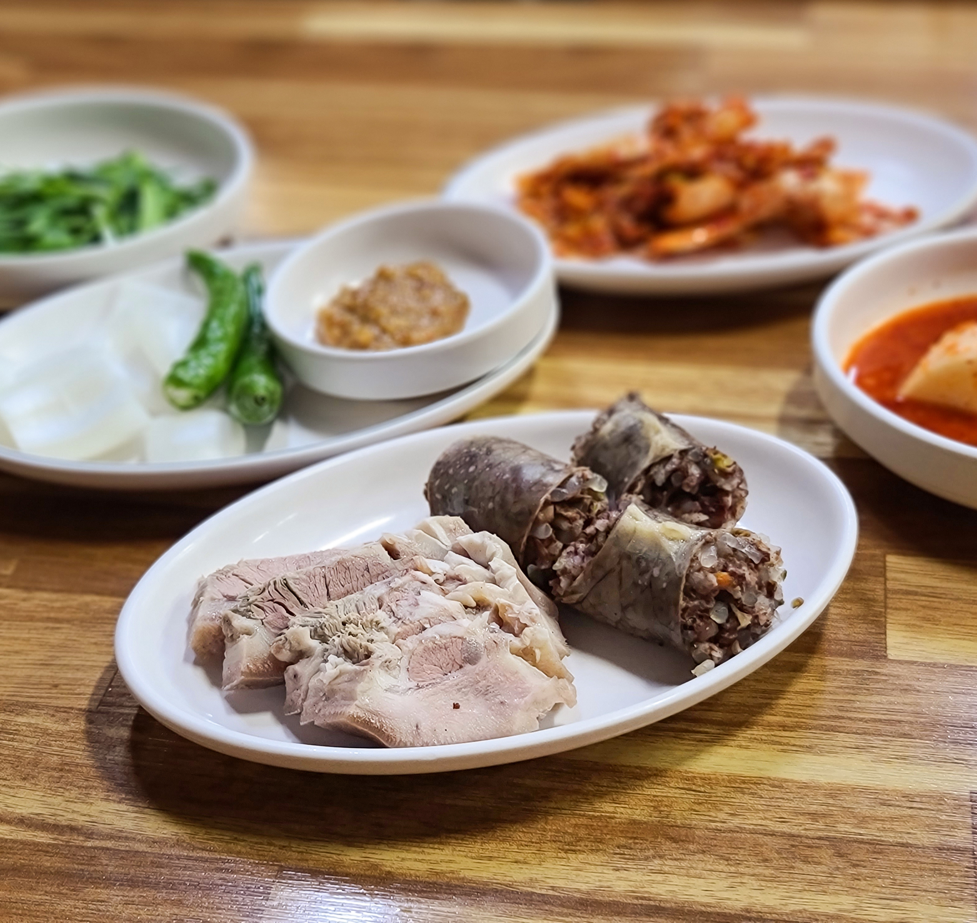 기본으로 나오는 반찬은 부추와 배추김치, 무김치, 고추, 양파, 쌈장 등이 있었습니다. 제가 시킨 정식 메뉴에는 머릿고기 수육과 순대가 한 접시 담겨 나왔습니다. 주문받으실 때는 분명 "정식에도 순대를 빼드리냐" 고 물어보셔서, 그렇게 되면 그렇게 해달라고 부탁드렸었는데, 순대가 들어있더라고요.