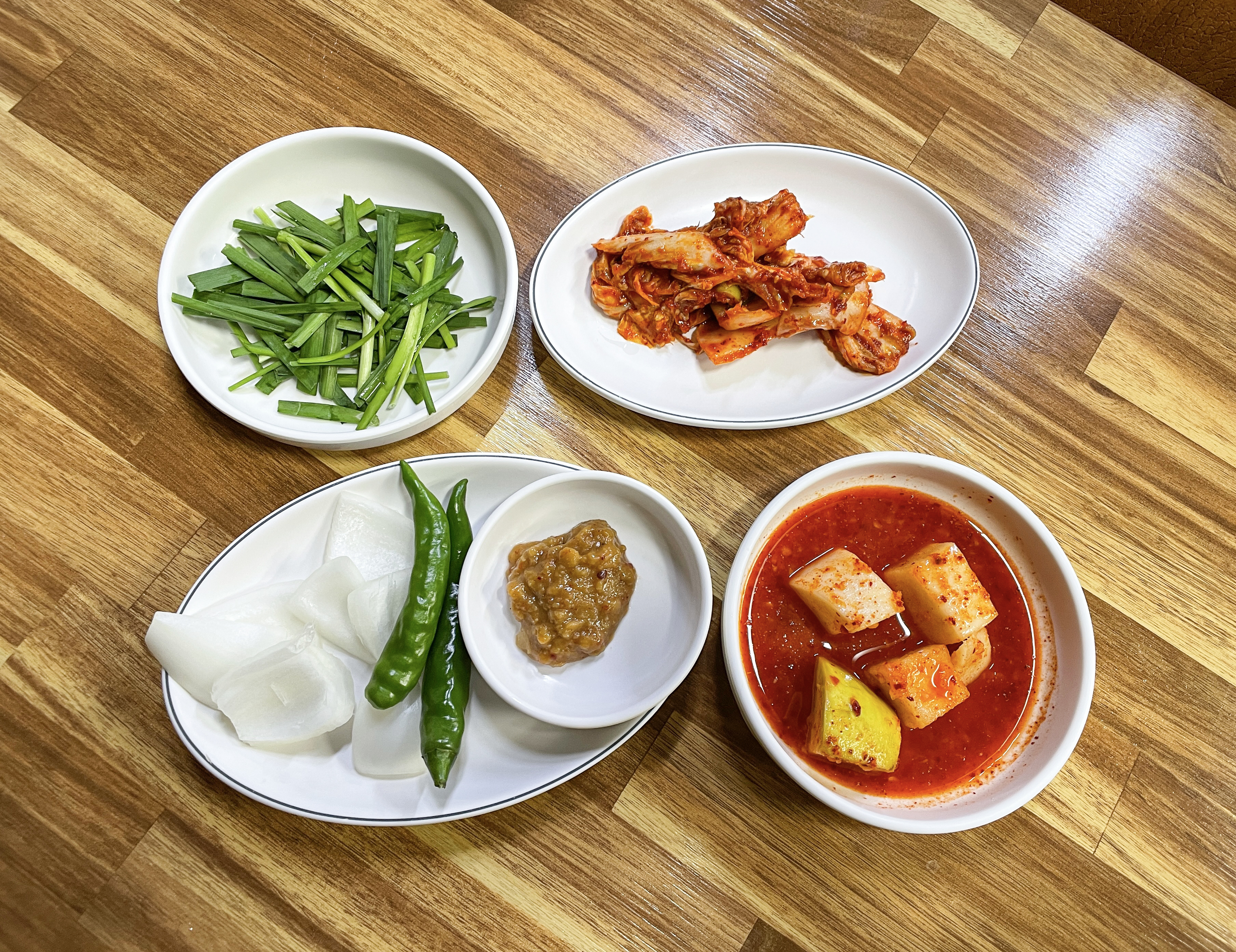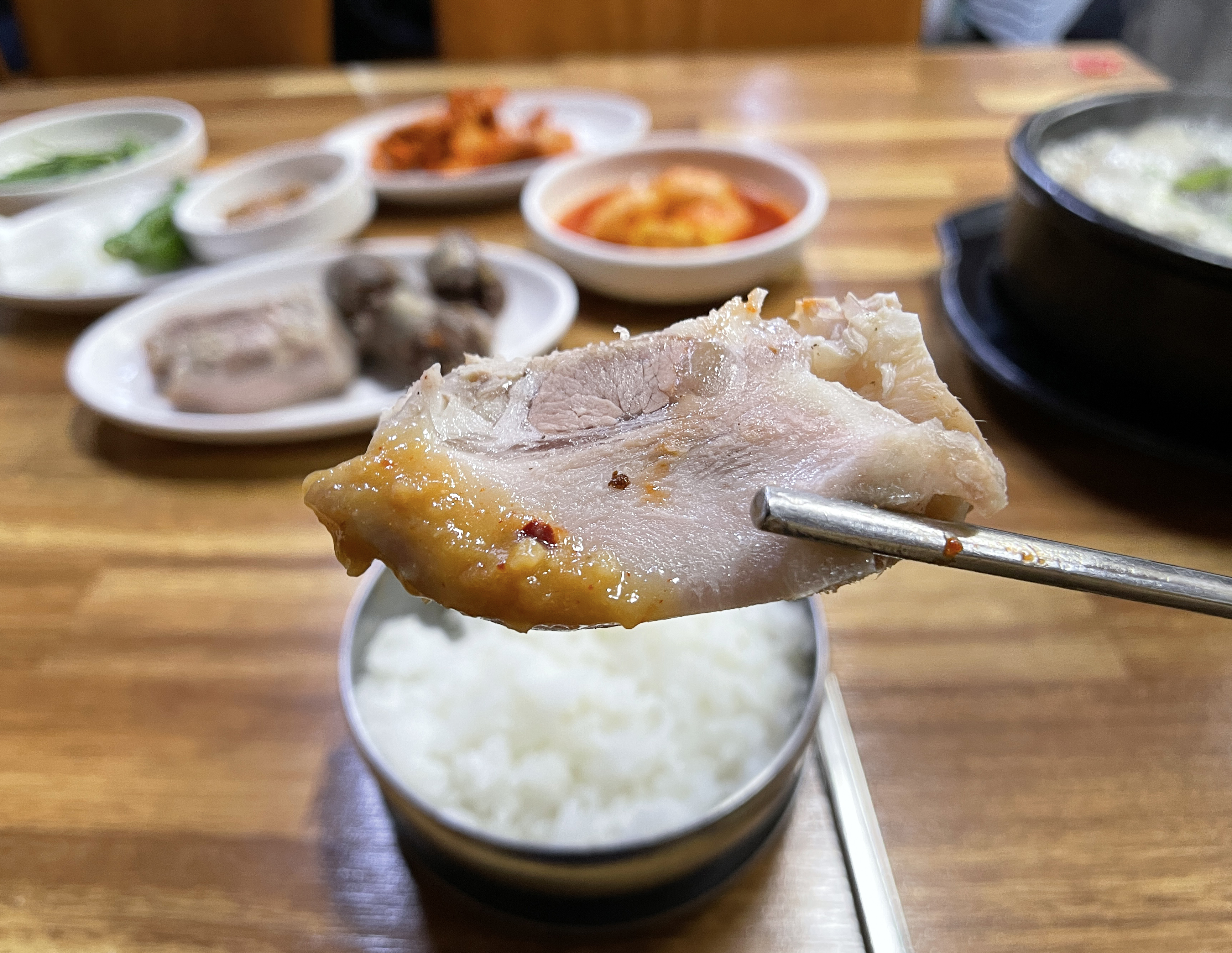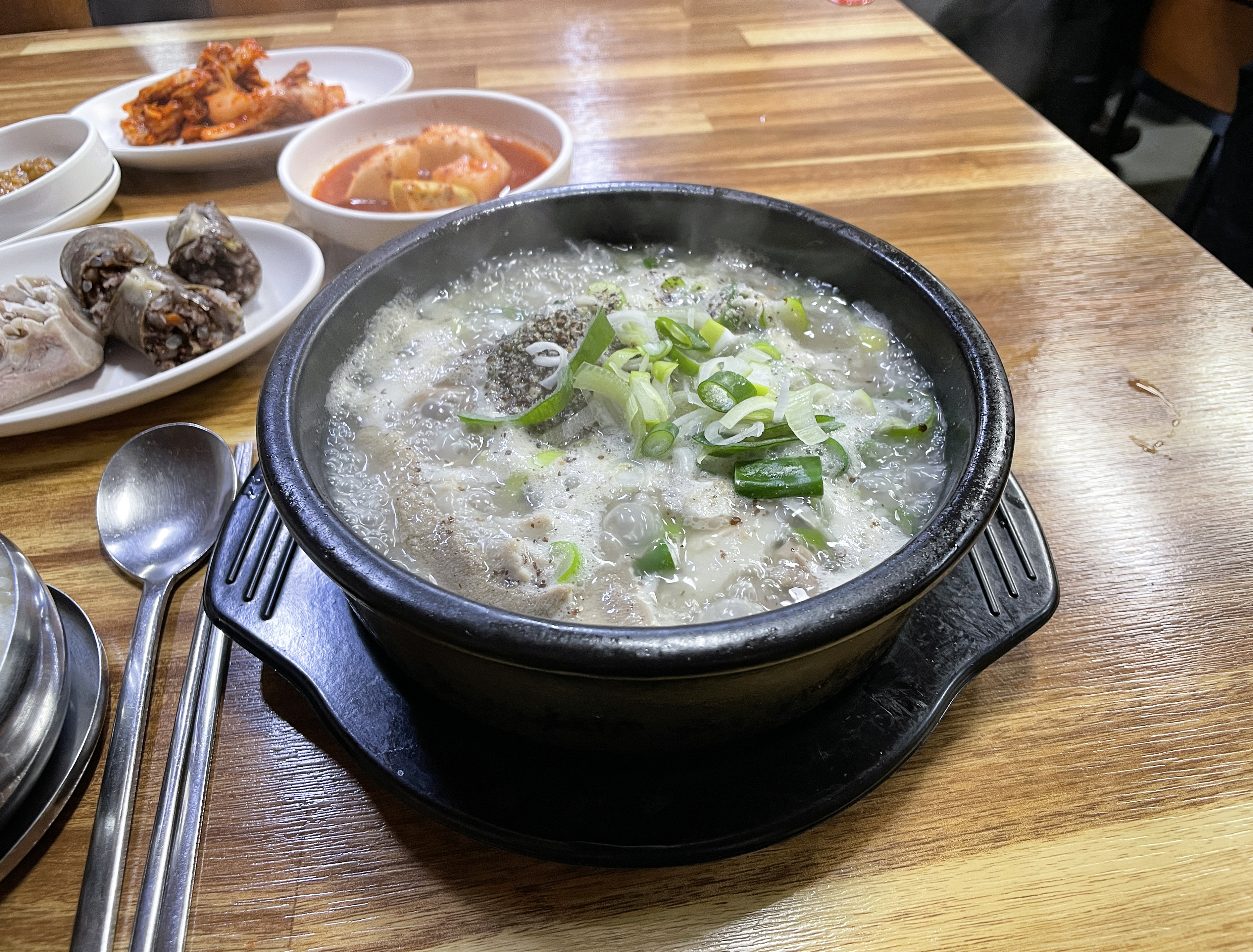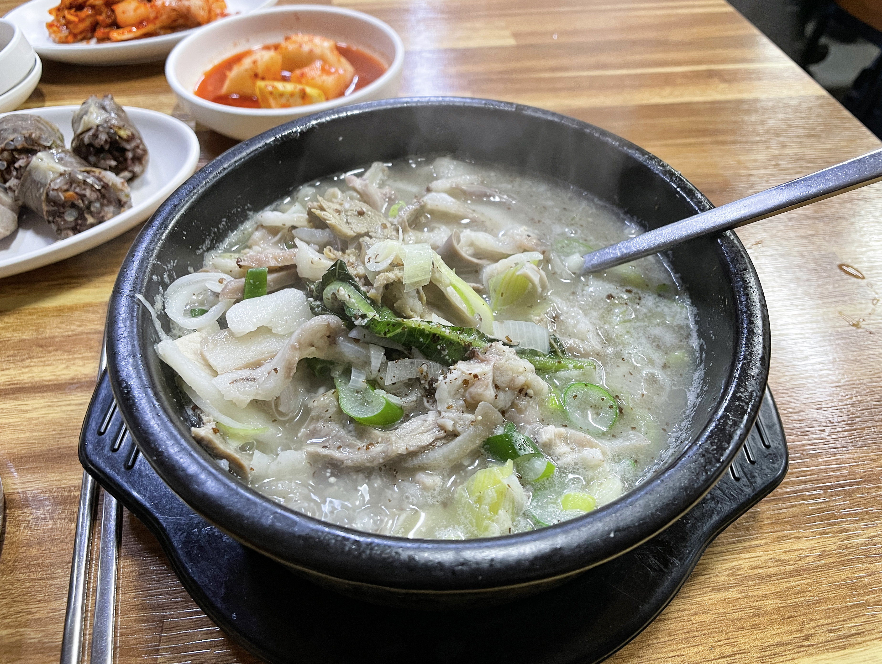 기본으로 나오는 반찬은 부추와 배추김치, 무김치, 고추, 양파, 쌈장 등이 있었습니다. 제가 시킨 정식 메뉴에는 머릿고기 수육과 순대가 한 접시 담겨 나왔습니다. 주문받으실 때는 분명 "정식에도 순대를 빼드리냐" 고 물어보셔서, 그렇게 되면 그렇게 해달라고 부탁드렸었는데, 순대가 들어있더라고요.