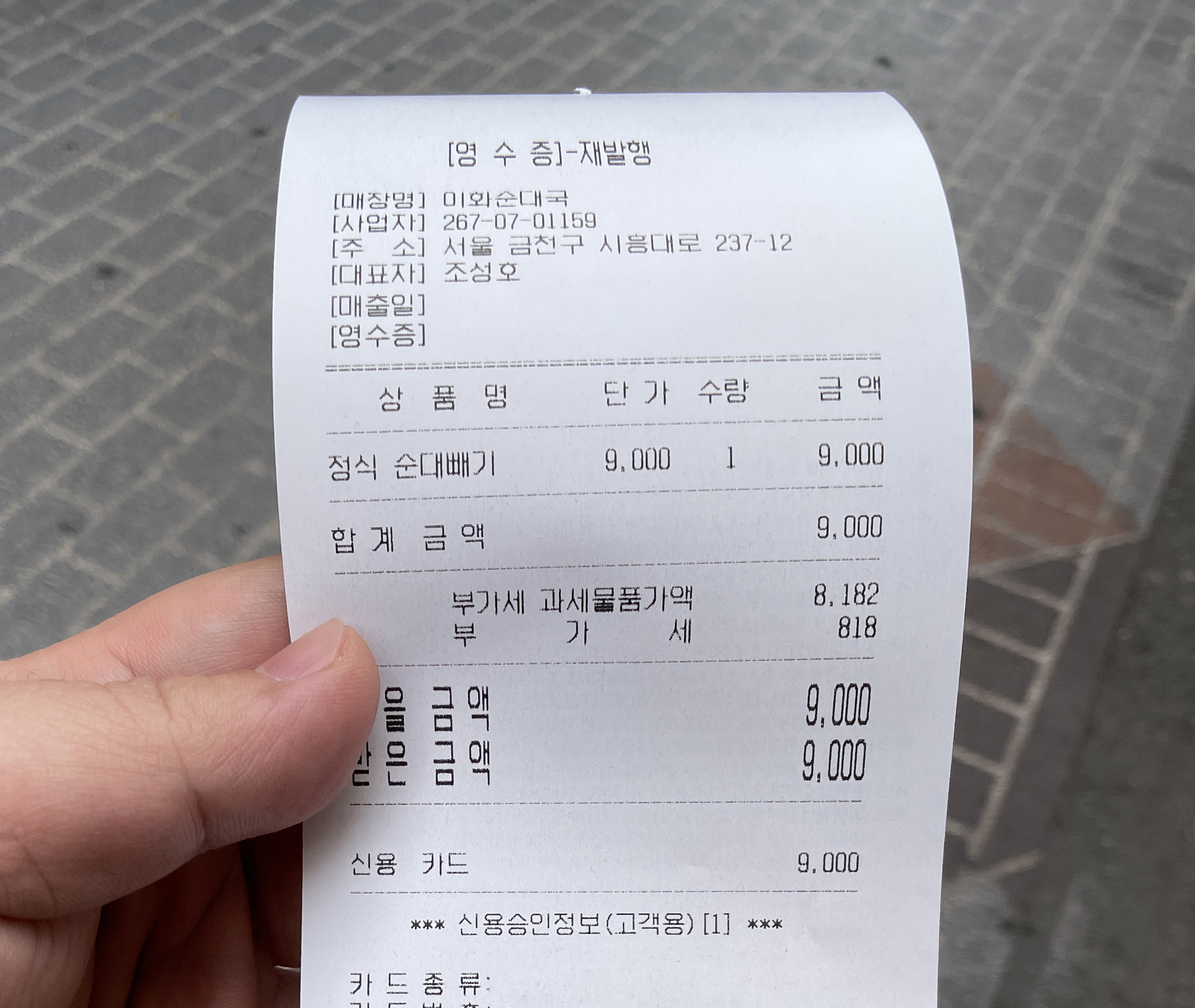 우선 영수증을 보고 가시죠. 분명 주문받을 때는 정식 순대빼기로 주문받아놓고 접시에도 순대를 내어주시고, 순대국에도 순대를 넣어서 나오더라고요. 순대를 분명 빼 달라 말씀드렸는데요. 아주머니께서 "그냥 순대를 건져내서 먹으면 안 되겠냐" 고 하셨는데, 주문 당시부터 순대 빼기로 주문이 안들어갔다면 모를까 순대빼기로 주문을 받아놓으시고 순대가 들어있는 순대국을 주셔서 다시 가져다달라고 했습니다.