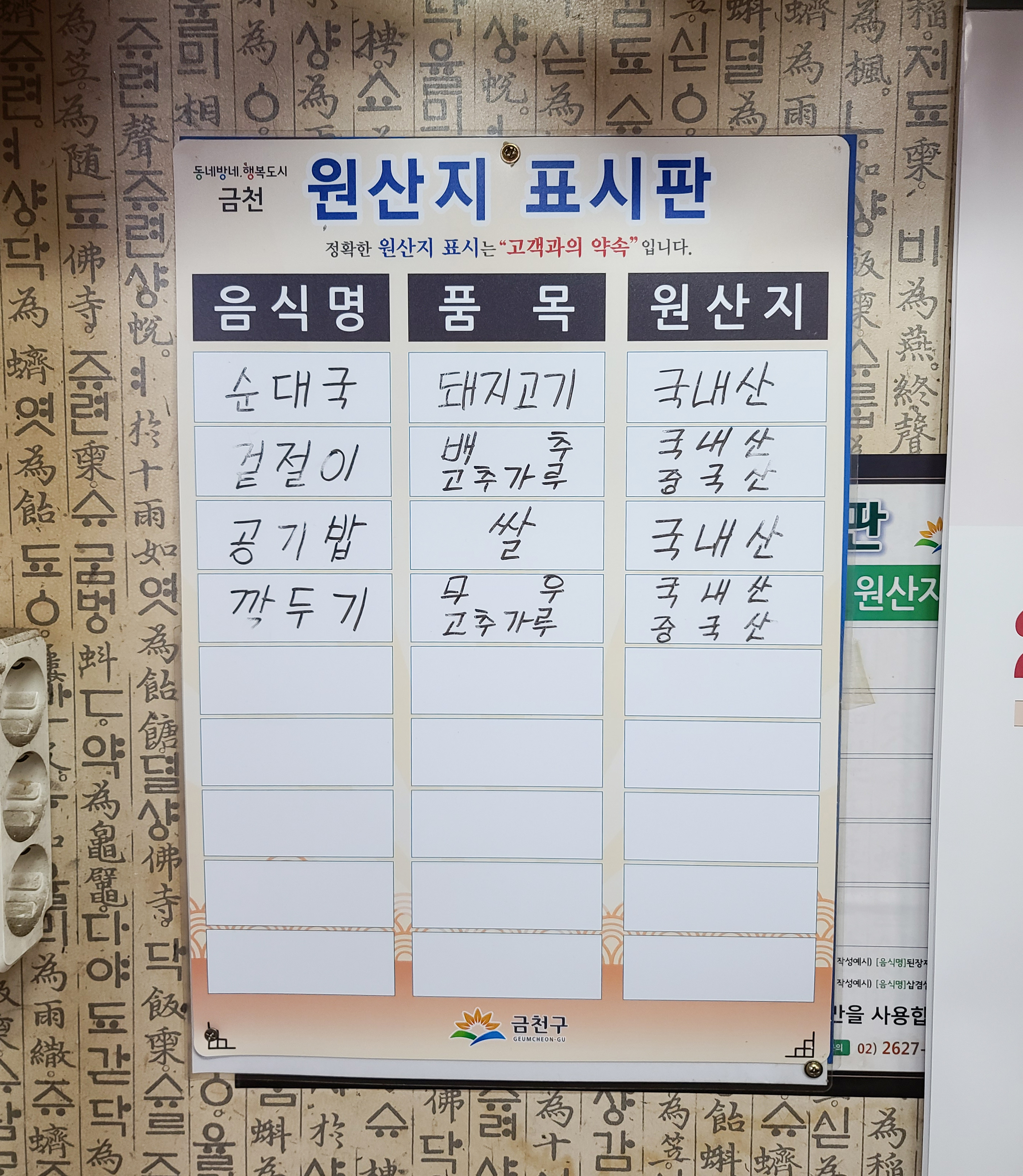 이화순대국의 메뉴는 위와 같습니다. 순대국, 순대, 순대국정식, 특순대국, 특정식, 순대국포장, 술국, 머리고기, 오소리감투, 모듬, 곱창전골이 있었습니다. 금천구 이화순대국의 메뉴들은 고춧가루를 제외한 대부분의 재료를 국내산으로 사용하고 있었습니다. 저는 순대국과 머릿고기 등이 나오는 순대국정식(순대빼기)을 주문했습니다.