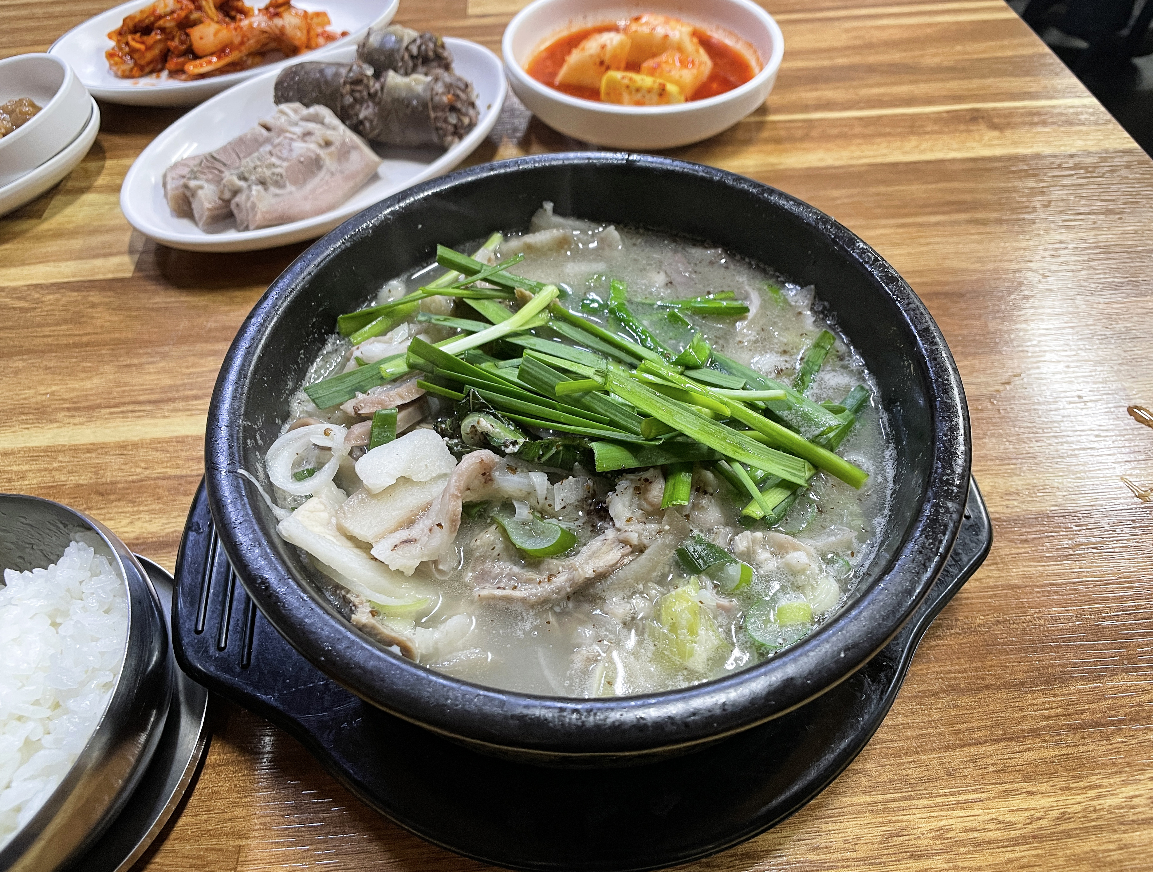 기본으로 나오는 반찬은 부추와 배추김치, 무김치, 고추, 양파, 쌈장 등이 있었습니다. 제가 시킨 정식 메뉴에는 머릿고기 수육과 순대가 한 접시 담겨 나왔습니다. 주문받으실 때는 분명 "정식에도 순대를 빼드리냐" 고 물어보셔서, 그렇게 되면 그렇게 해달라고 부탁드렸었는데, 순대가 들어있더라고요.