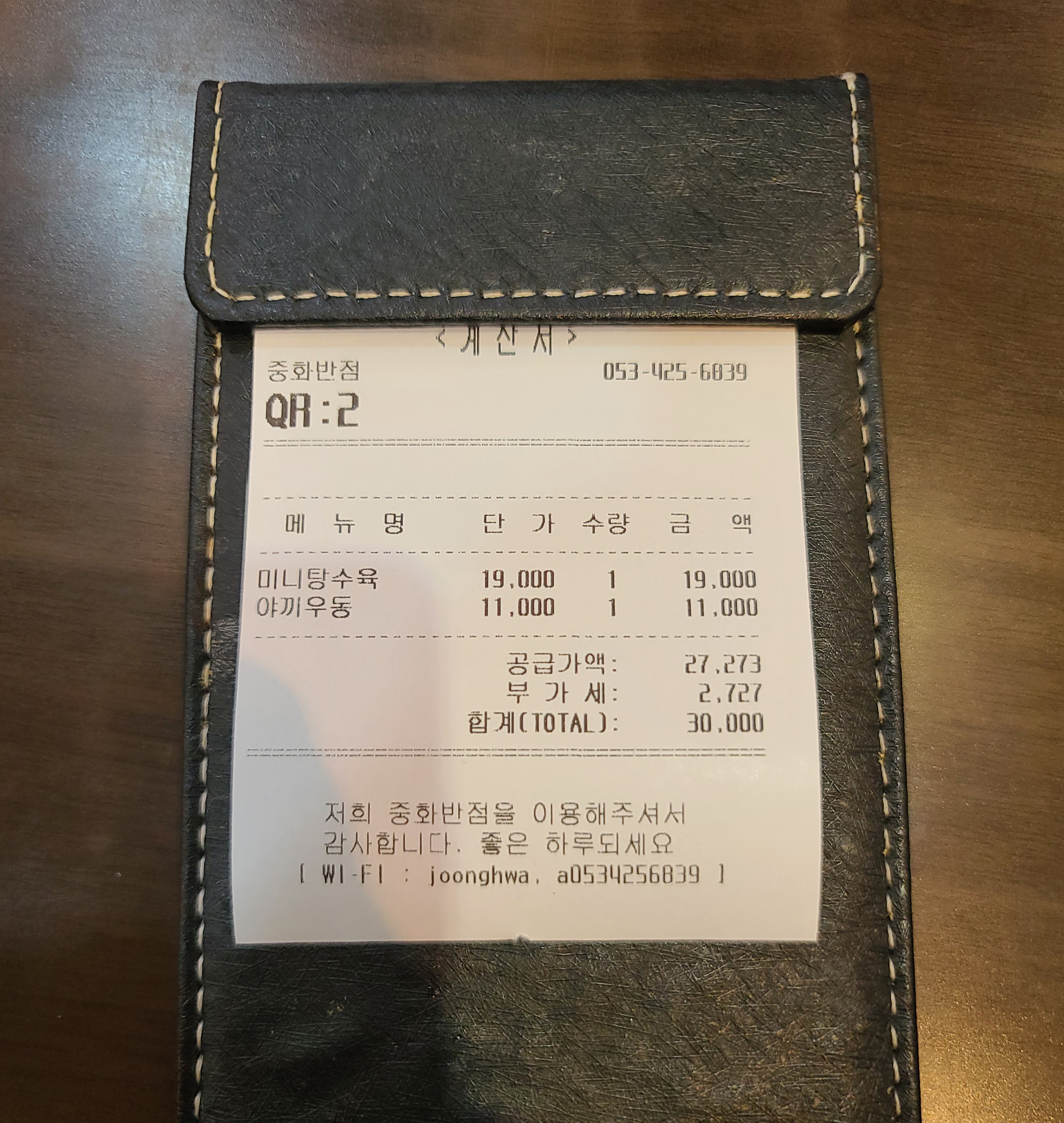 중화반점 야끼우동과 탕수육 두 가지 메뉴를 먹었는데, 탕수육이 더 맛있었던 것 같고, 야끼우동은 기대했던 것보다는 조금 아쉬움이 있었습니다. 그래도 배고픈 상태에서 방문해서 그런지 두 메뉴 모두 다 먹었습니다. 대구 여행을 계획하거나 대구의 원조 야끼우동에 대해 관심이 있으신 분은 한 번 방문해보시는 것도 괜찮을 것 같습니다.