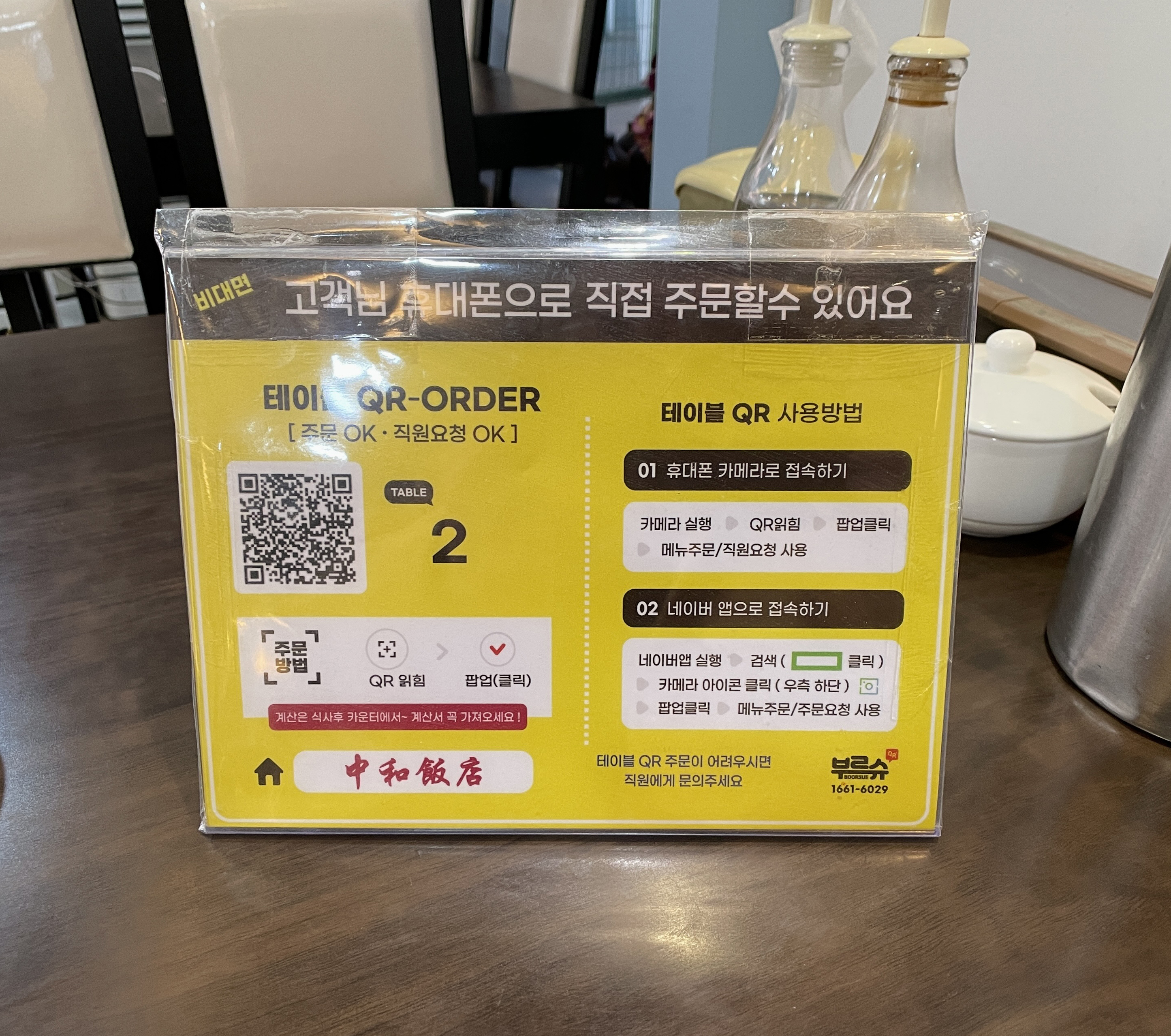 중화반점 내부에 들어가면 오래되어 보이는 가게 인테리어가 눈에 들어왔는데, 독특하게도 주문은 QR코드를 이용해 직원을 부르지 않고 주문할 수 있게 되어있더라고요. 그런데 문득 드는 생각은 "복잡한 주문 방법에 대해 일일이 안내하는 과정을 생략하고 직접 주문받으면 더 빠를텐데" 라고 생각이 들더라고요. 대구 중화반점의 메뉴는 아래와 같습니다.