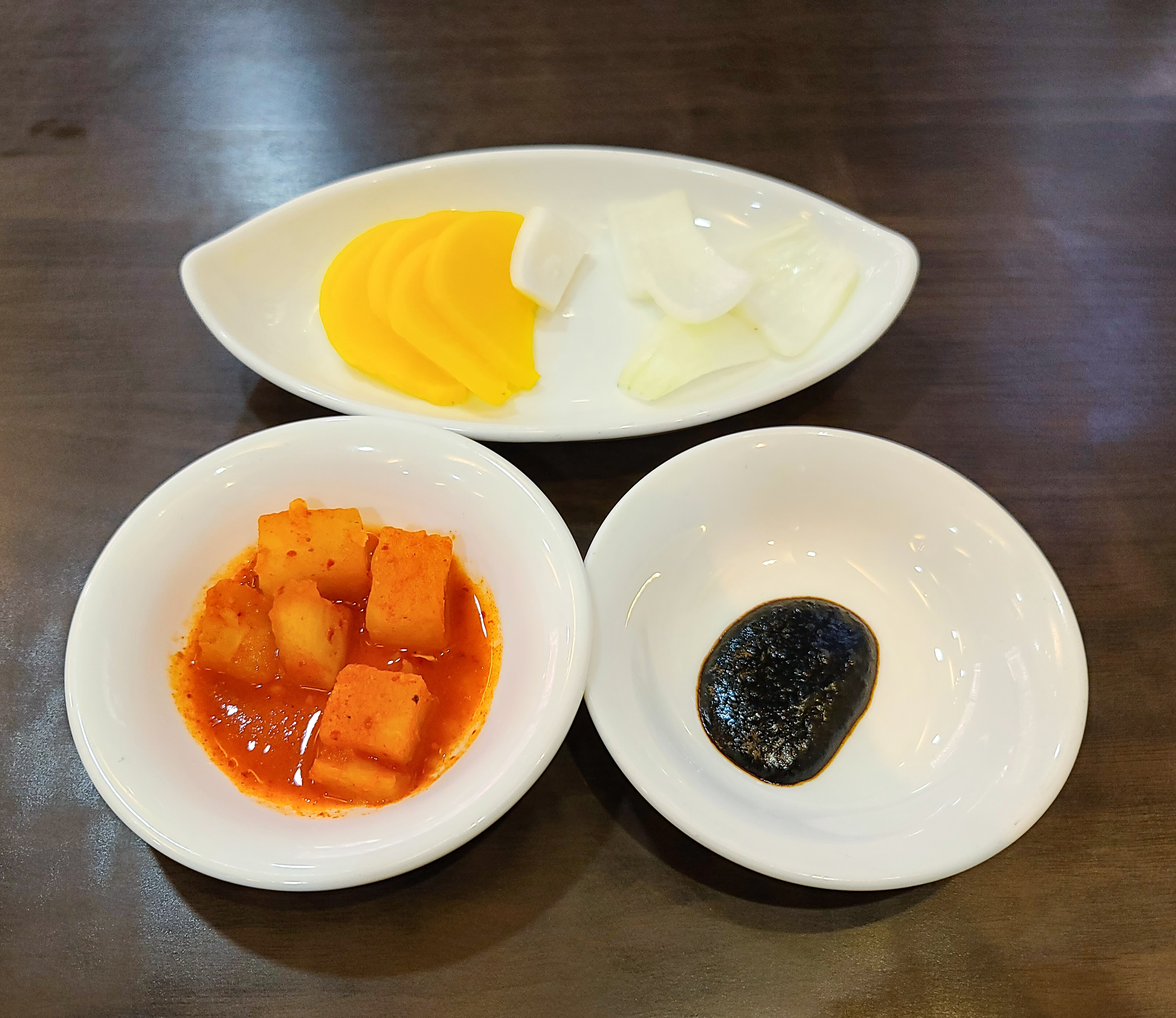 음식 주문하고 대기시간이 조금 있었고, 야끼우동과 반찬(깍두기, 단무지, 양파, 춘장)이 나왔습니다. 반찬은 생각보다 단출했고 야끼우동도 겉보기에는 특별할 것이 없어 보였습니다.