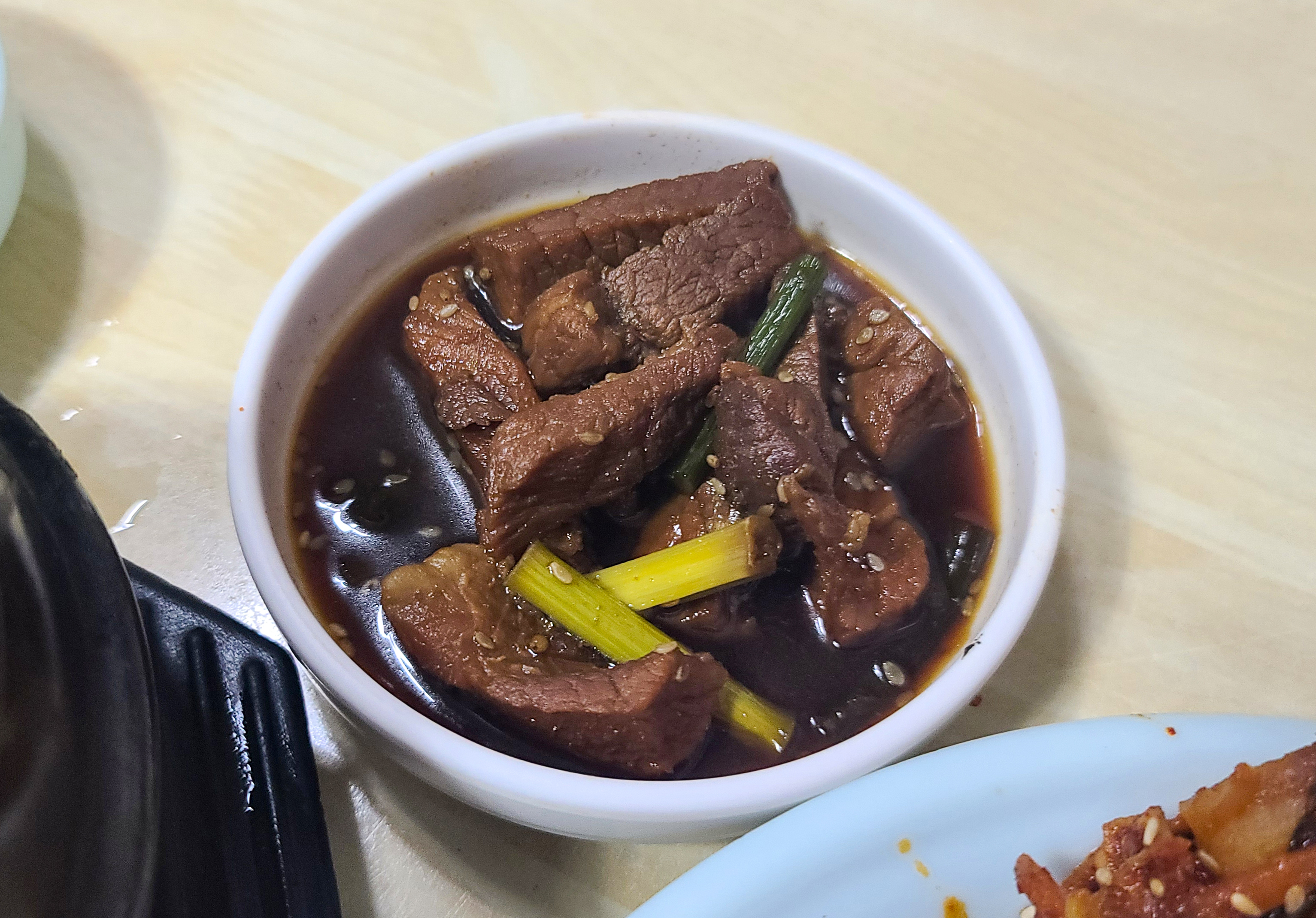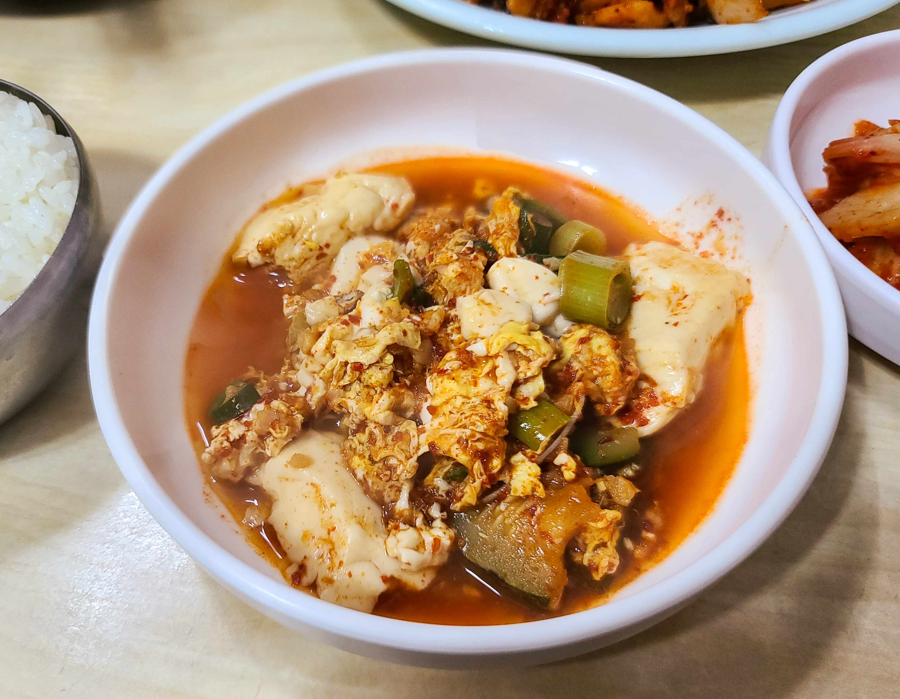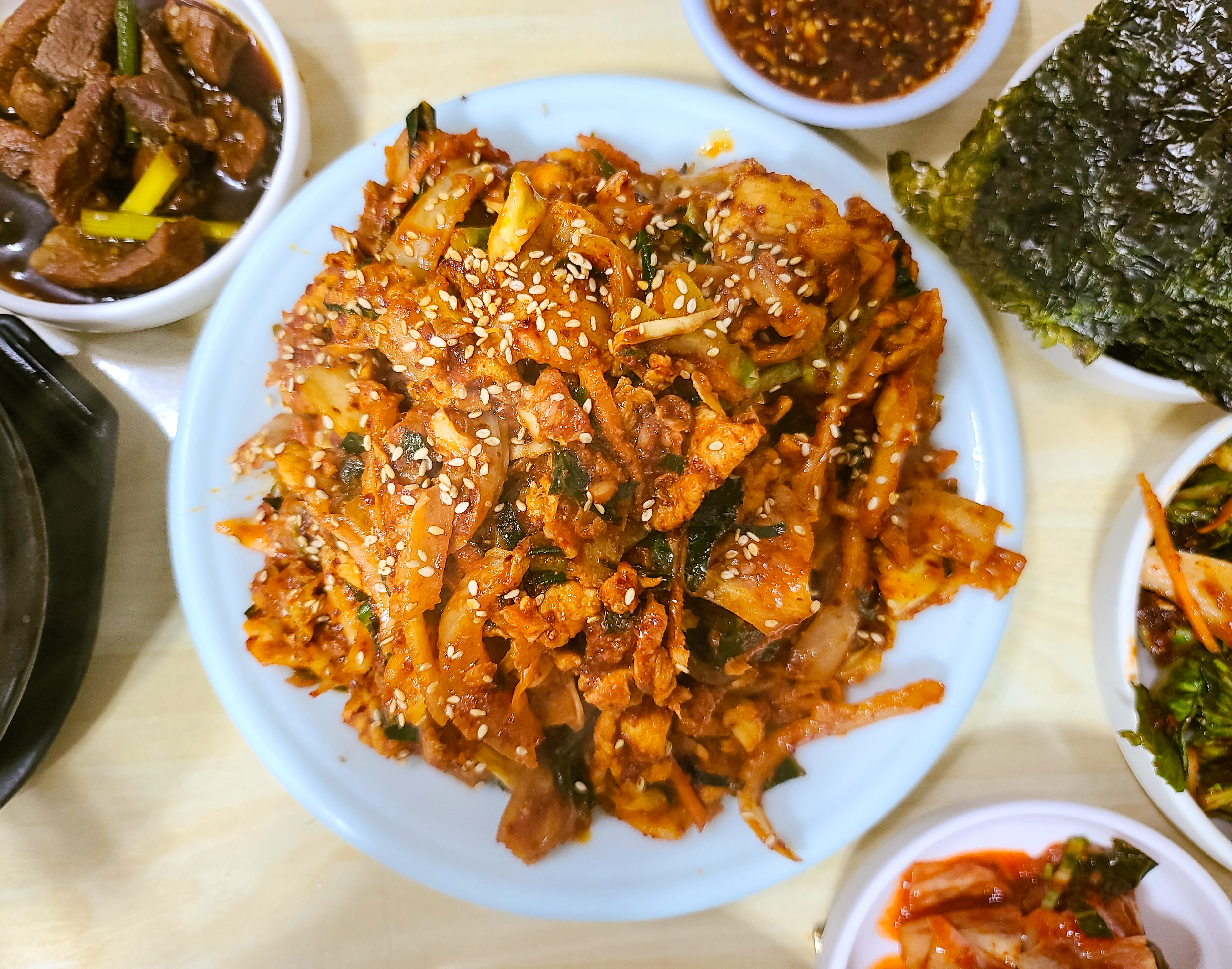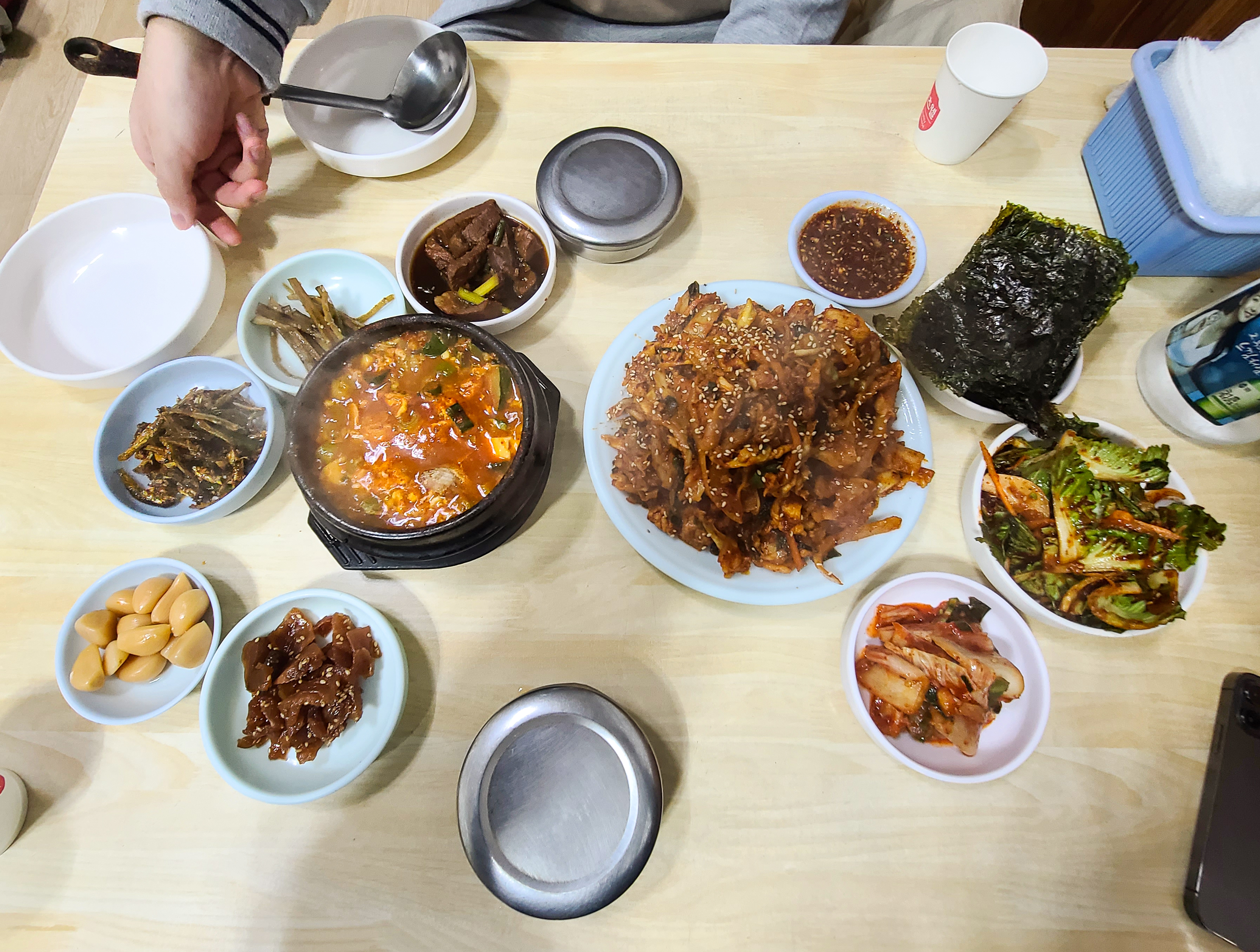 곧이어 주문한 제육볶음, 순두부찌개와 반찬이 나왔습니다. 반찬의 종류도 다양했는데, 소고기 장조림부터 마늘장아찌, 멸치볶음, 상추무침, 배추김치 등이 나왔습니다. 반찬이 워낙 잘 나와서 맨밥만 주문해서 먹어도 괜찮을 것 같은 생각이 들 정도였습니다. 제육볶음은 2인분을 주문했는데, 거의 산더미처럼 쌓아져 나왔고, 순두부찌개는 생각보다 좀 볼품없어 보였습니다.