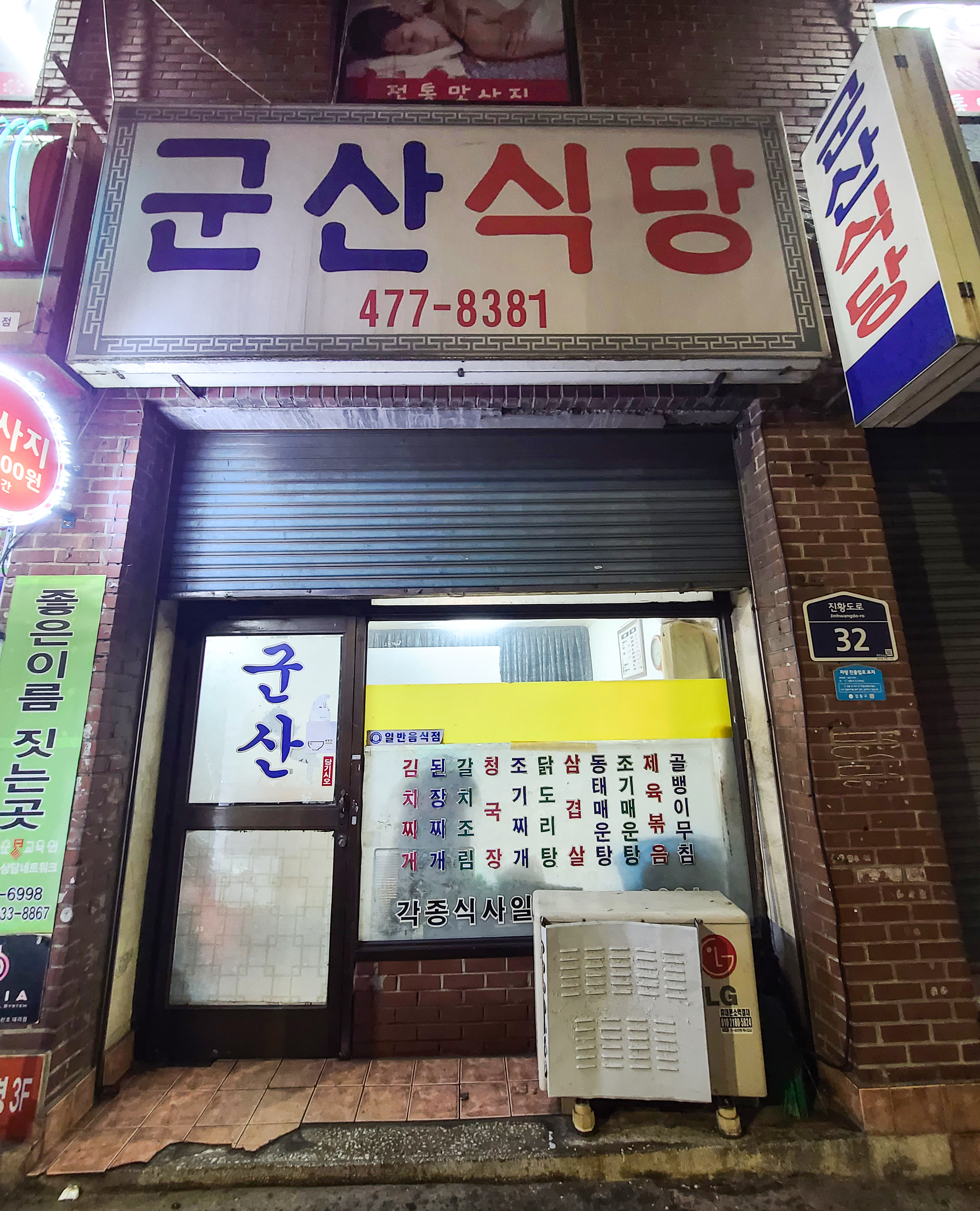 군산식당은 서울 강동구 천호동 397-170, 1층에 위치해 있었습니다. 군산식당의 영업시간은 12:00~ 22:00 까지이며, 매주 일요일은 휴무로 운영 중인 가게였습니다. 제가 방문했을 때는 간판에 불도 안 들어오고 셔터도 살짝 내려와 있어서 영업 종료한 줄 알았는데, 사장님께서는 개의치 않고 장사하시는 것 같더라고요.