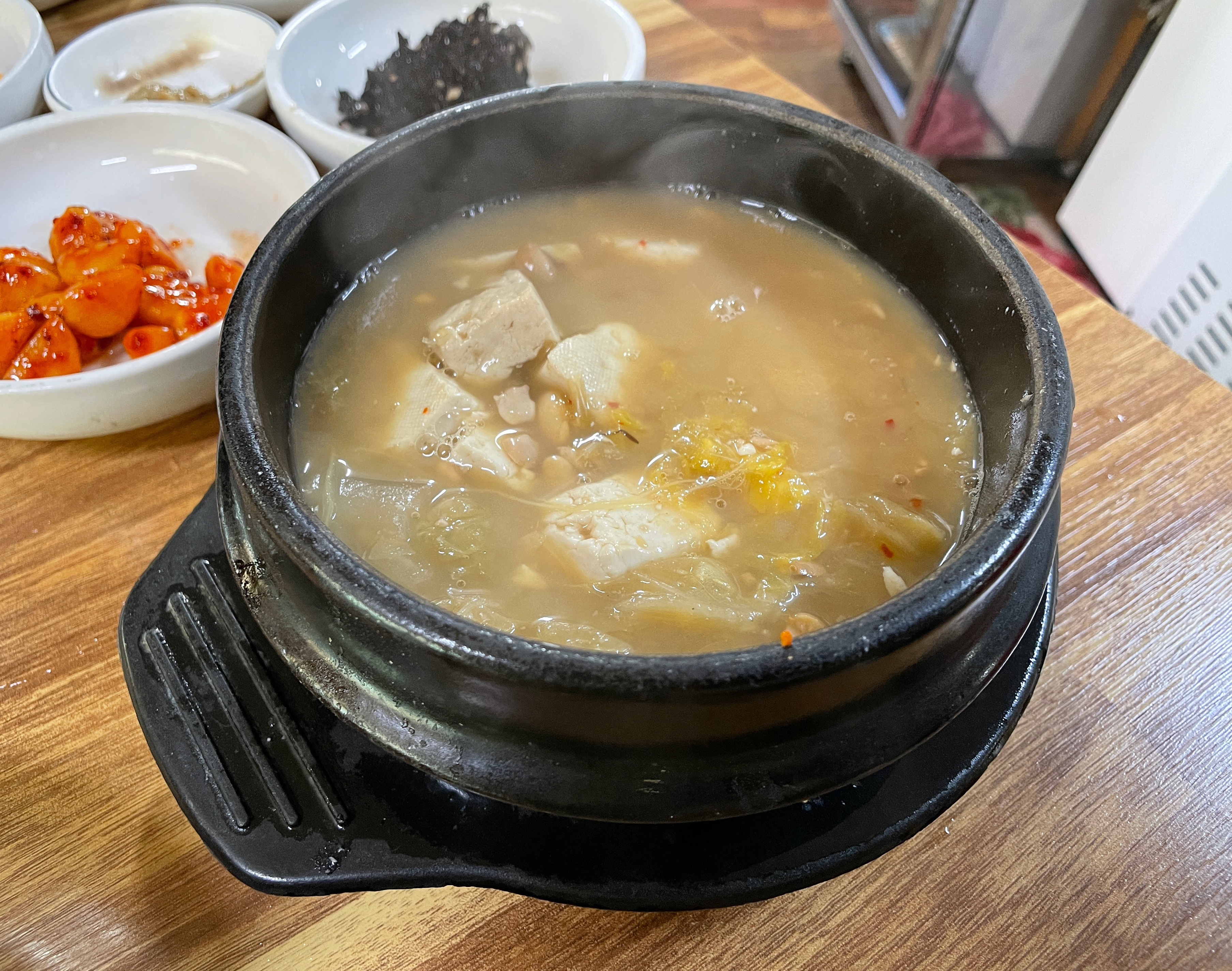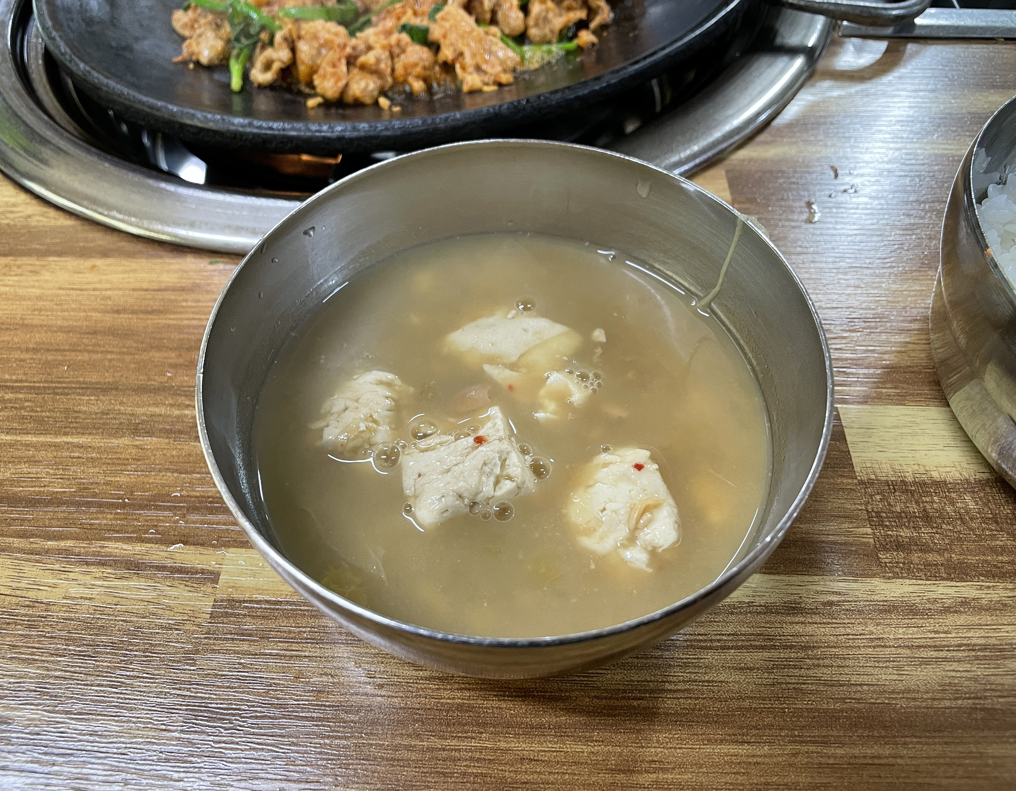 청국장은 꼬릿한 냄새가 심하게 나지는 않았고, 적당히 부드러운 맛의 청국장이었습니다. 특별한 재료는 들어가지 않았지만, 그럭저럭 주물럭에 곁들여서 먹을만한 청국장이었습니다.