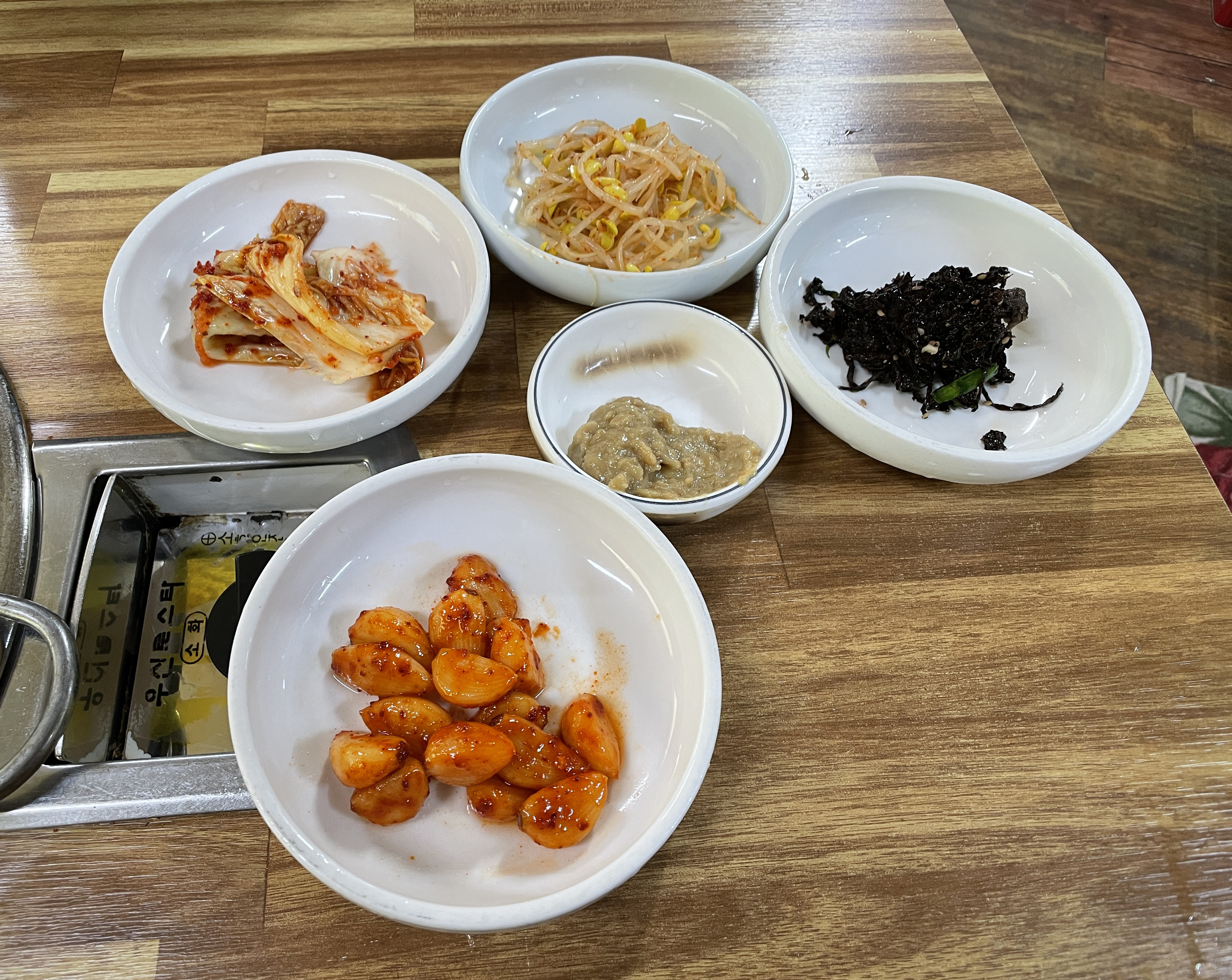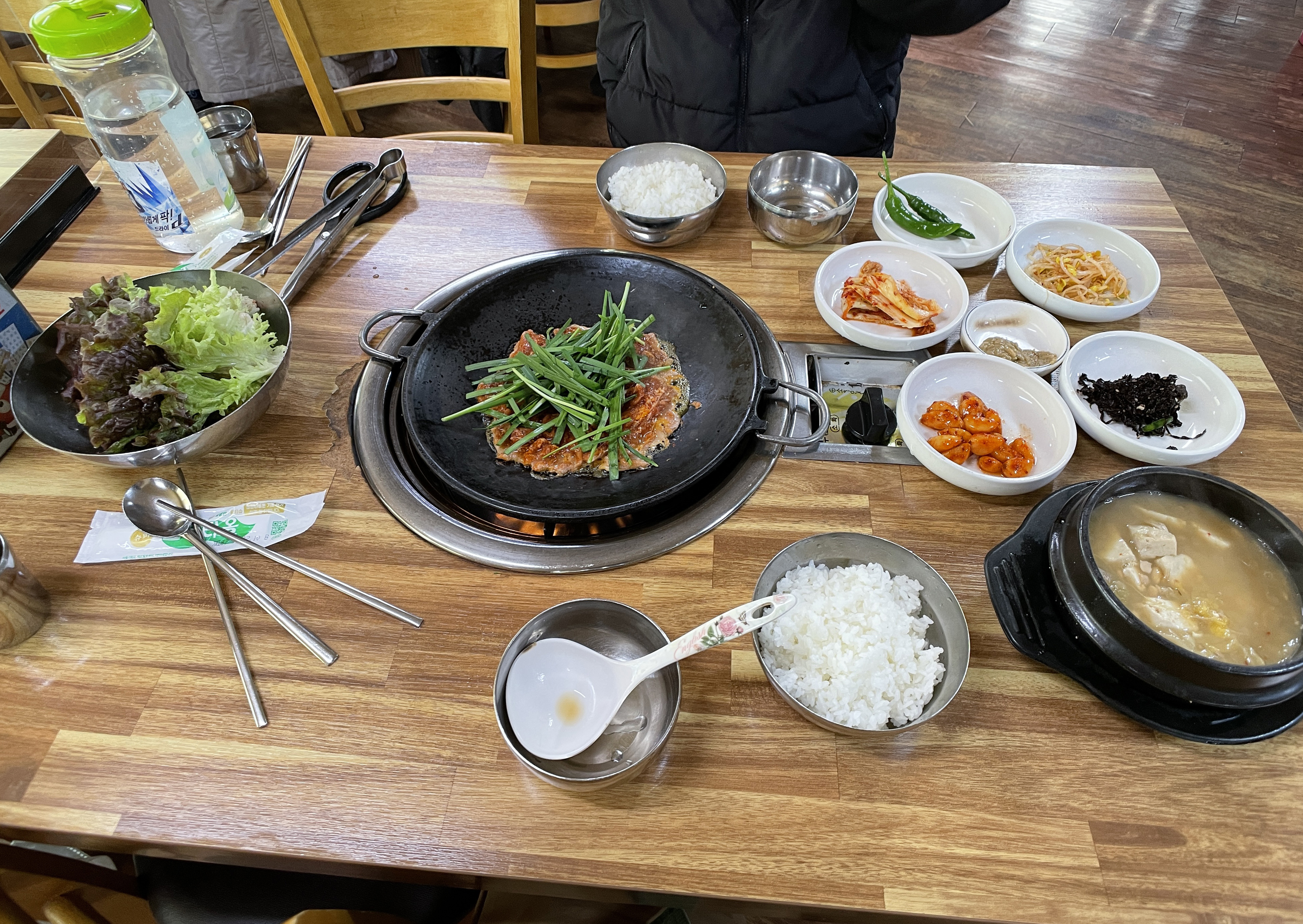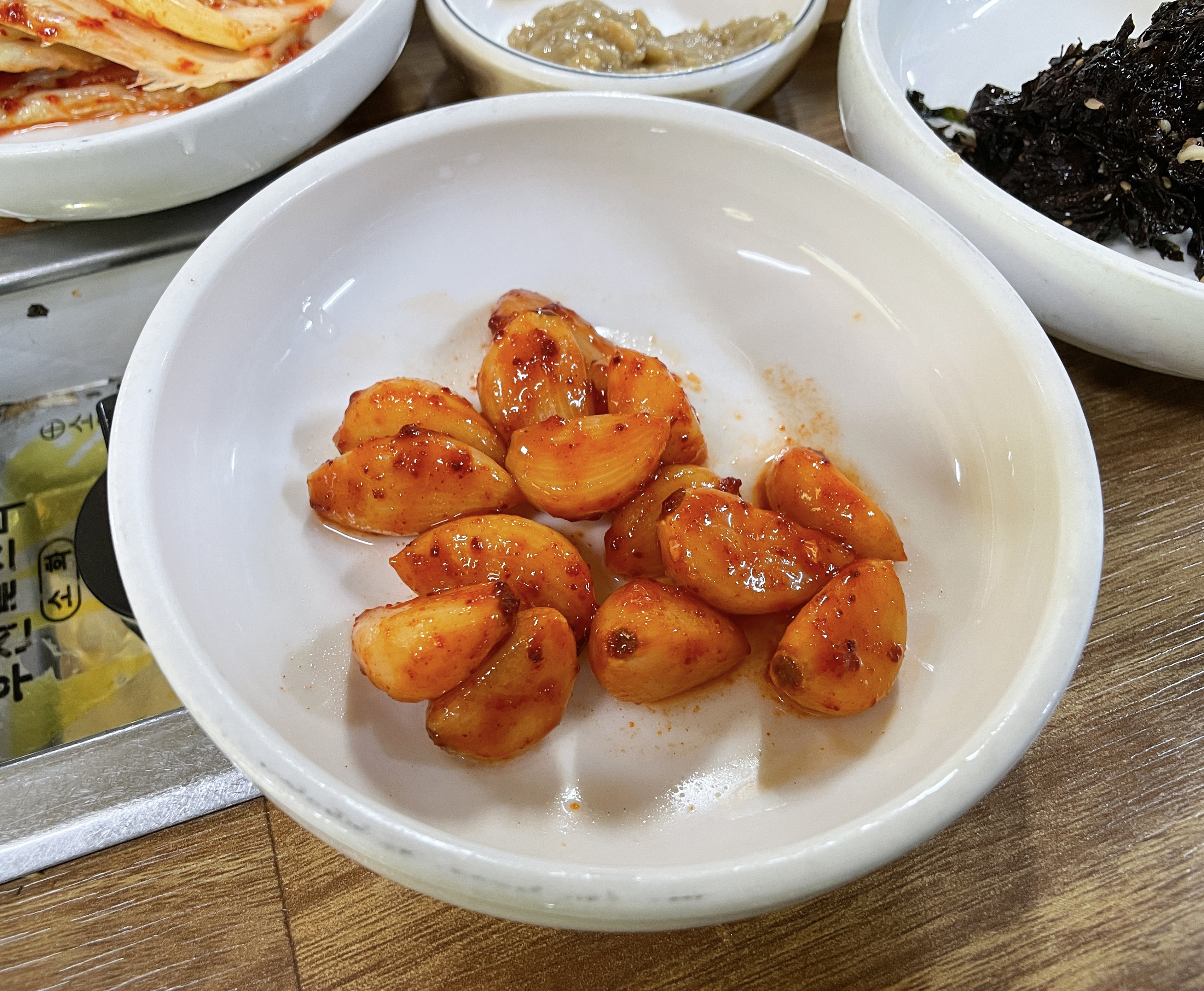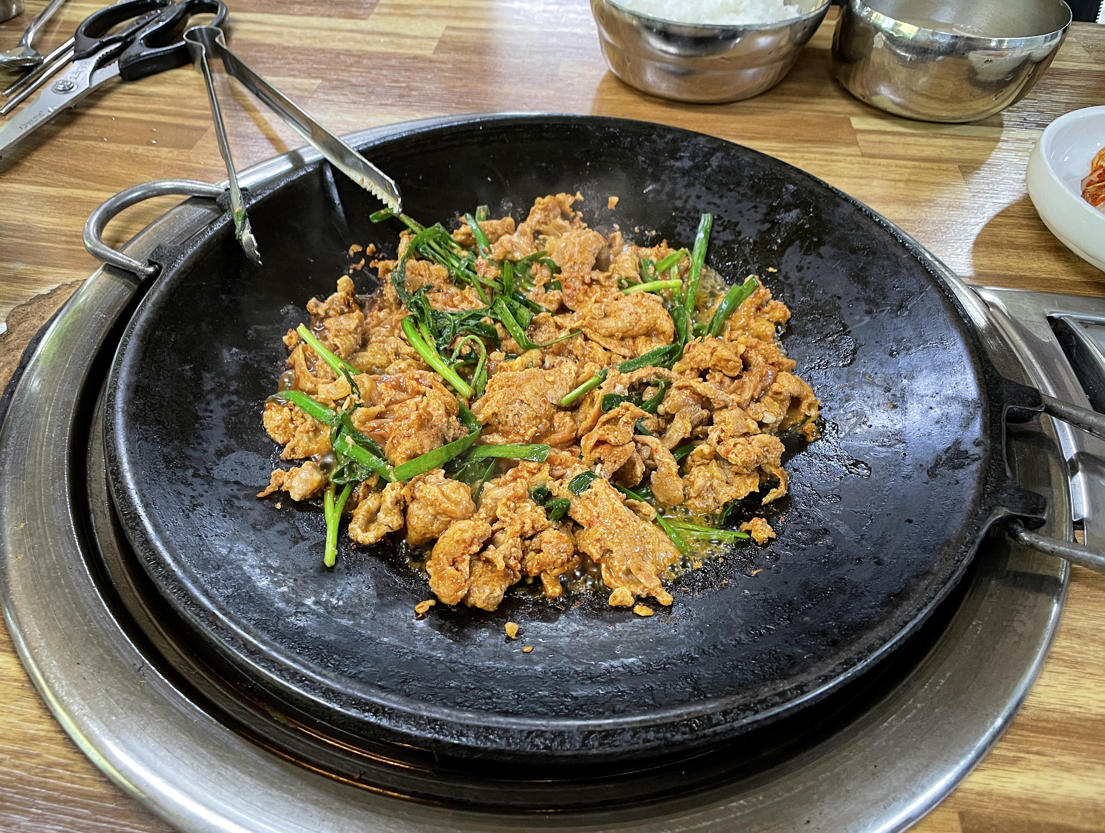 다래식당의 주물럭은 불판 위에 타지 않도록 뒤적이며 구워주면 되었고, 청국장은 끓여서 나오기 때문에 적당량 덜어먹으면 되었습니다. 다른 반찬들도 맛있었지만 저는 특히 고추장 마늘장아찌가 맛있더라고요. (특히 주물럭과 잘 어울렸습니다.)