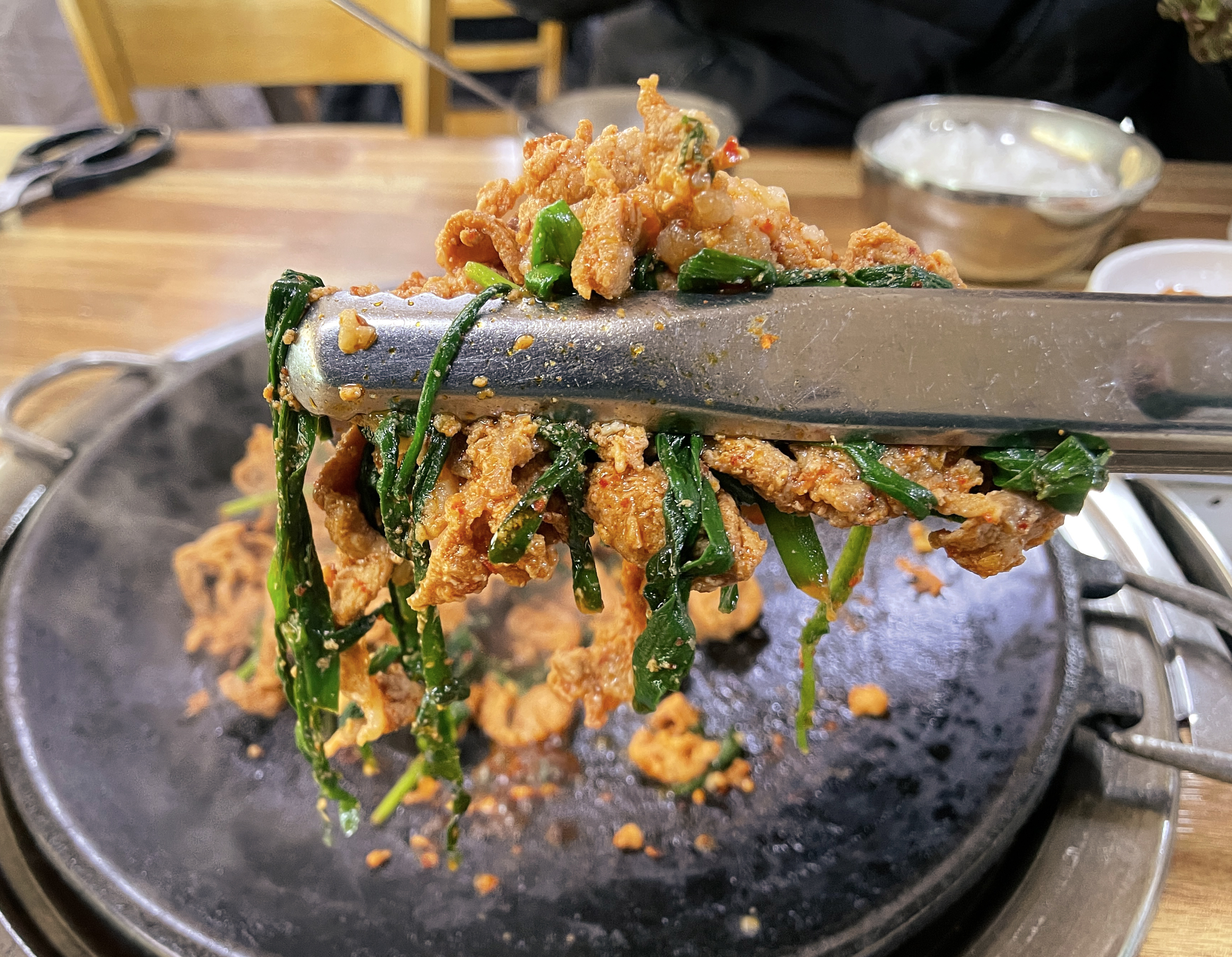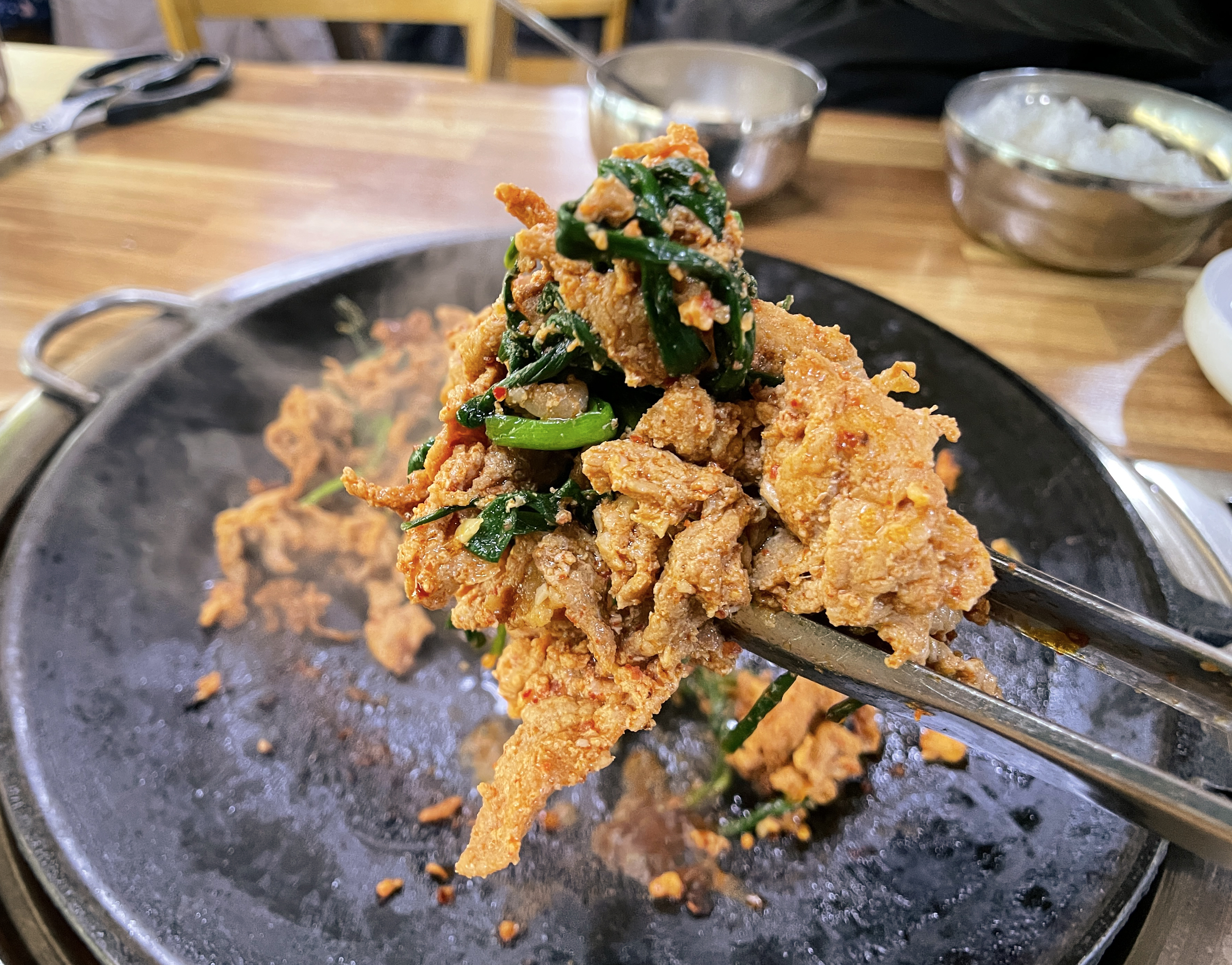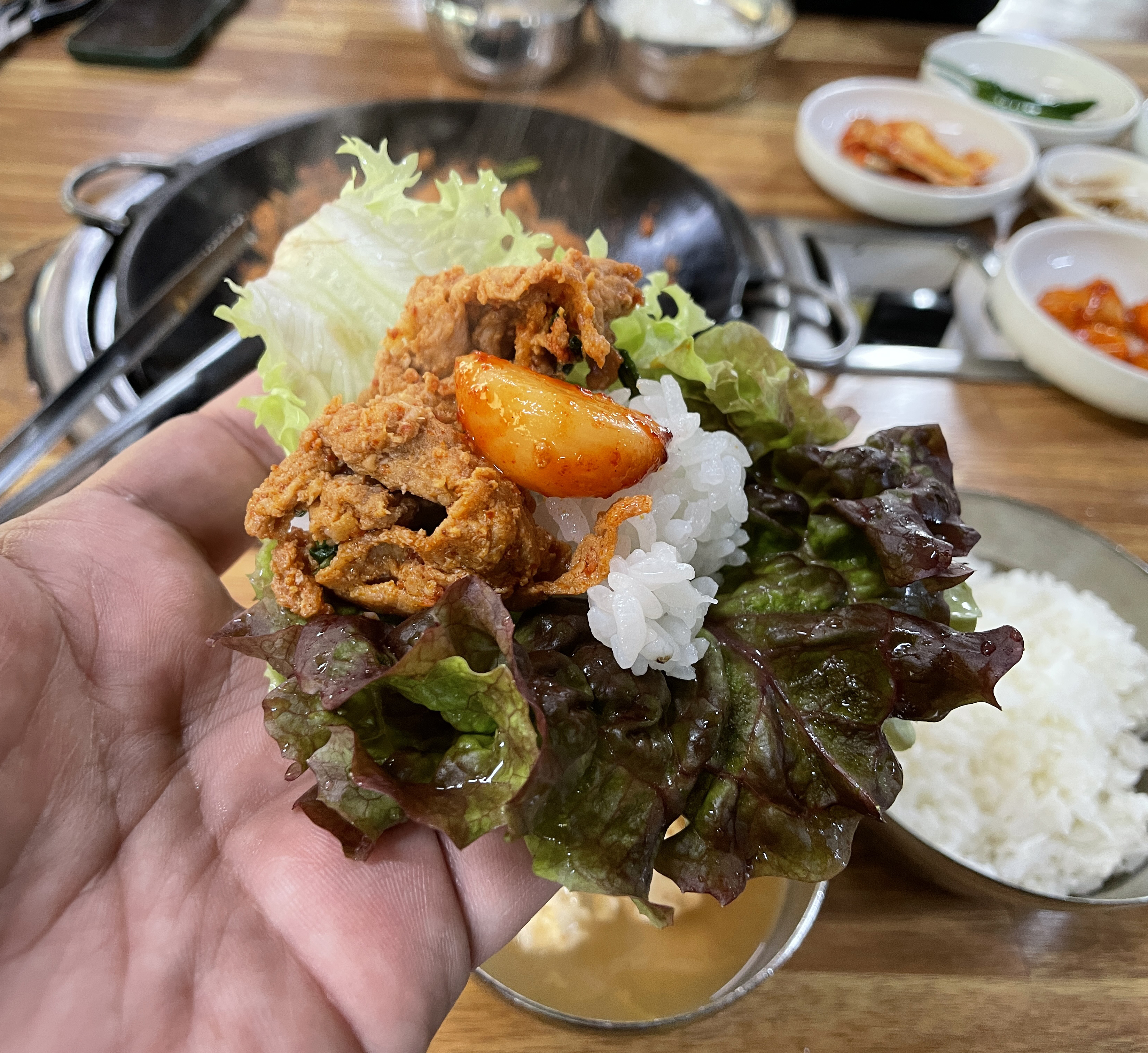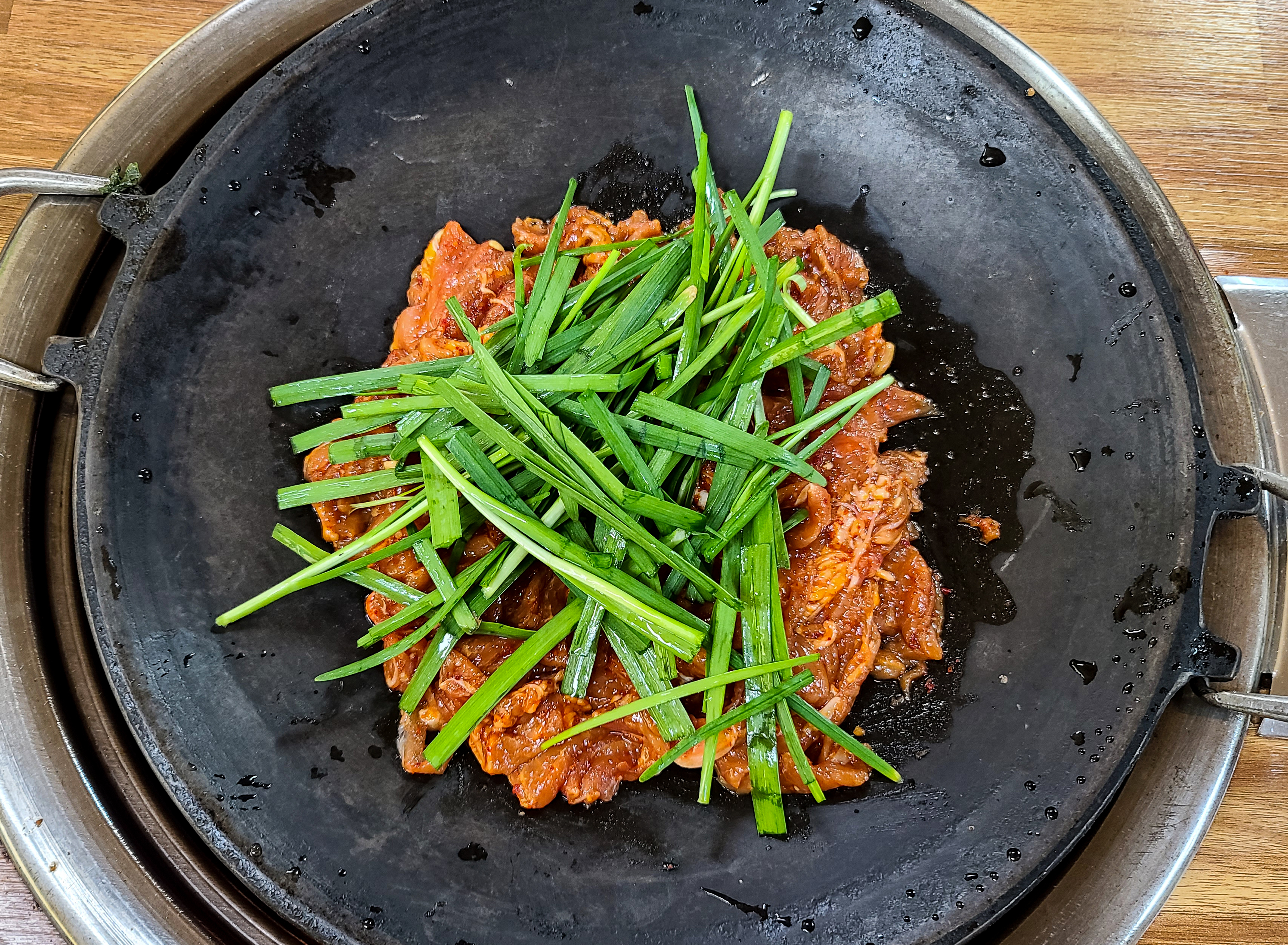 다래식당의 주물럭은 불판 위에 타지 않도록 뒤적이며 구워주면 되었고, 청국장은 끓여서 나오기 때문에 적당량 덜어먹으면 되었습니다. 다른 반찬들도 맛있었지만 저는 특히 고추장 마늘장아찌가 맛있더라고요. (특히 주물럭과 잘 어울렸습니다.)
