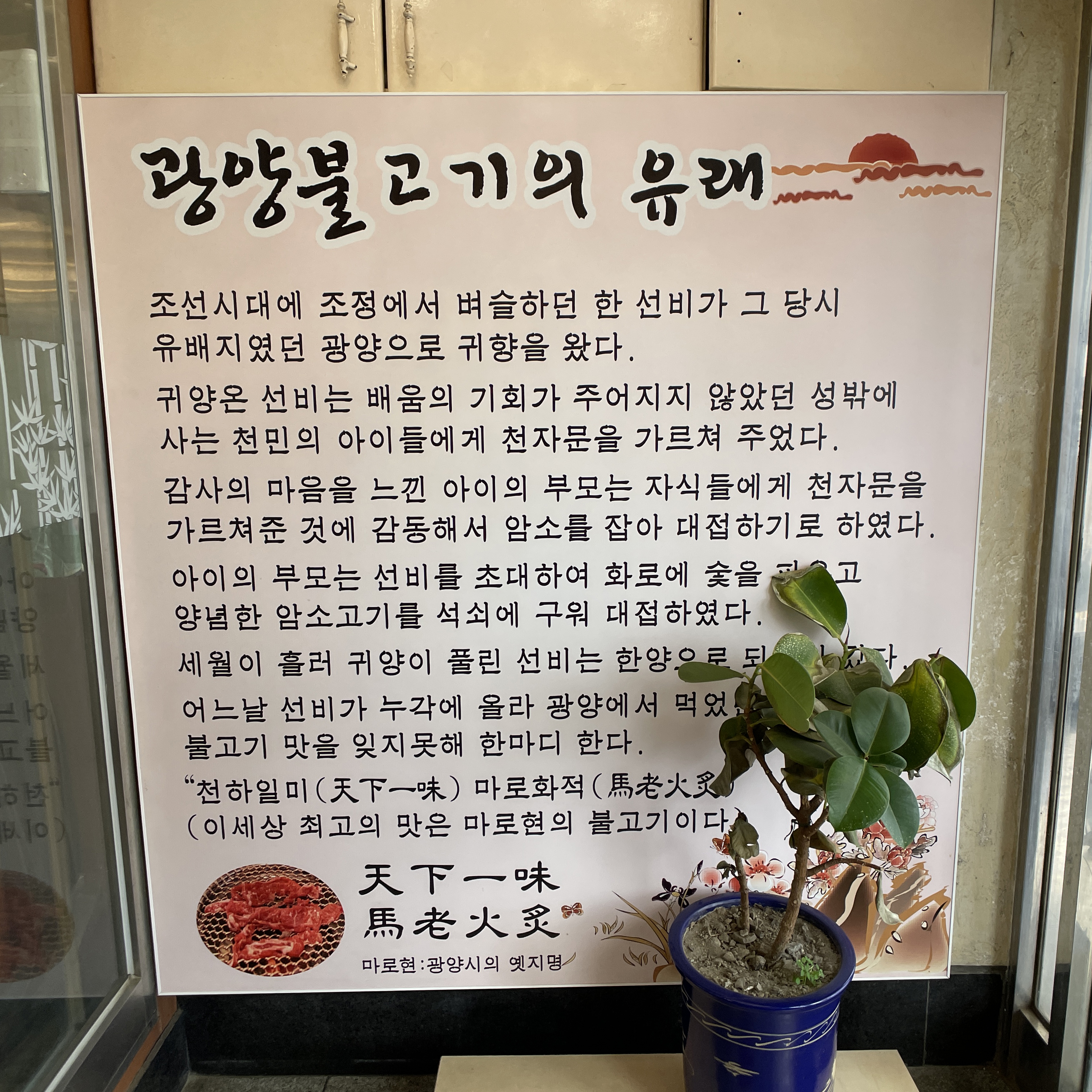 과천 신가네 광양불고기는 꽤 넓은 규모의 식당이었으며, 주차공간도 여유 있게 마련되어 있어서 차량 이용이 편리했습니다. 주차를 마치고 신가네 광양불고기 가게에 들어갔습니다. 가게에는 광양불고기의 유래에 대해 적혀있었습니다.