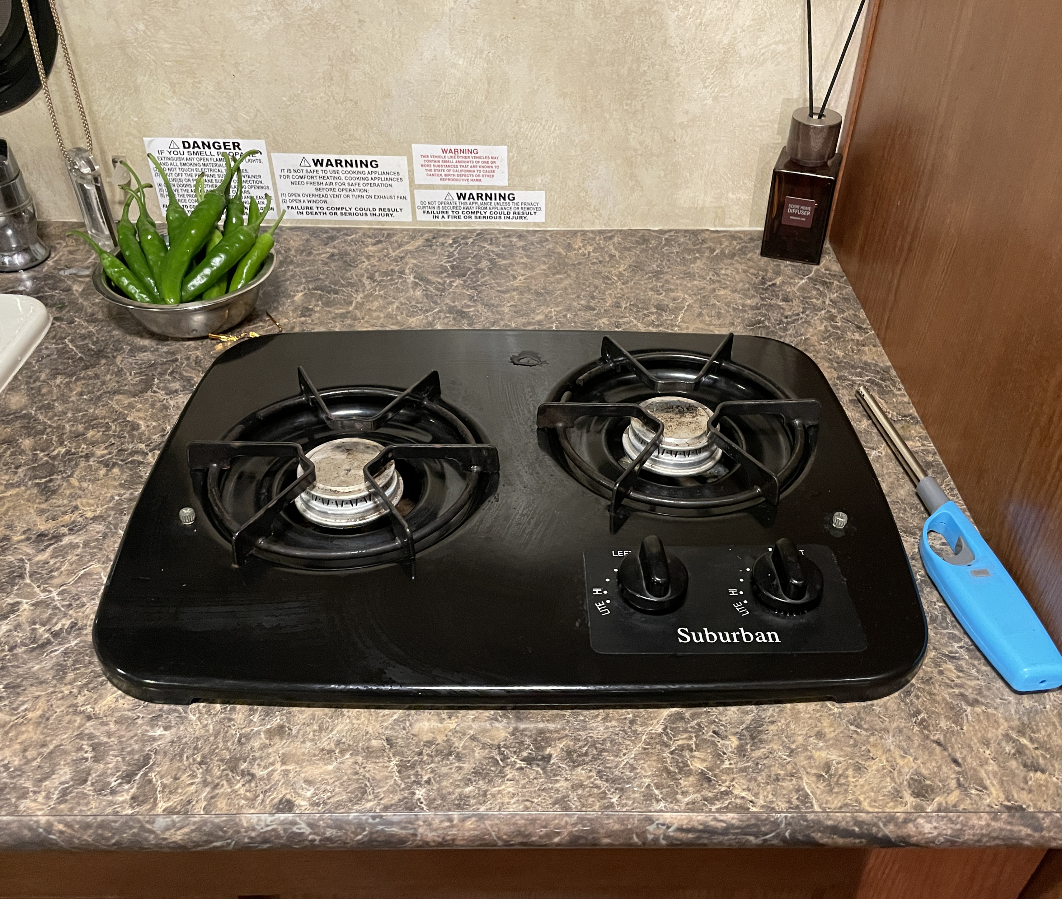 카라반에 싱크대와 가스레인지가 있었지만, 실제 사용하기엔 크기가 작아서 채소를 헹구거나 물 받을 때만 이용하고 나머지는 개수대에서 직접 설거지를 하게 되더라고요. 야외에도 버너가 있어서 밖에서 조리해서 먹다 보니 막상 실내에서는 간식을 먹거나 잠을 자는 용도로만 이용했던 것 같습니다.