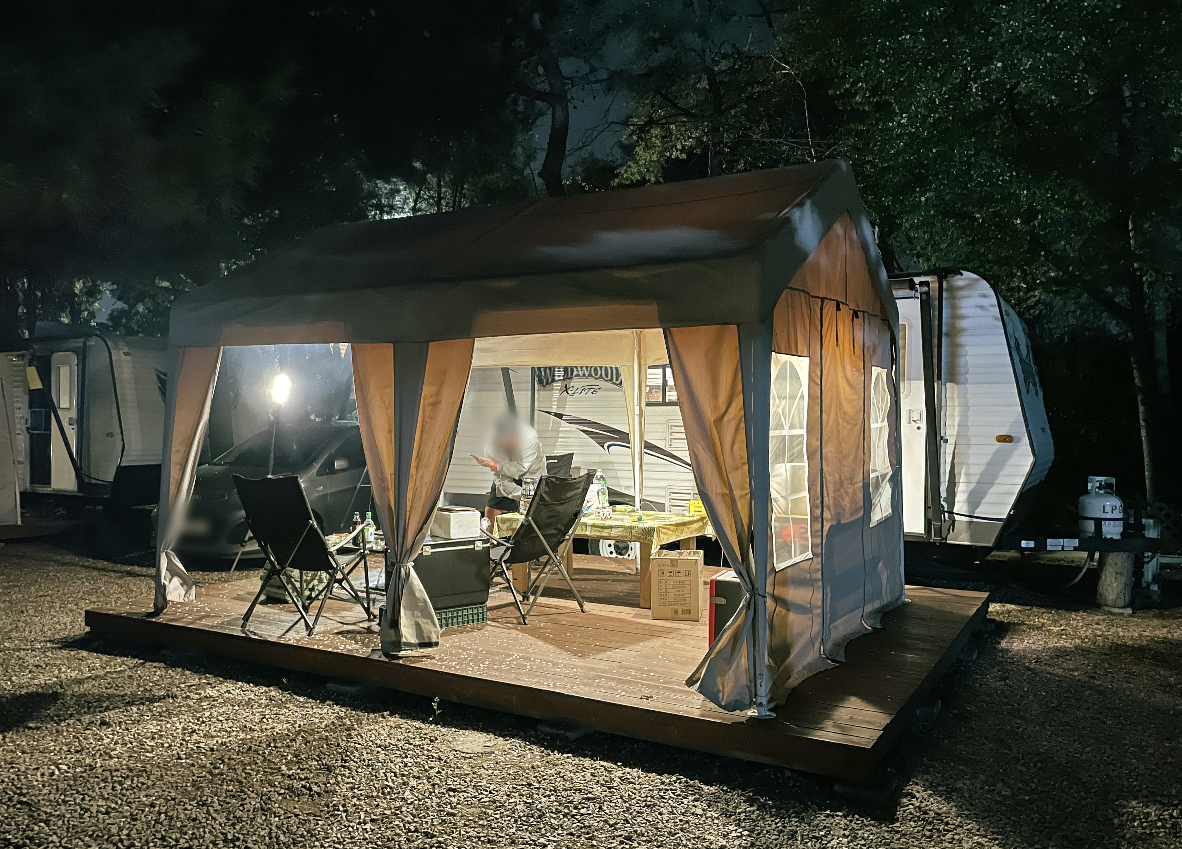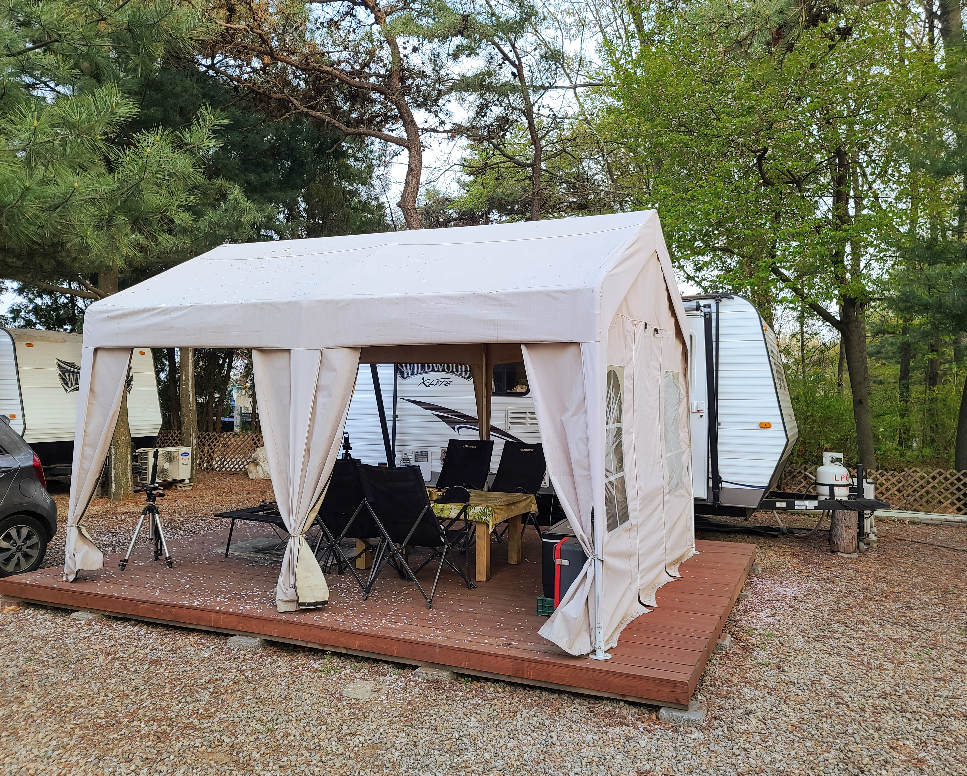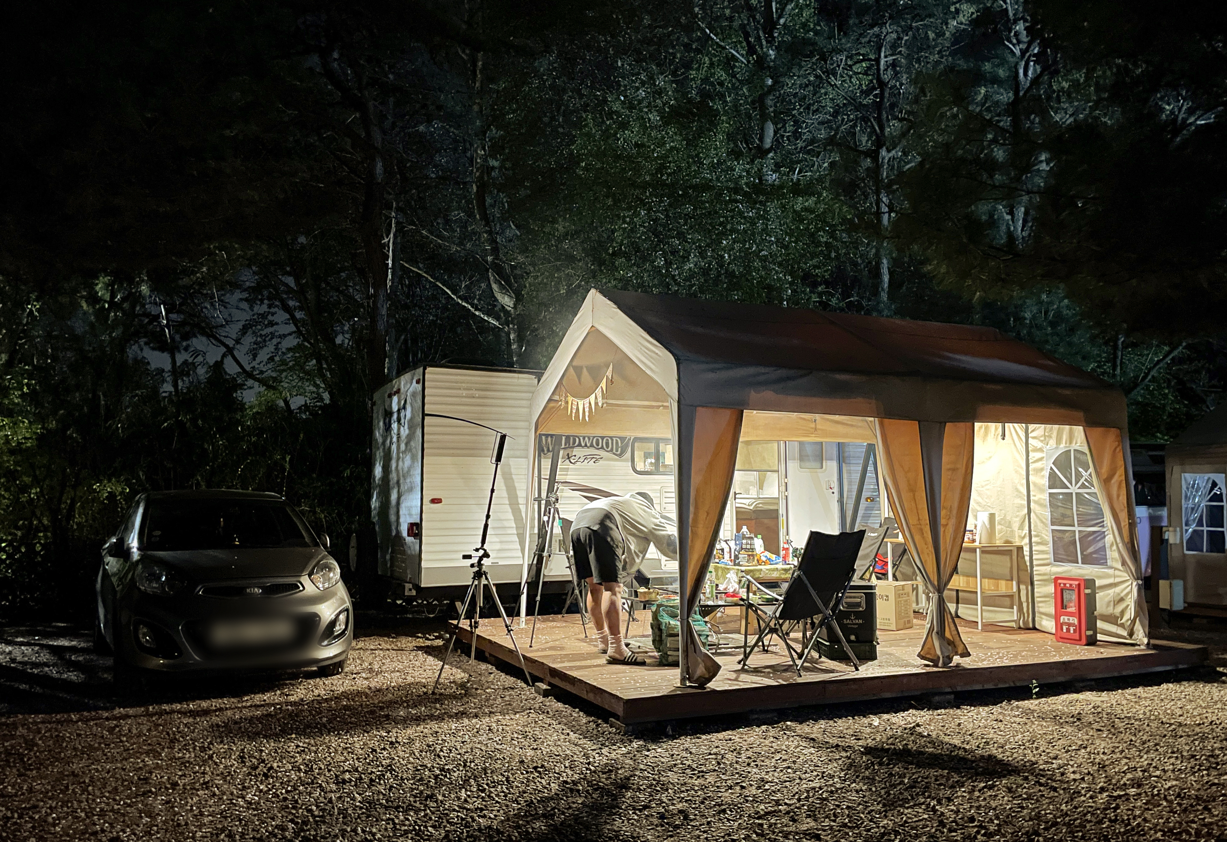 대형 카라반은 개별 주차공간이 마련되어 있었고, 카라반의 실내공간도 여유로워 가족단위 캠핑을 즐기시는 분에게는 매력적인 공간이었습니다. 별도의 테이블과 화로까지 구비되어 있어서 캠핑장 내 매점에서 장작과 숯만 구입하면 편리하게 바베큐를 즐길 수 있었습니다. 저는 경차를 타고 다니다 보니 차량 내 캠핑장비를 둘 여유공간이 없어서 이렇게 글램핑을 즐기곤 하는데, 강화캠핑파크는 서울에서 멀지 않아 종종 찾아가는 글램핑장으로 자리 잡고 있었죠.