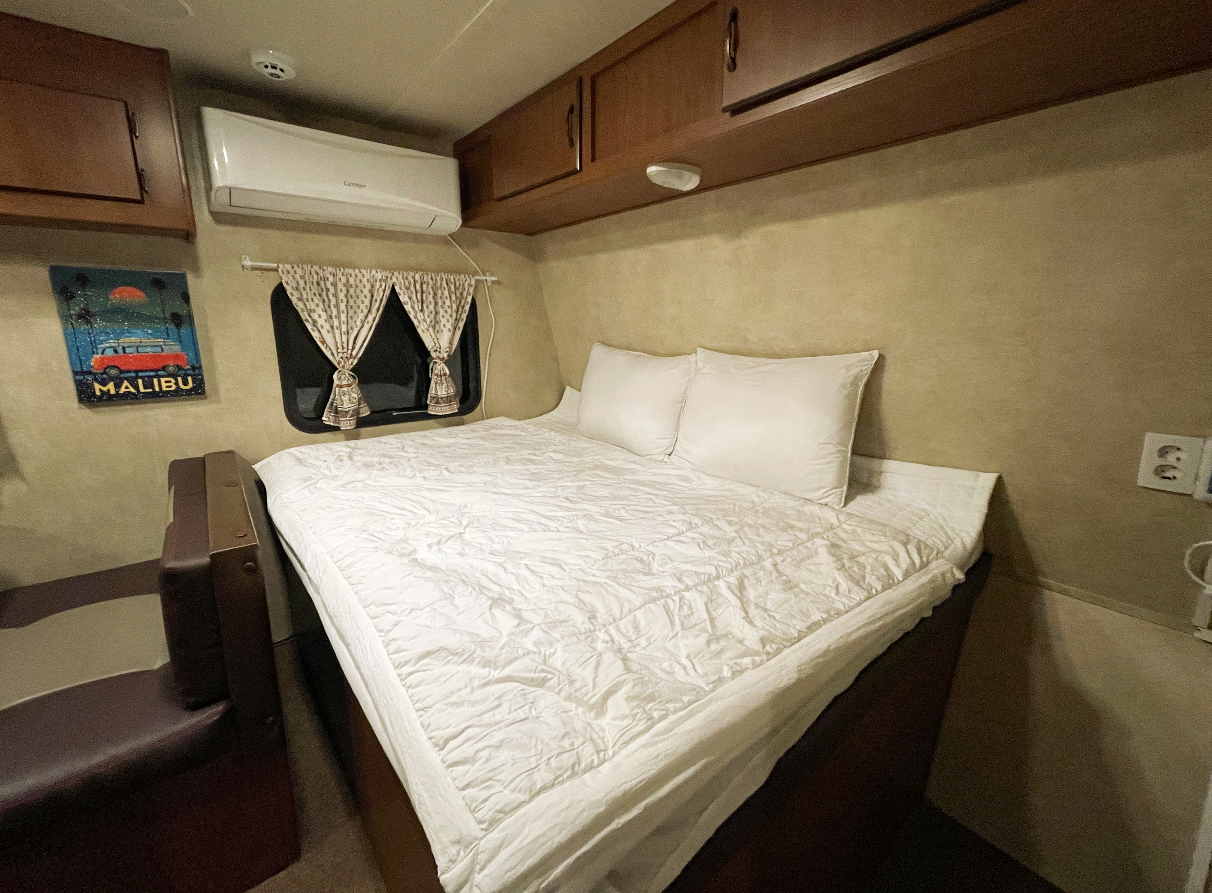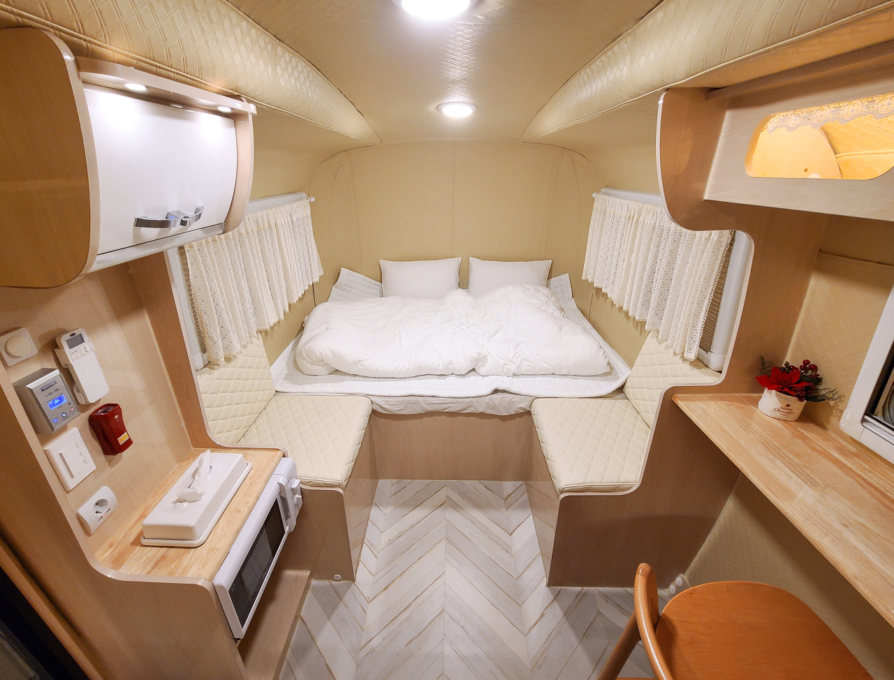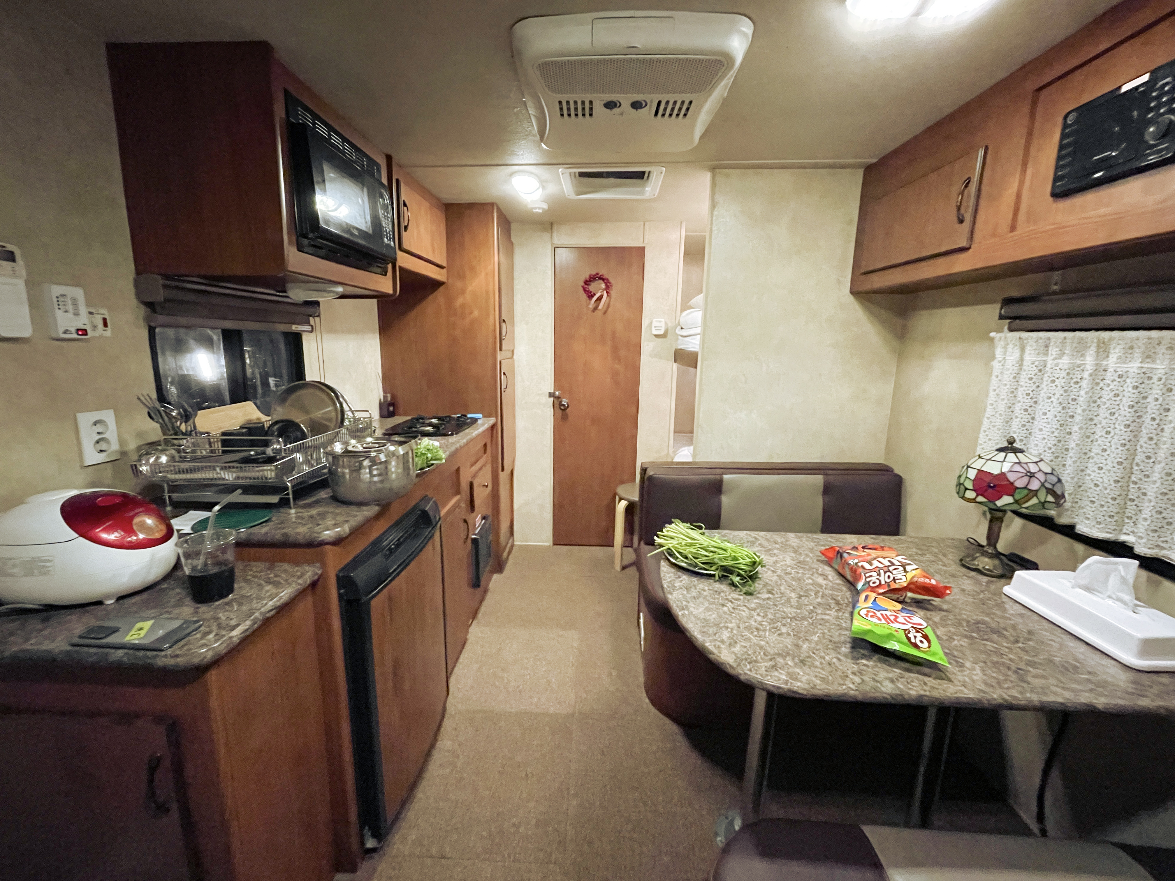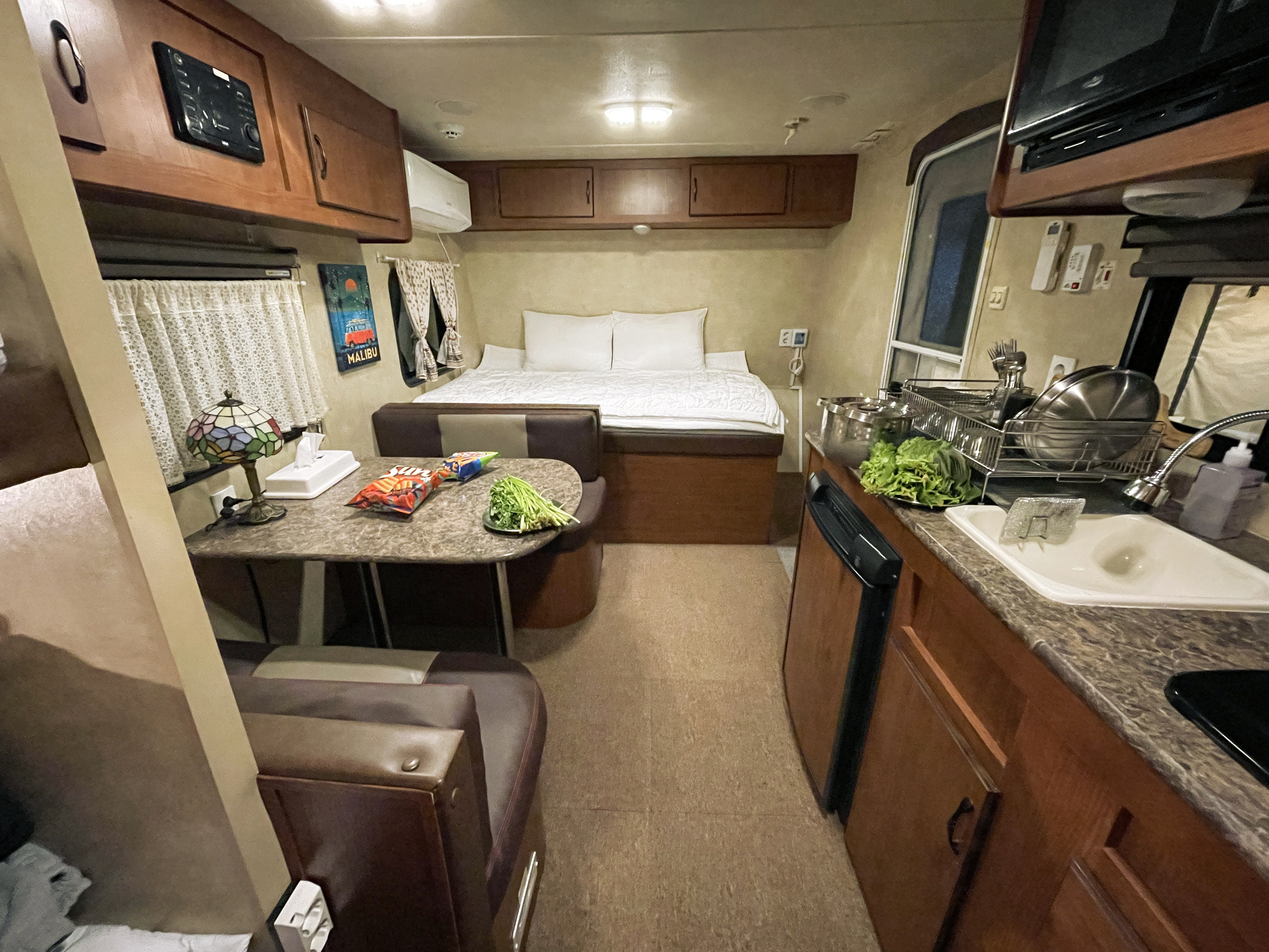 이제 강화캠핑파크의 3~4인용 카라반 안으로 들어가 보실까요? 대형 카라반은 캠핑장 내 다른 시설과 다르게 급수탱크에 100L의 물을 채워주시며, 카라반 내 화장실 시설이 있었지만 화장실은 밖의 공용화장실을 이용하게 되어있었습니다. 싱크대와 가스를 이용한 화로와 냉장고, 전자레인지, 에어컨 등 다양한 가전이 들어있어 편리하게 이용할 수 있었습니다.