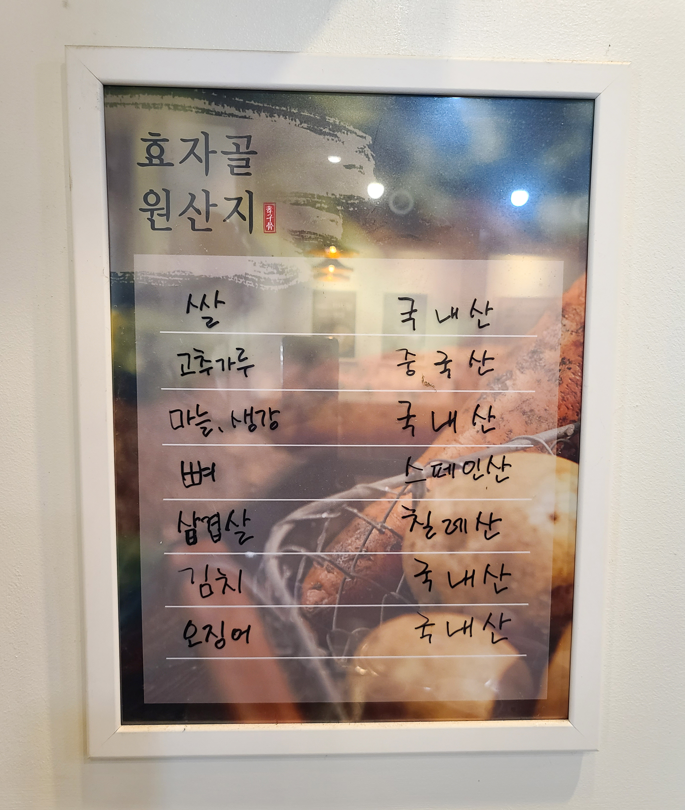 효자골의 메뉴는 감자탕, 뼈해장국, 콩나물해장국이 있었고, 추가 메뉴로 철판삼겹살, 뼈추가, 떡・라면・수제비추가, 볶음밥, 야채추가, 우거지추가 등이 있었습니다. 효자골 감자탕의 독특한 서비스는 감자탕을 주문하면 철판삼겹살을 서비스로 주고 있으며, 떡・라면・수제비도 선택하여 서비스받을 수 있었습니다.