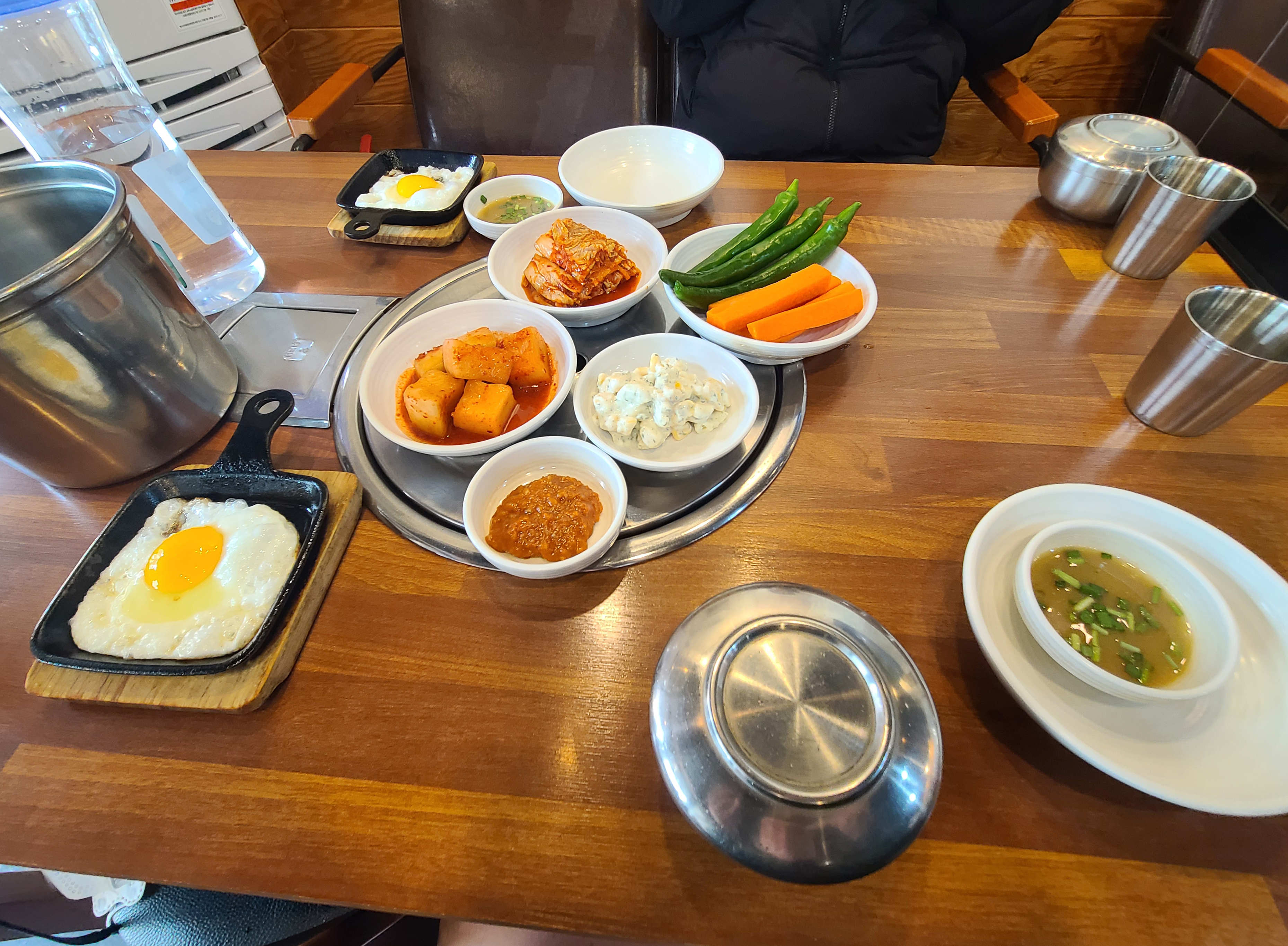 저는 평소 주문하는 대로 뼈해장국을 시켰습니다. 뼈해장국은 마카로니 샐러드와 깍두기, 배추김치, 고추, 당근과 함께 달걀 프라이가 나왔습니다. 공기밥은 기본으로 제공되었고요.