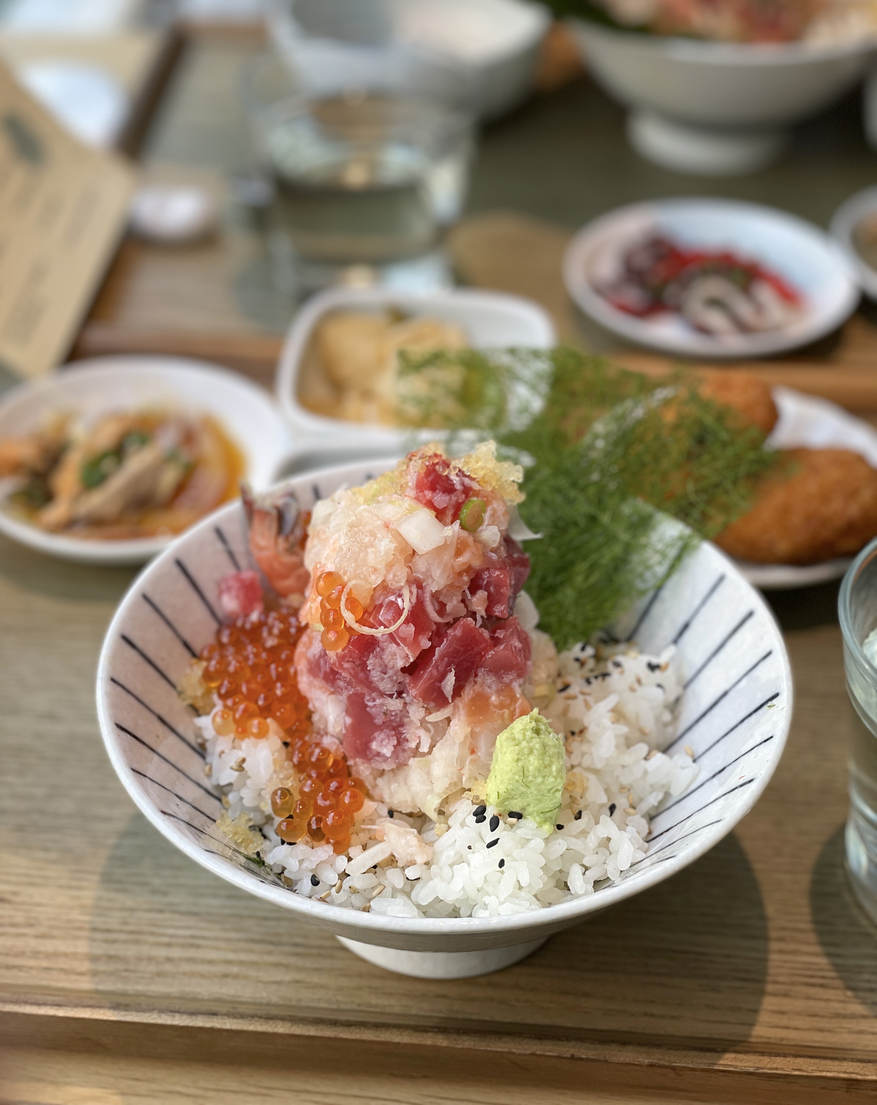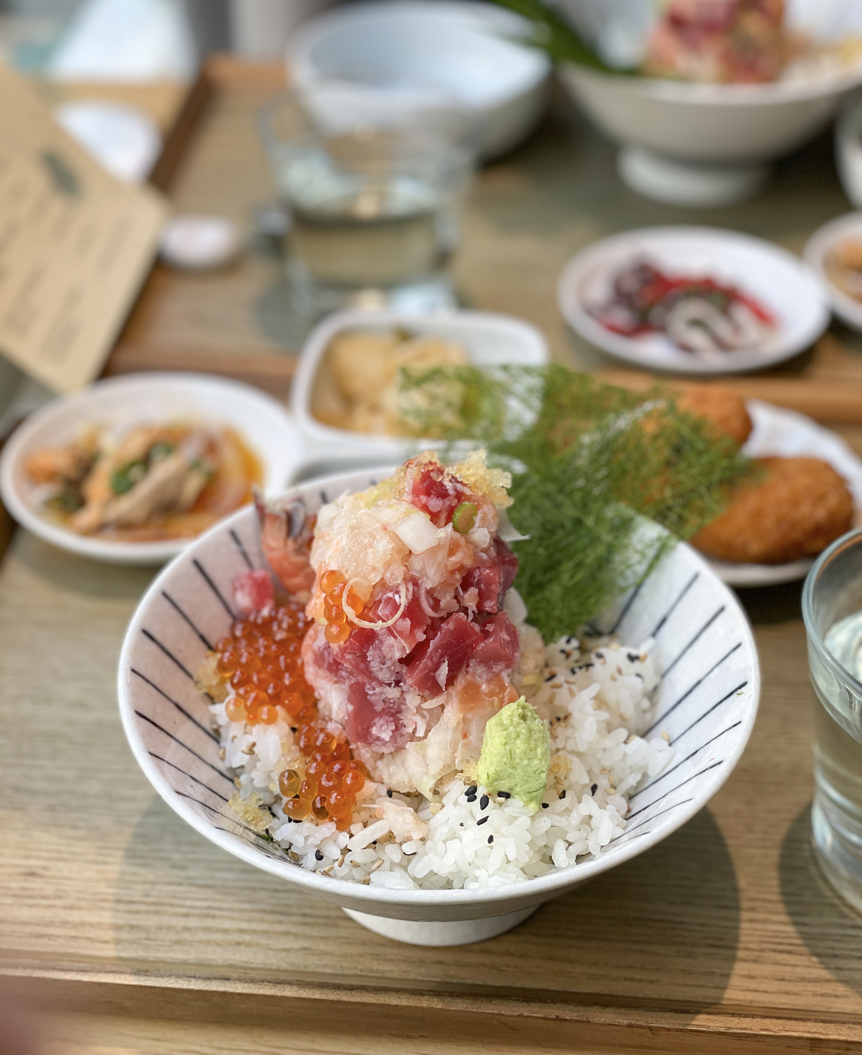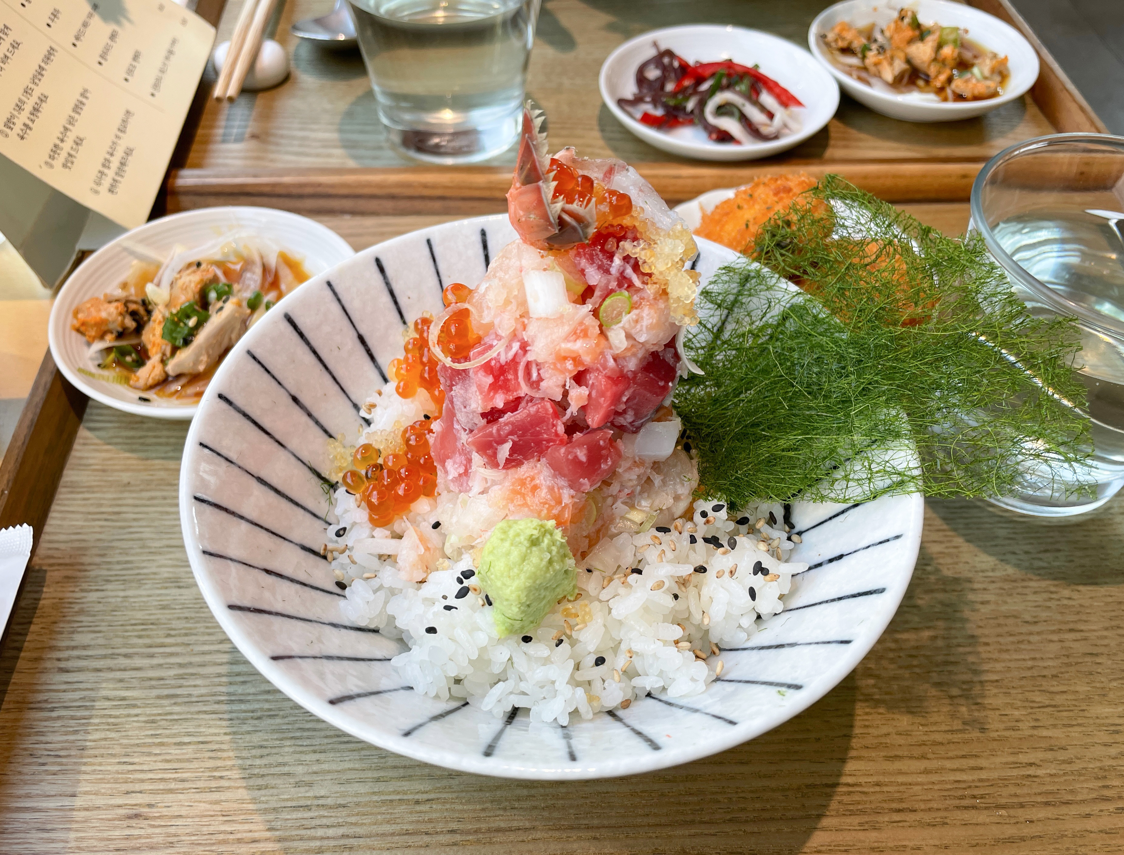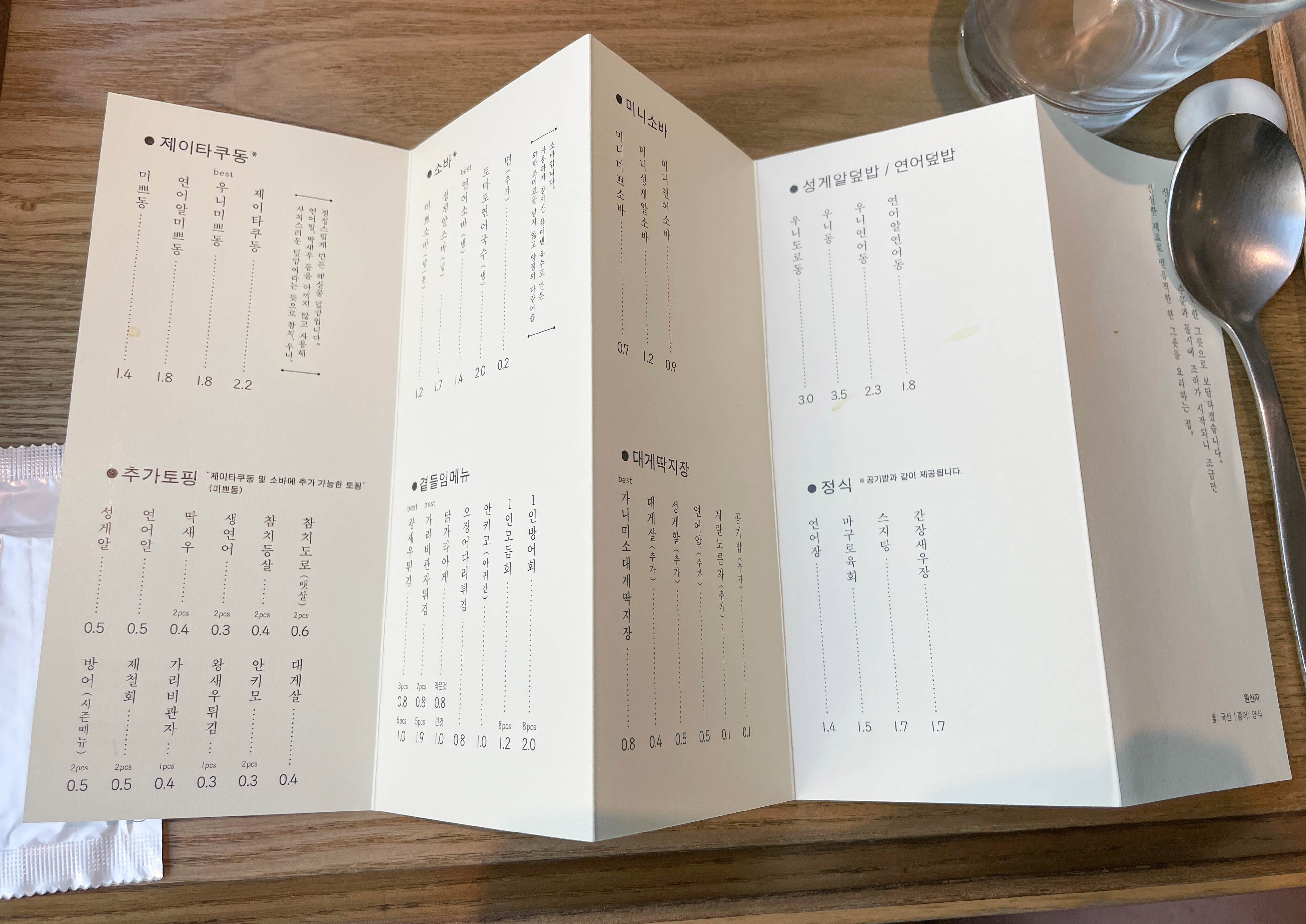 메뉴의 구성은 제이타쿠동/소바/성게알덮밥・연어덮밥/정식/대게딱지장/숙성회・제철회 등이 있었습니다. 메뉴판은 그림과 함께 메뉴에 대한 설명이 추가되어 있어서 주문하기 편리했습니다. 저희는 '우니미쁘동'과 '연어알미쁘동' 그리고 인스타그램 이벤트로 받은 '우니크림고로케'를 먹었습니다.