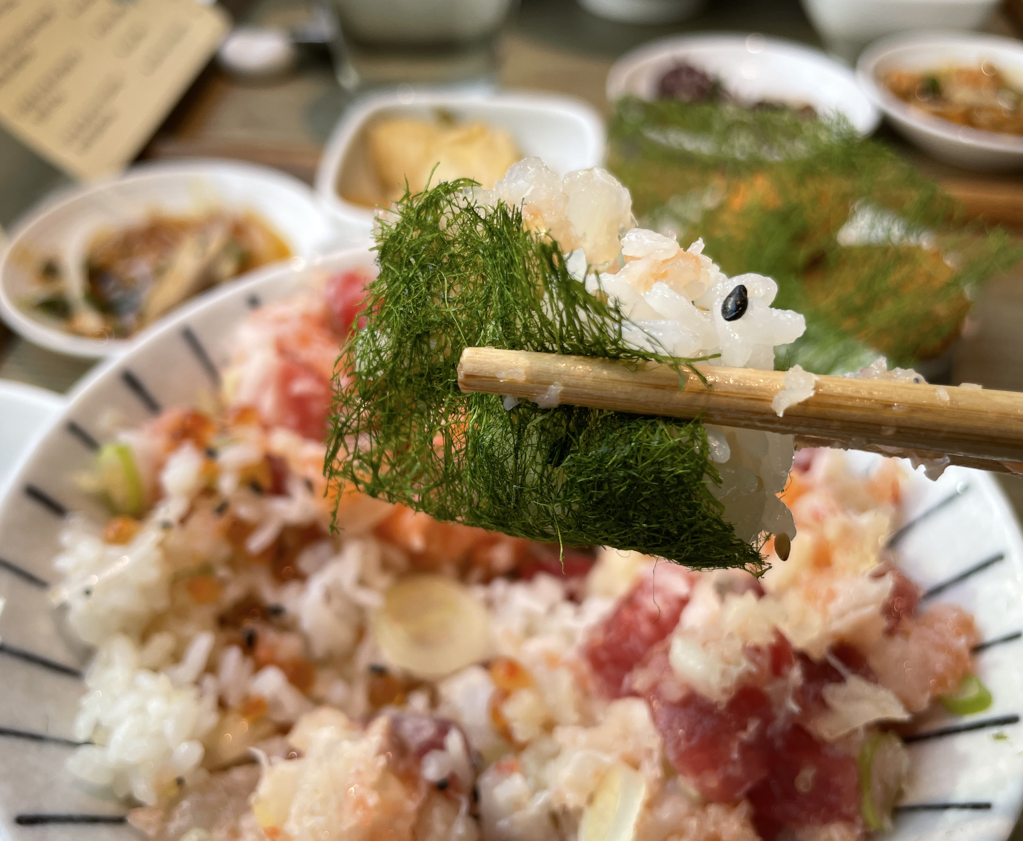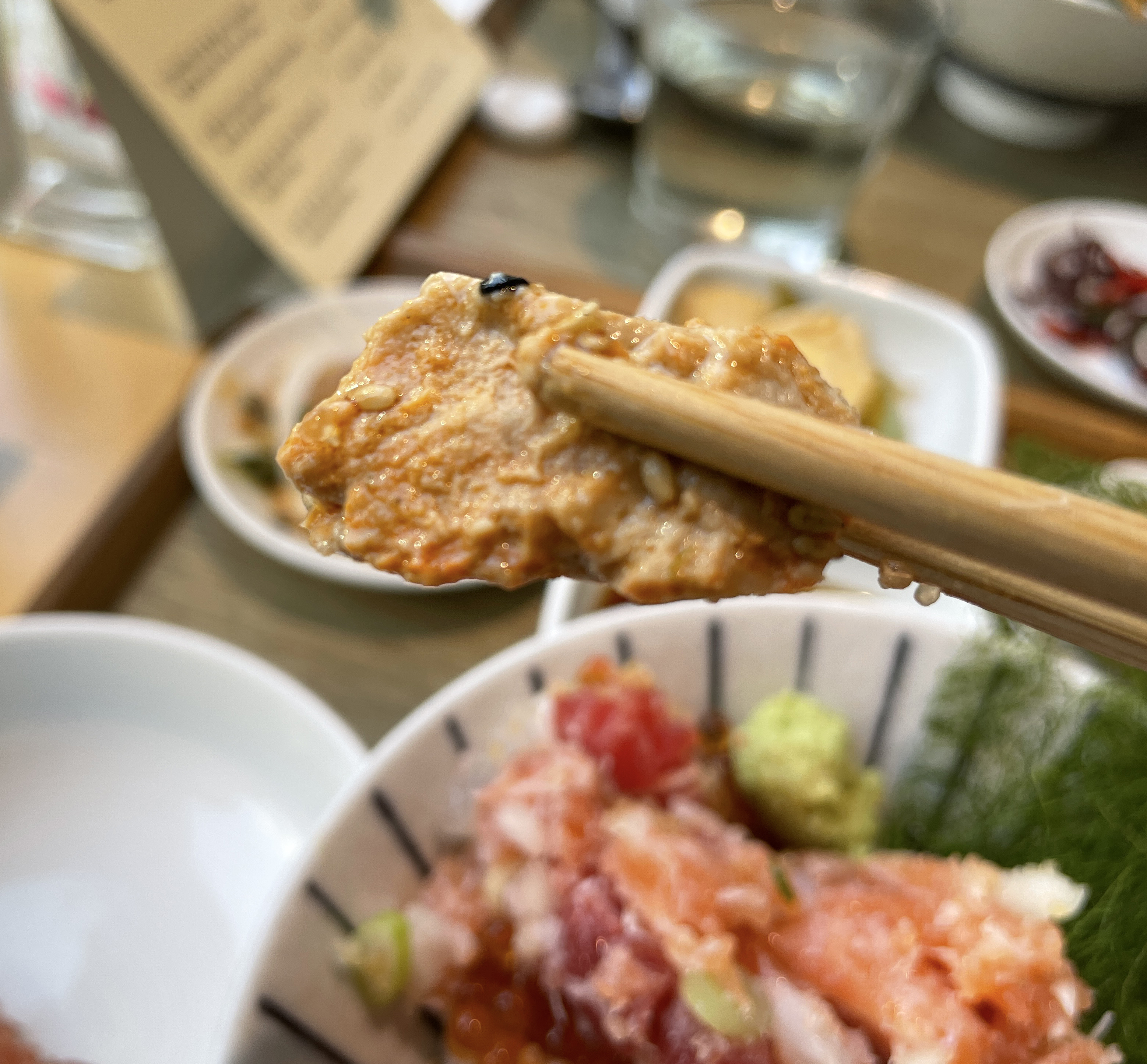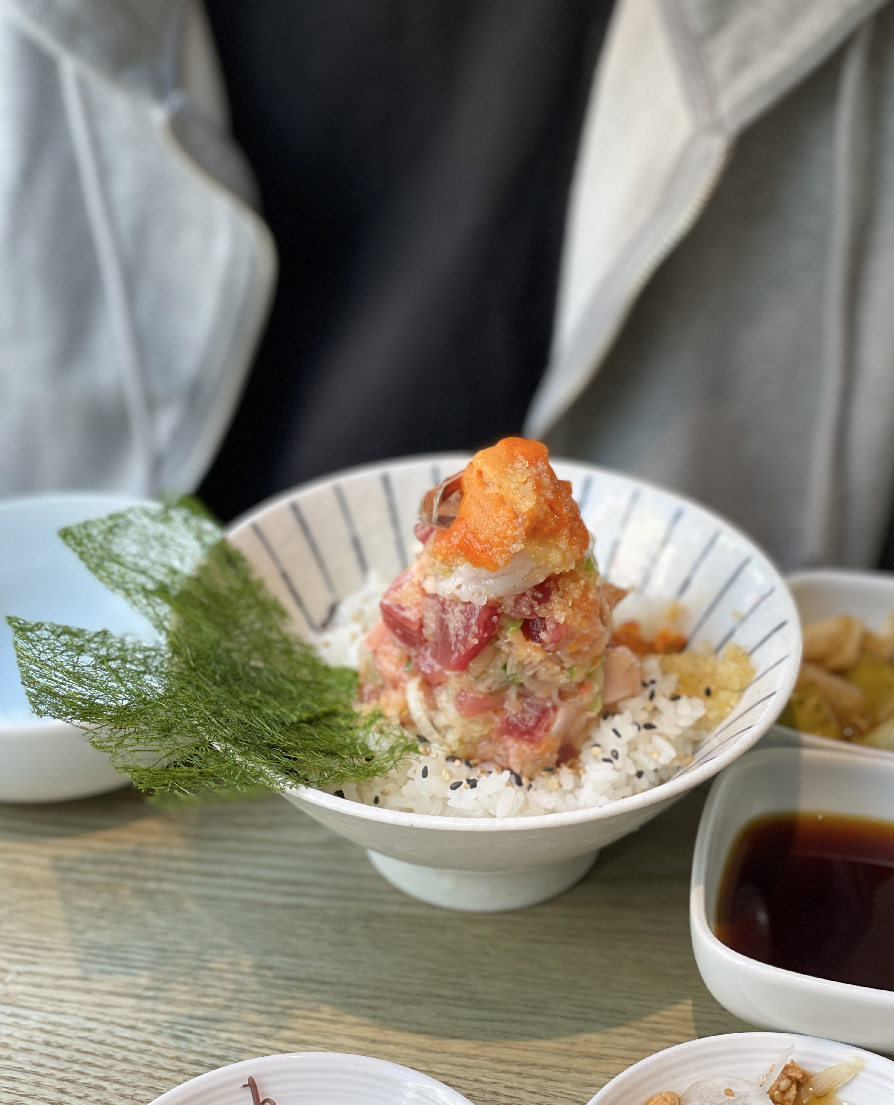 이제 본격적으로 제가 식사한 연어알미쁘동의 리뷰를 시작해보겠습니다. 밥에 적당히 간이 배어있지만, 추가로 와사비를 푼 간장을 덮밥 위에 뿌려 먹을 수 있었고, 감태 김에 싸서 먹는 것도 괜찮았습니다. 밥을 어느 정도 먹었을 때 직원에게 육수를 부어달라고 하면 육수를 가져다줍니다.