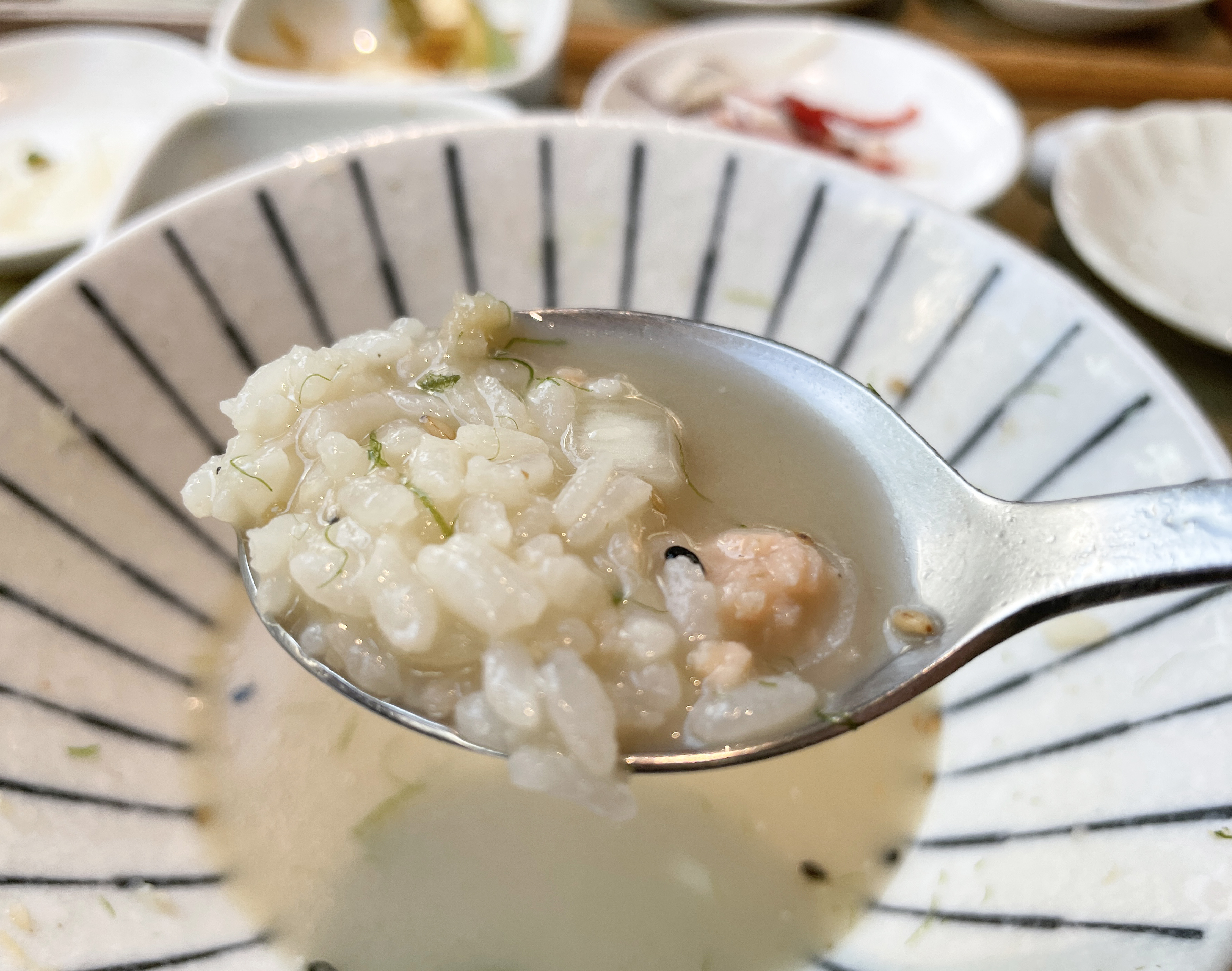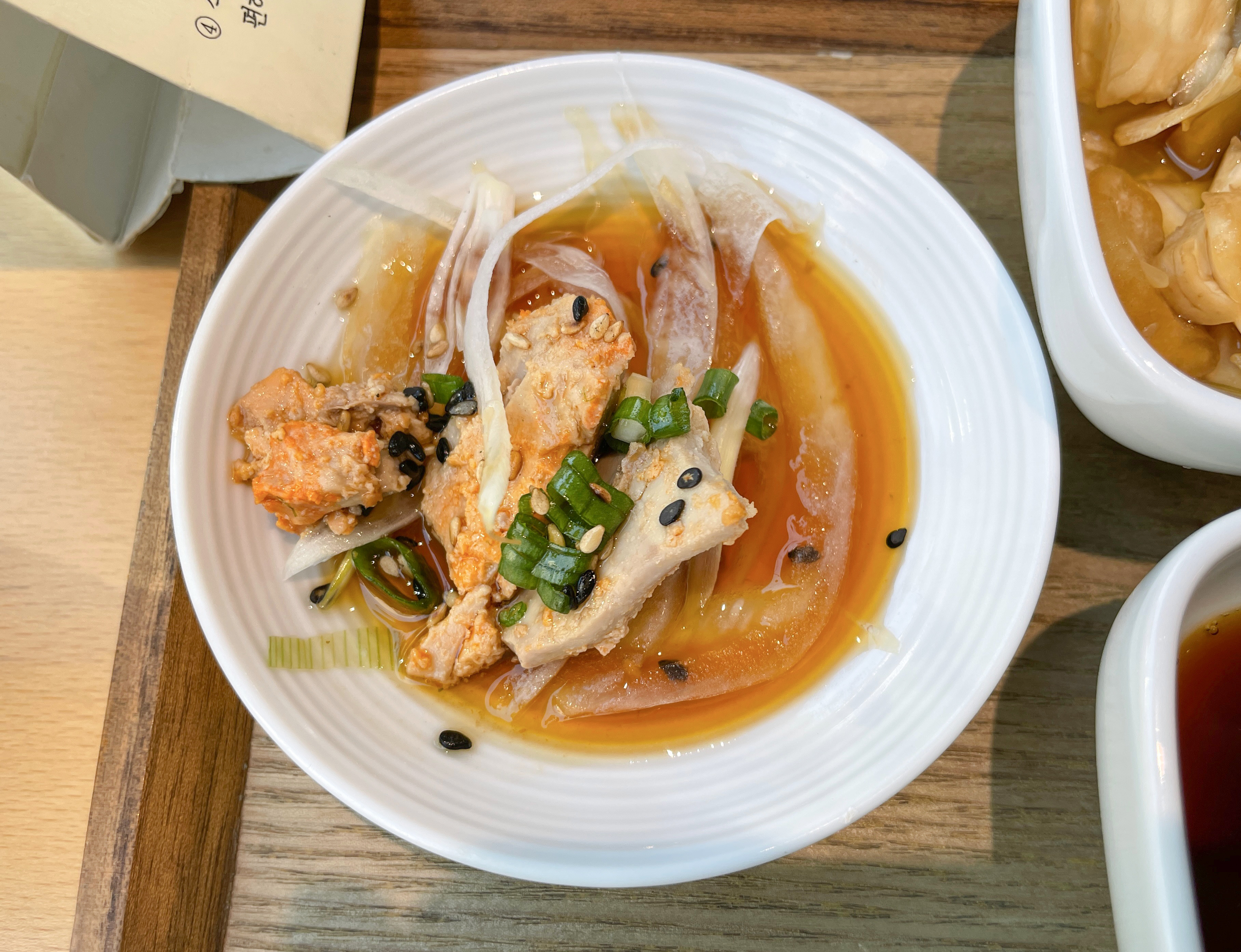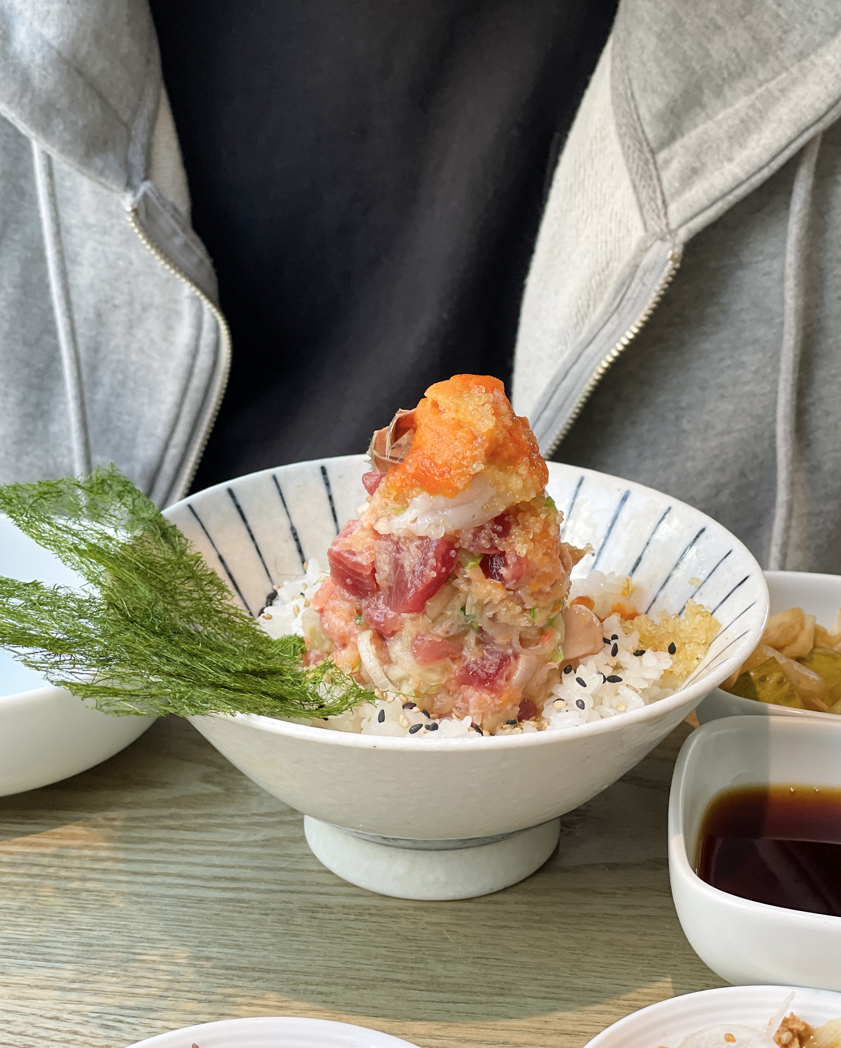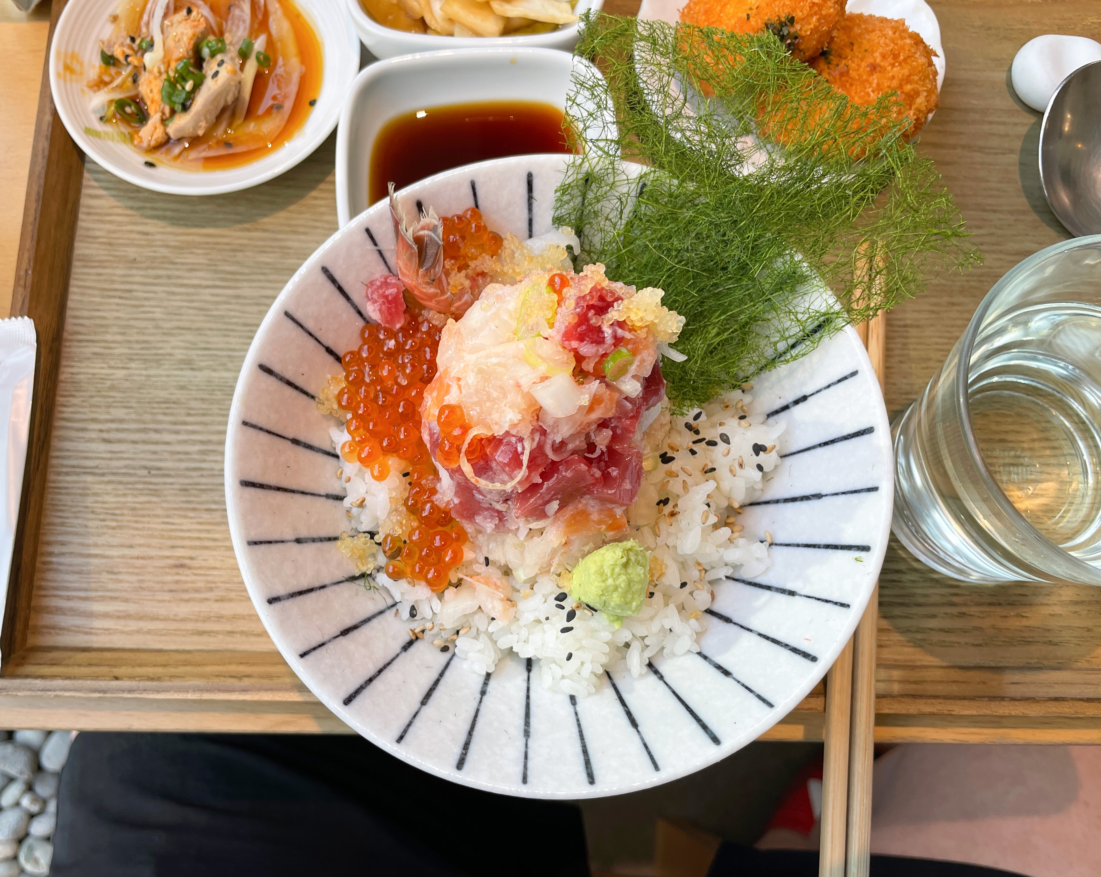 이제 본격적으로 제가 식사한 연어알미쁘동의 리뷰를 시작해보겠습니다. 밥에 적당히 간이 배어있지만, 추가로 와사비를 푼 간장을 덮밥 위에 뿌려 먹을 수 있었고, 감태 김에 싸서 먹는 것도 괜찮았습니다. 밥을 어느 정도 먹었을 때 직원에게 육수를 부어달라고 하면 육수를 가져다줍니다.