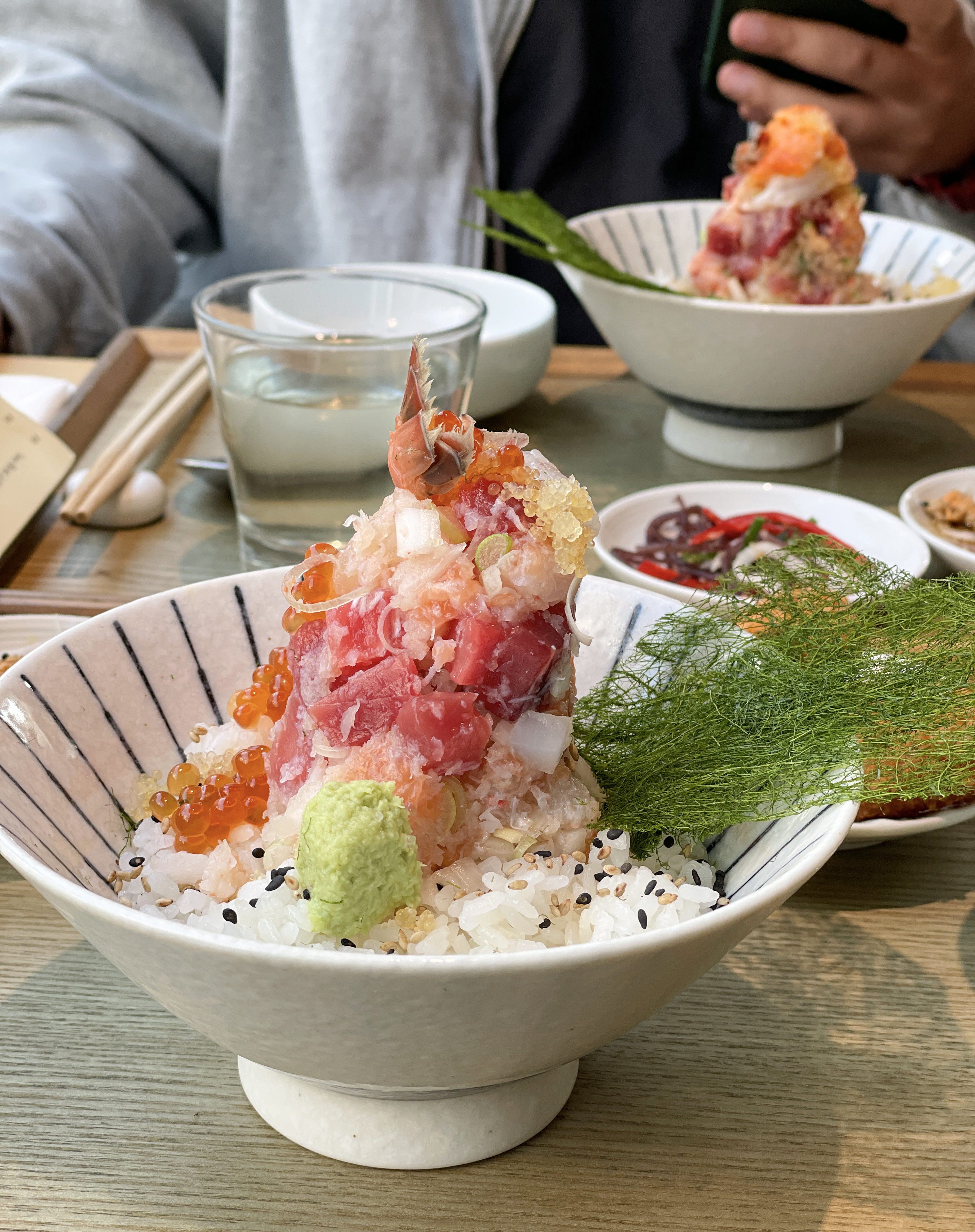 곧이어 주문한 연어알미쁘동과 우니미쁘동이 나왔습니다. 연어알미쁘동은 아까미, 연어뱃살, 새우, 오징어, 딱새우, 도로, 관자, 연어등살, 연어알, 광어, 날치알, 대게살 등에 이꾸라(연어알)를 추가로 얹어서 나오는 메뉴라고 합니다.