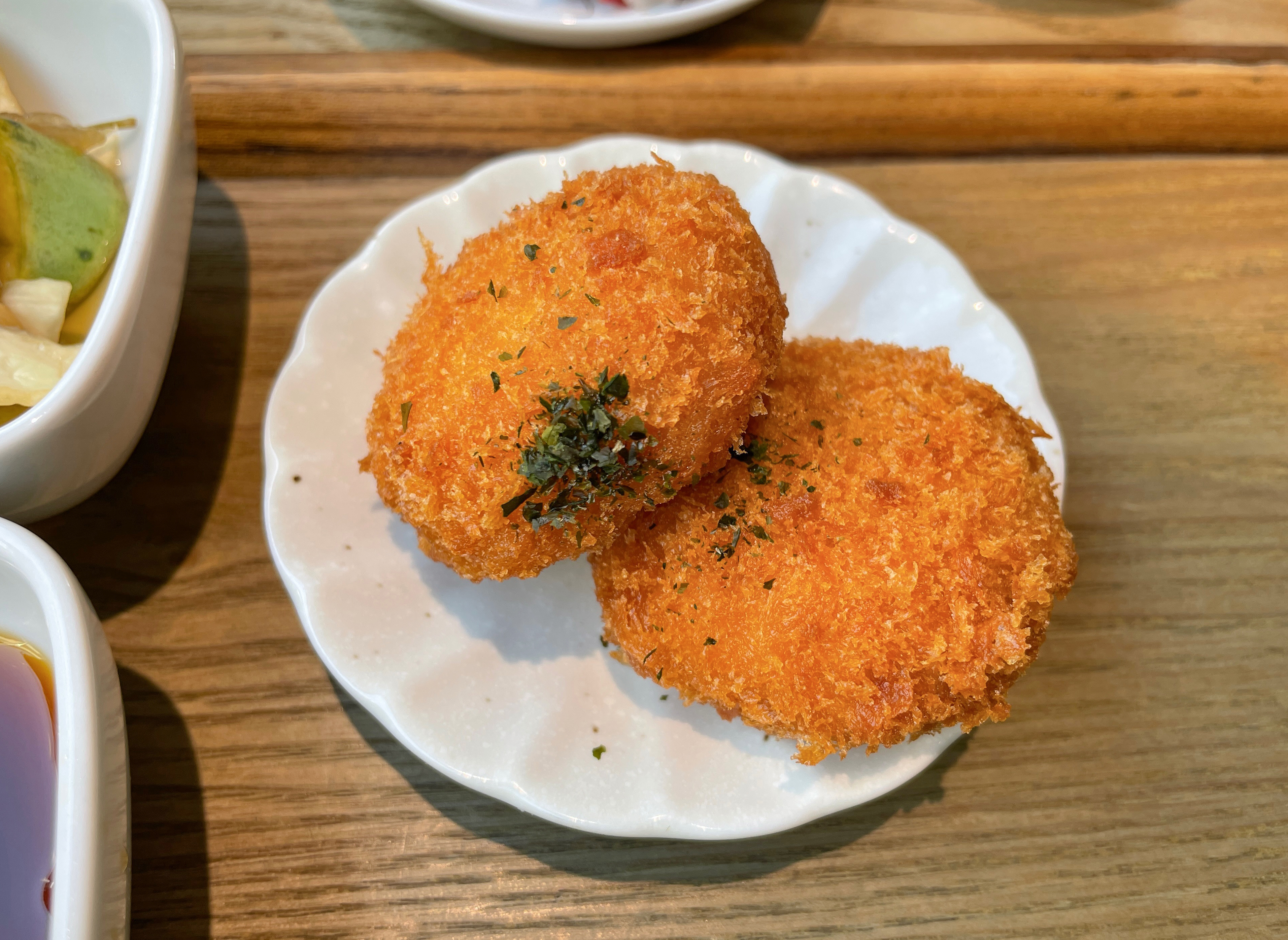 각각의 메뉴에는 반찬으로 아귀 간과 양배추피클, 꼬시래기 무침도 나왔습니다. 아귀 간은 맛에 대해 별로 기대를 안 했는데, 생각보다 맛이 좋았습니다. 생선조림 비슷한 느낌이랄까요? 우니크림고로케는 부드러운 식감이 일품이었습니다. 입 안에서 녹아내리는 성게알크림 고로케는 간도 세지 않고 맛있어서 인스타그램 이벤트에 참여하길 잘했다고 생각이 들더라고요.