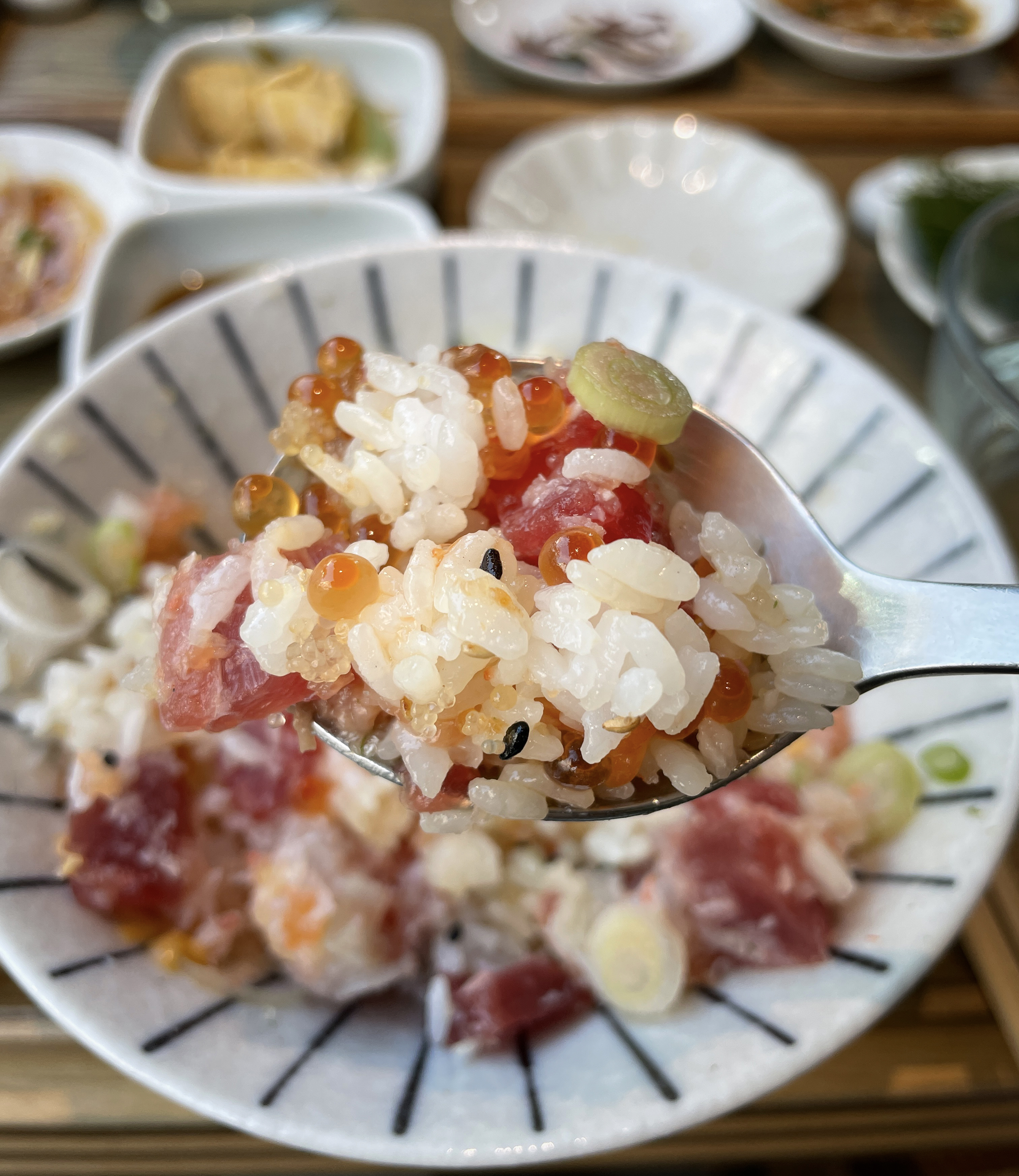곧이어 주문한 연어알미쁘동과 우니미쁘동이 나왔습니다. 연어알미쁘동은 아까미, 연어뱃살, 새우, 오징어, 딱새우, 도로, 관자, 연어등살, 연어알, 광어, 날치알, 대게살 등에 이꾸라(연어알)를 추가로 얹어서 나오는 메뉴라고 합니다.